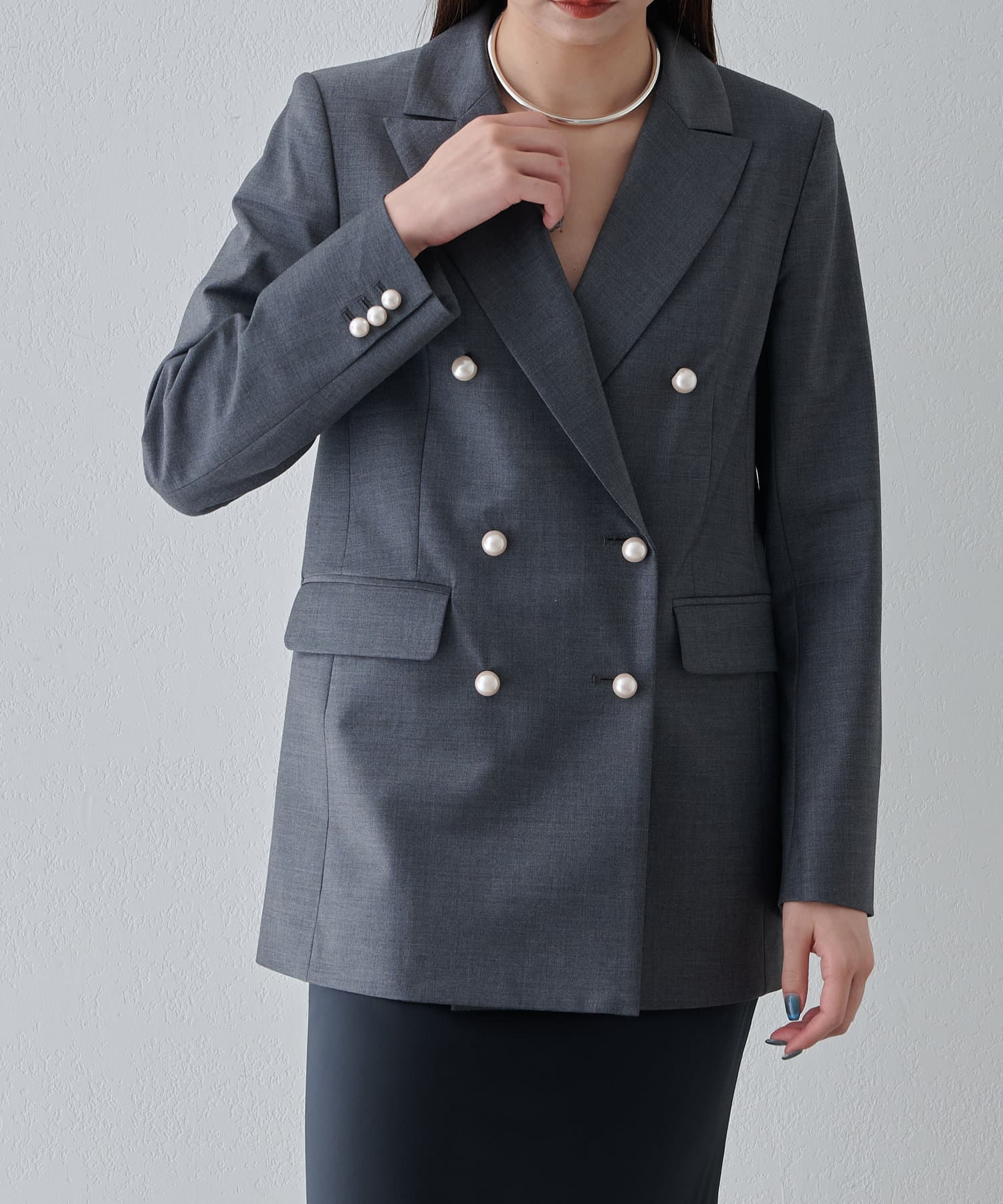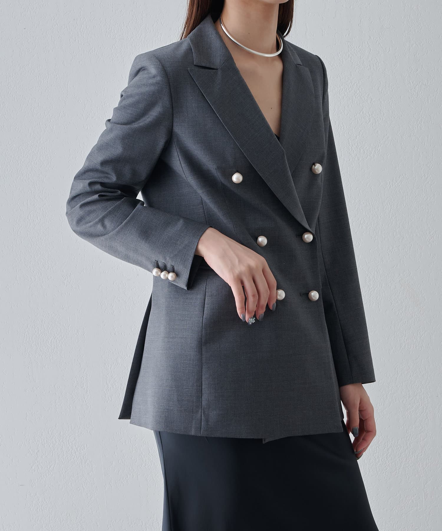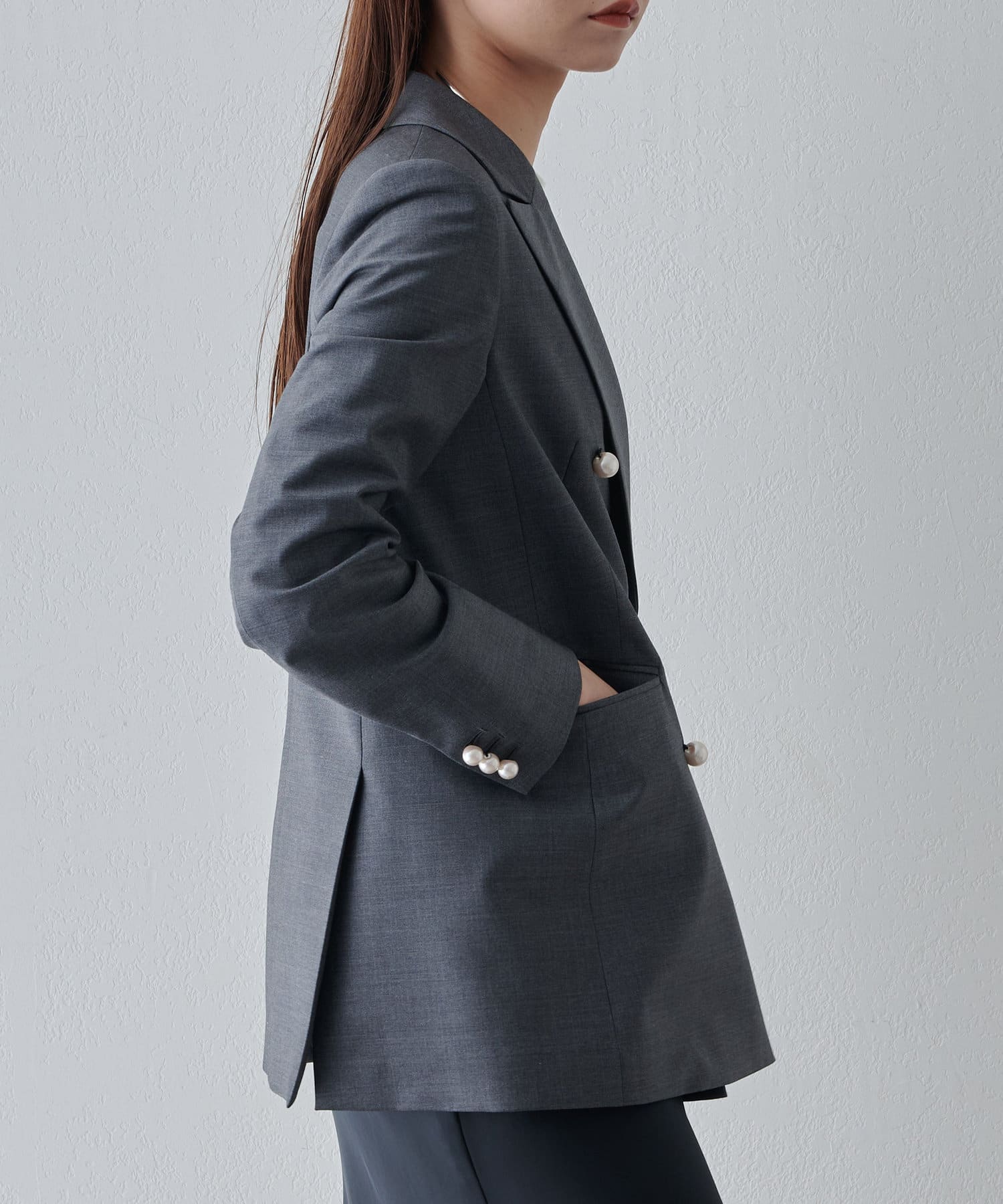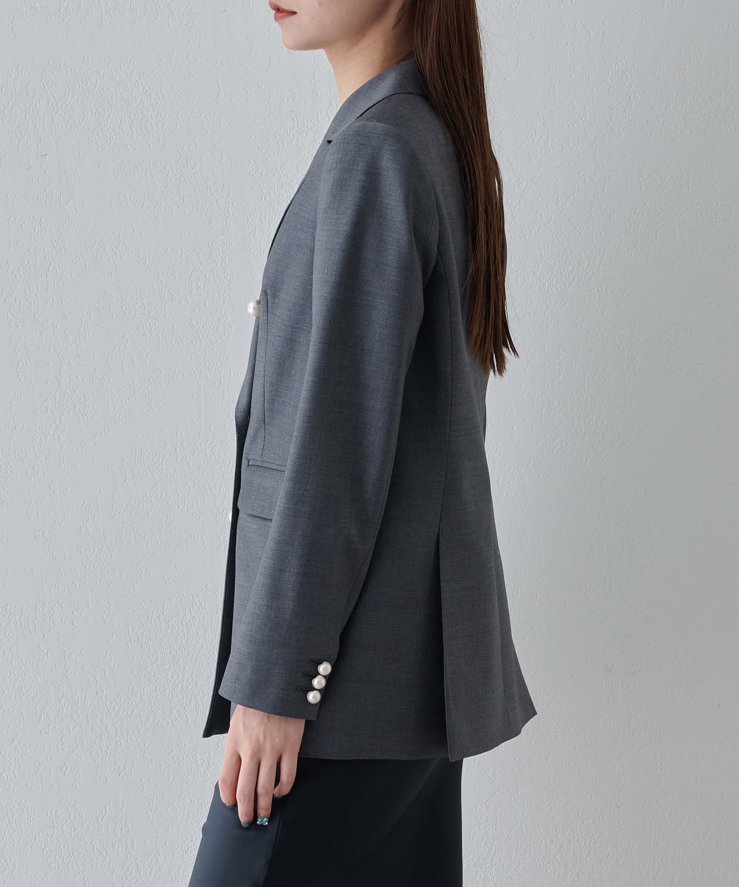 ■女性らしい印象を与えてくれるパールボタンがジャケットの良さを引き立て、落ち着いた印象をプラス。