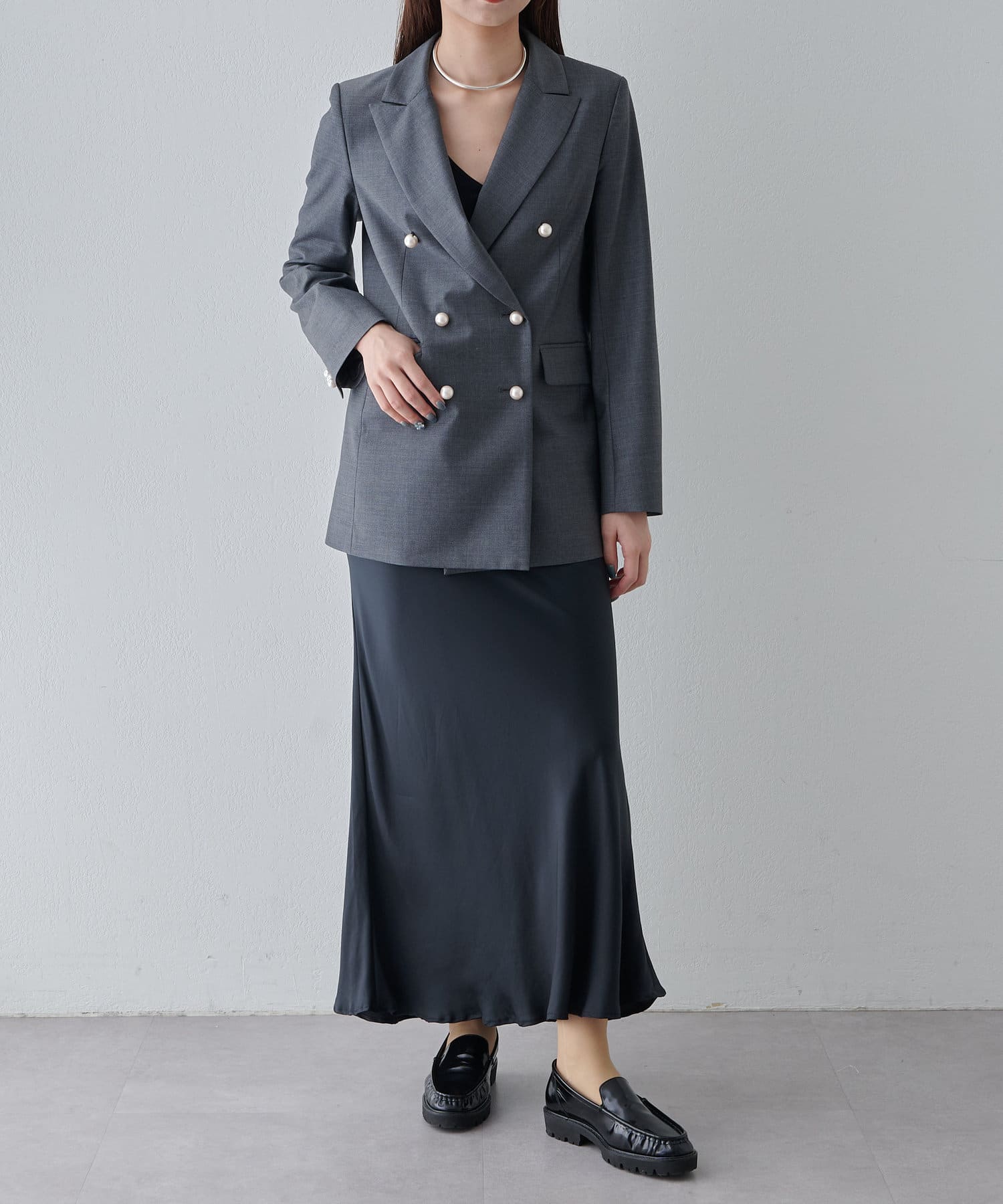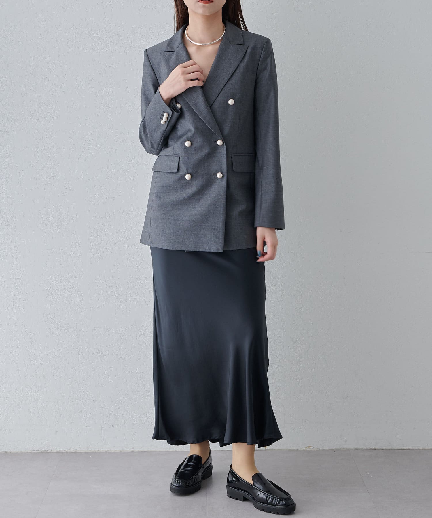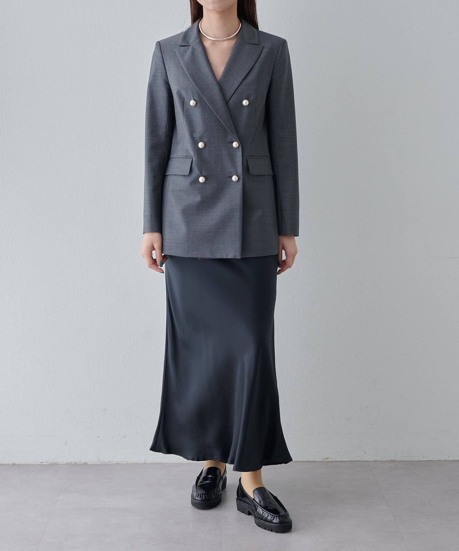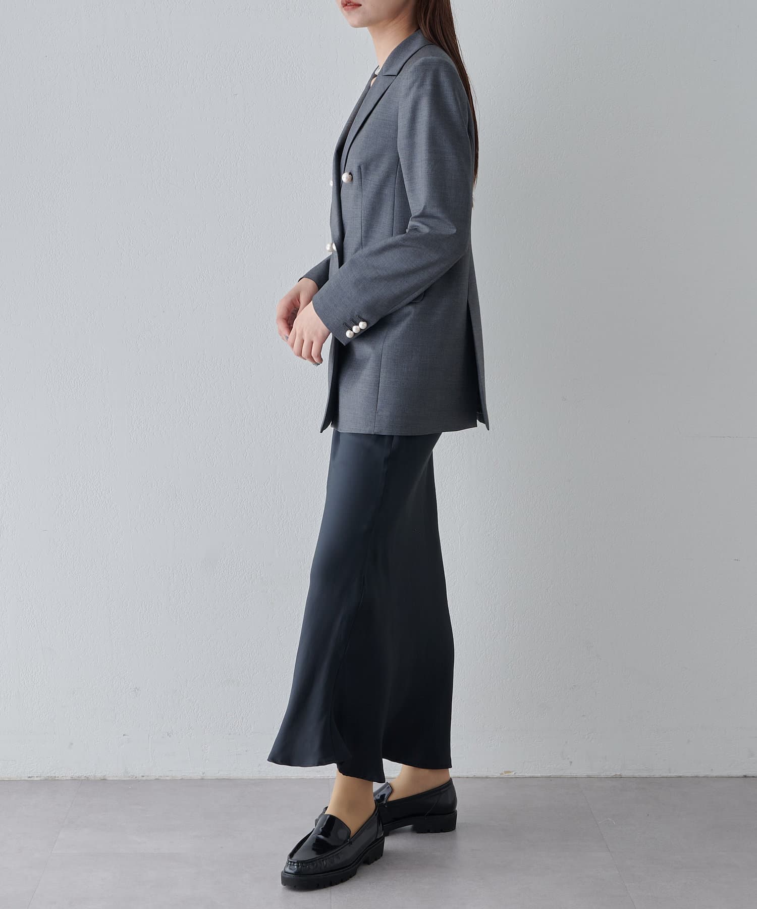 ■女性らしい印象を与えてくれるパールボタンがジャケットの良さを引き立て、落ち着いた印象をプラス。