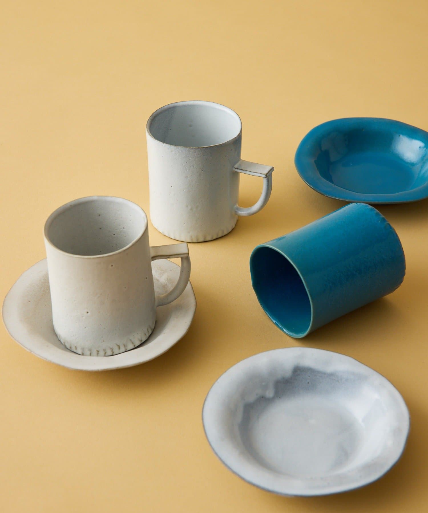 空間の主役となるピッチャーやリム皿などトルコブルー、ホワイト、を中心に豊富に揃います。