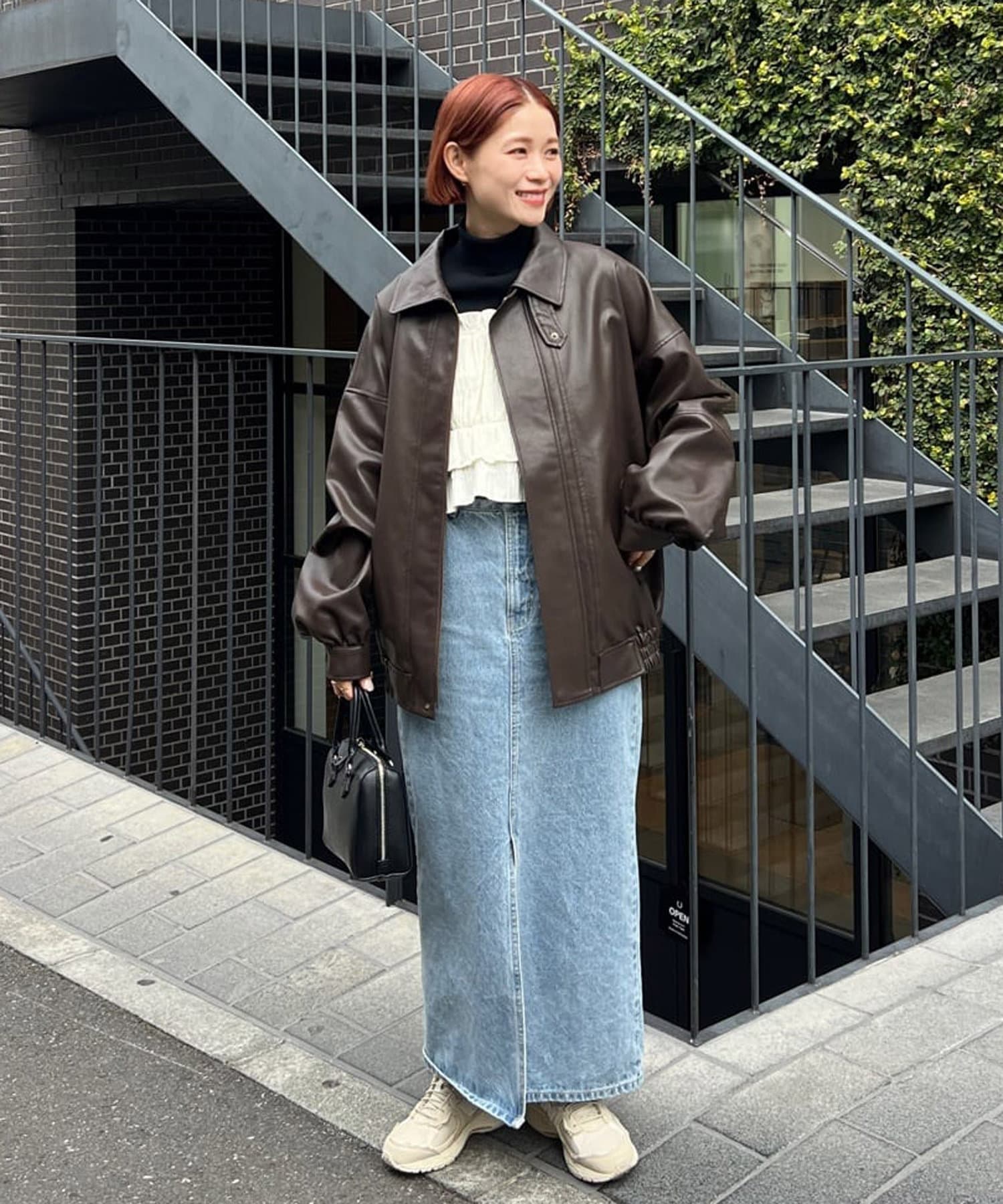 購入場所:店舗ふくよかな体型でもダボっとしているので中に着込めるのと、レザージャケットだけどブラウンなので女性らしくも着こなせるのでとてもいいです。タイトなスカートやワンピースと合わせるのがお気に入りです!