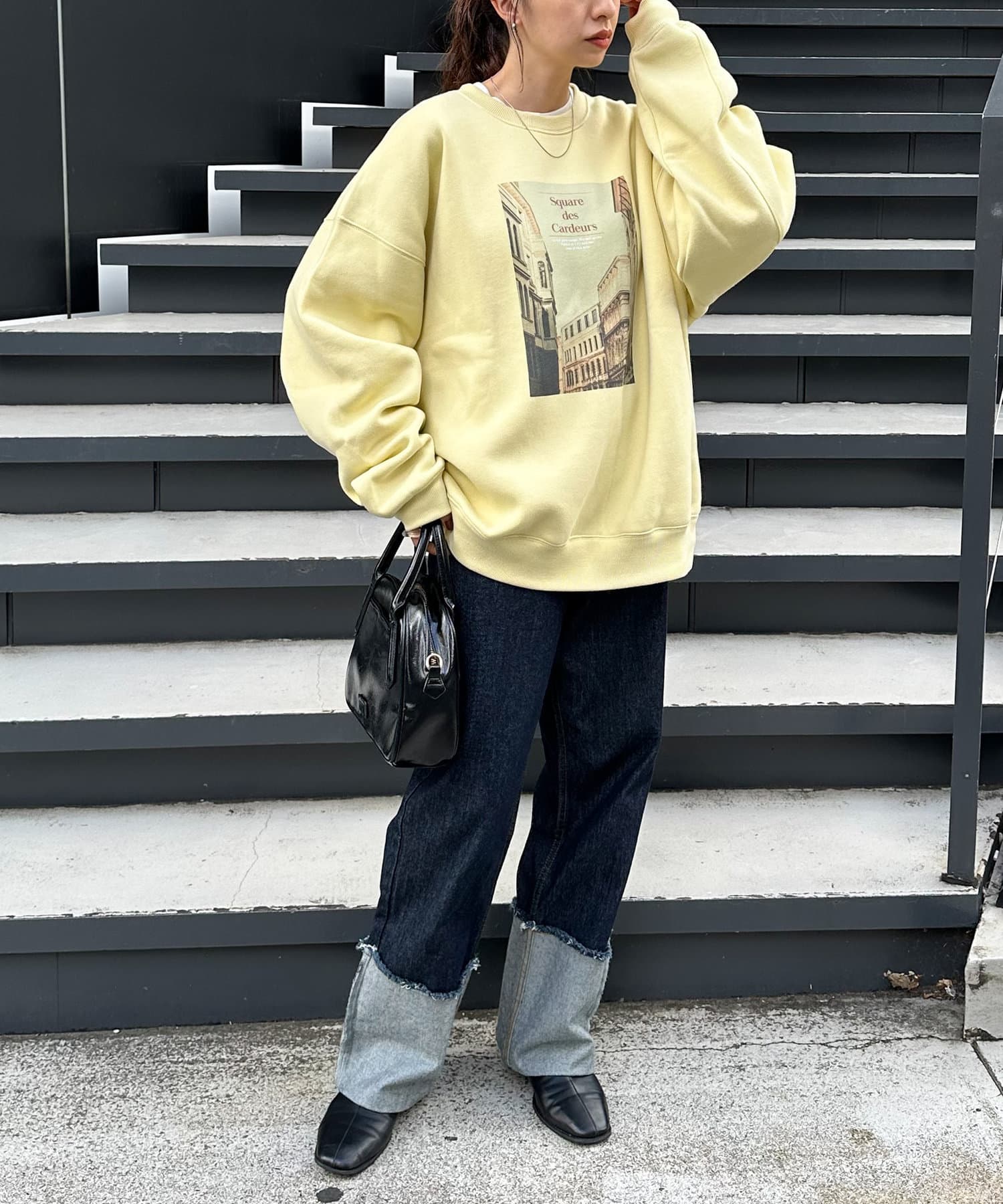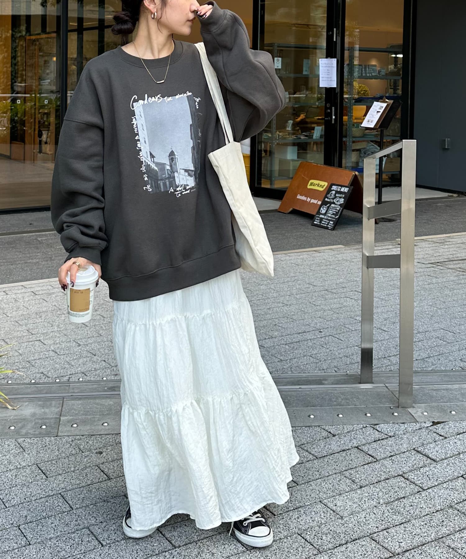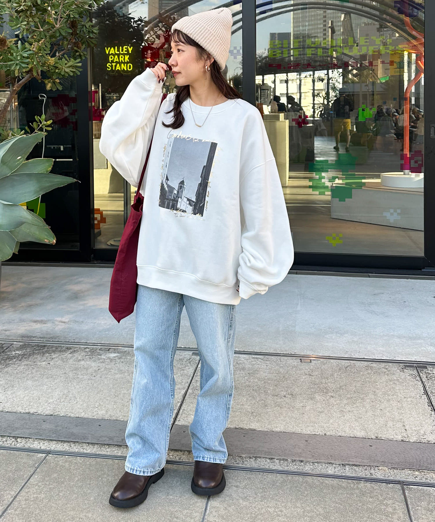 149cmスタッフ:お尻回りが隠れる丈感なので、ショートパンツと合わせても安心〇少し丸みのあるシルエットが柔らかい雰囲気になりスウェットですが、カジュアルになりすぎずコーデに取り入れやすいです!