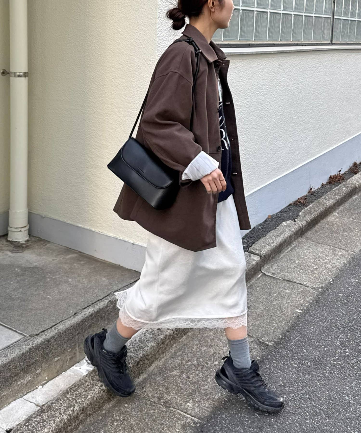 肩周り・身幅ともに余裕があり、ニットやスウェットの上からでも難なく羽織れます◎