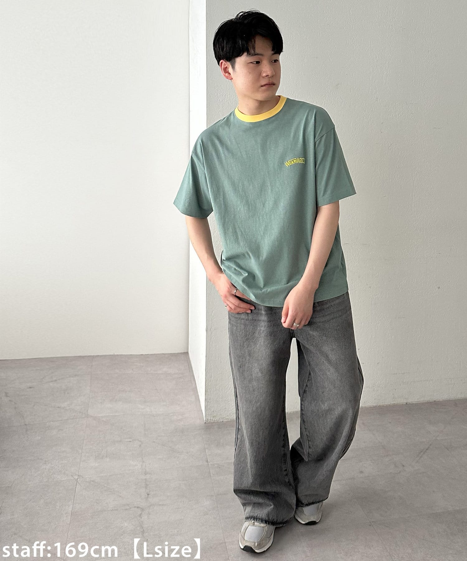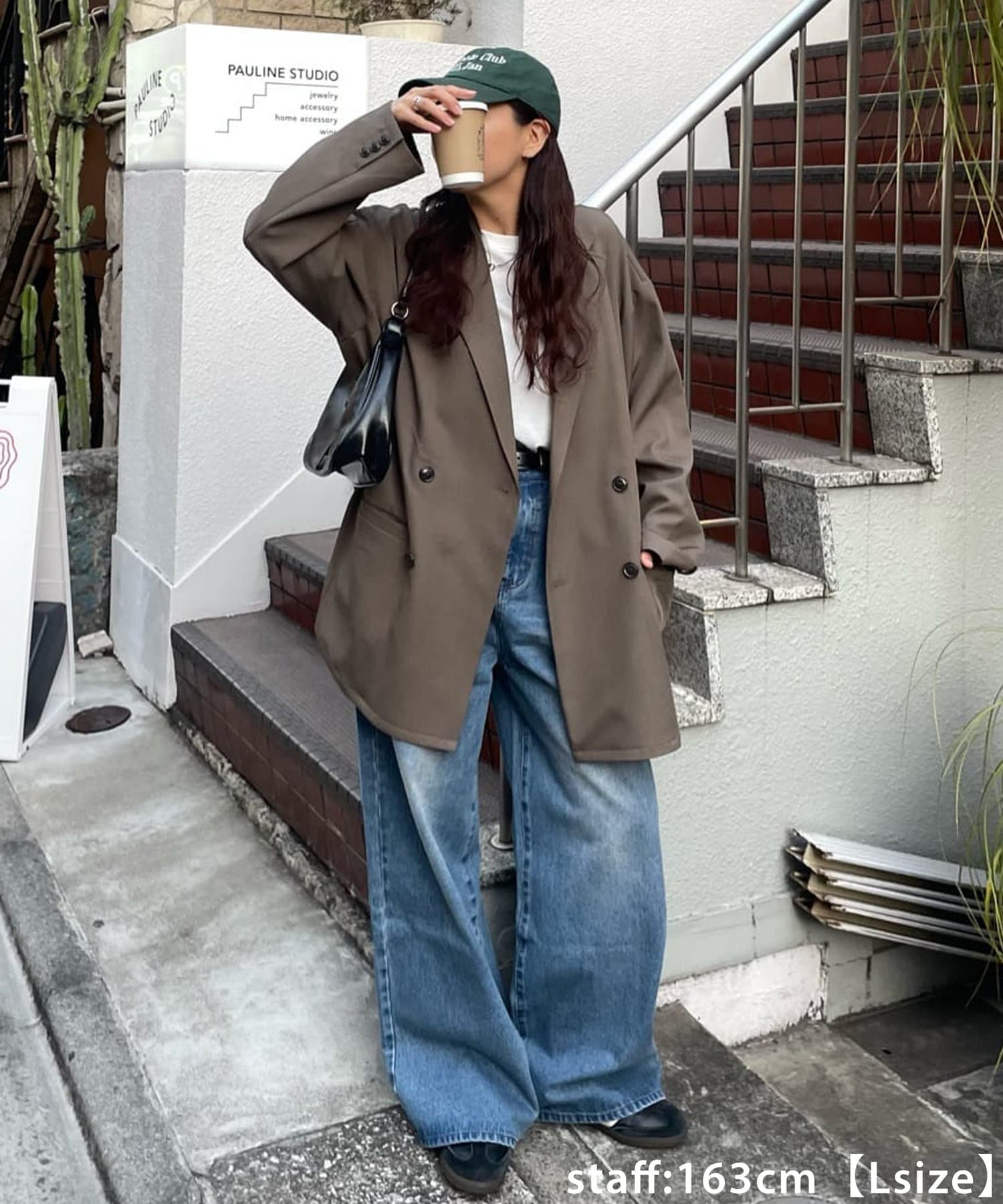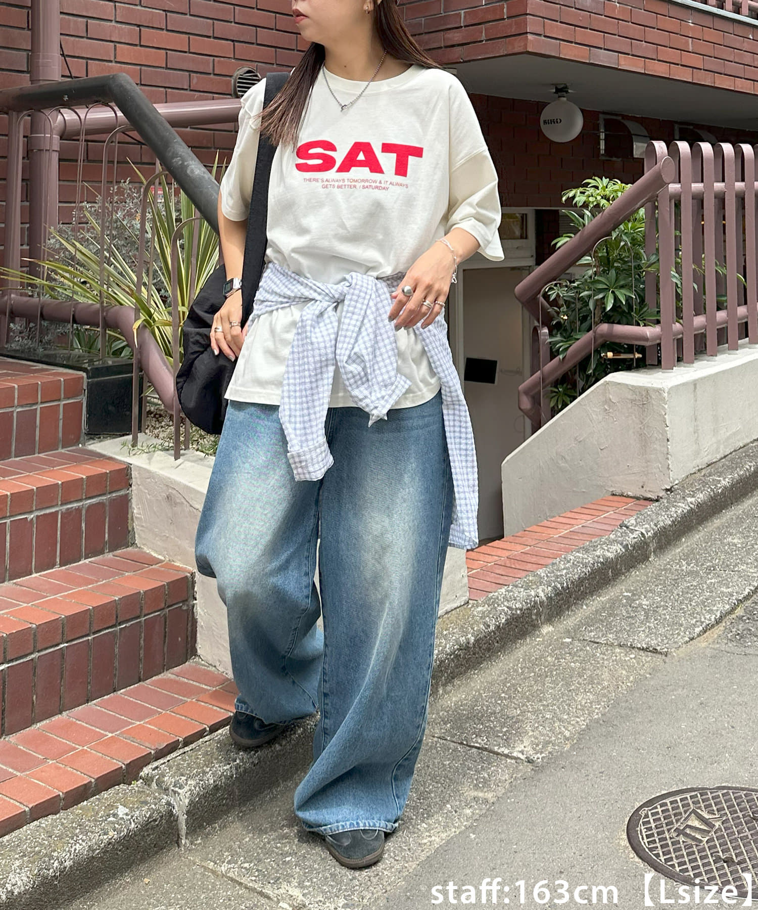 170cmスタッフ(Lサイズ着用):ゆったりめが好きな人にはLサイズがおすすめです。どんなトップスとも相性がよくたくさん着まわせます♩
