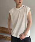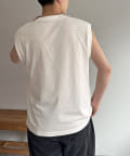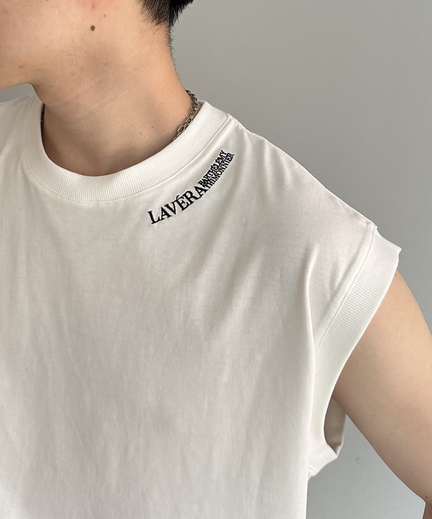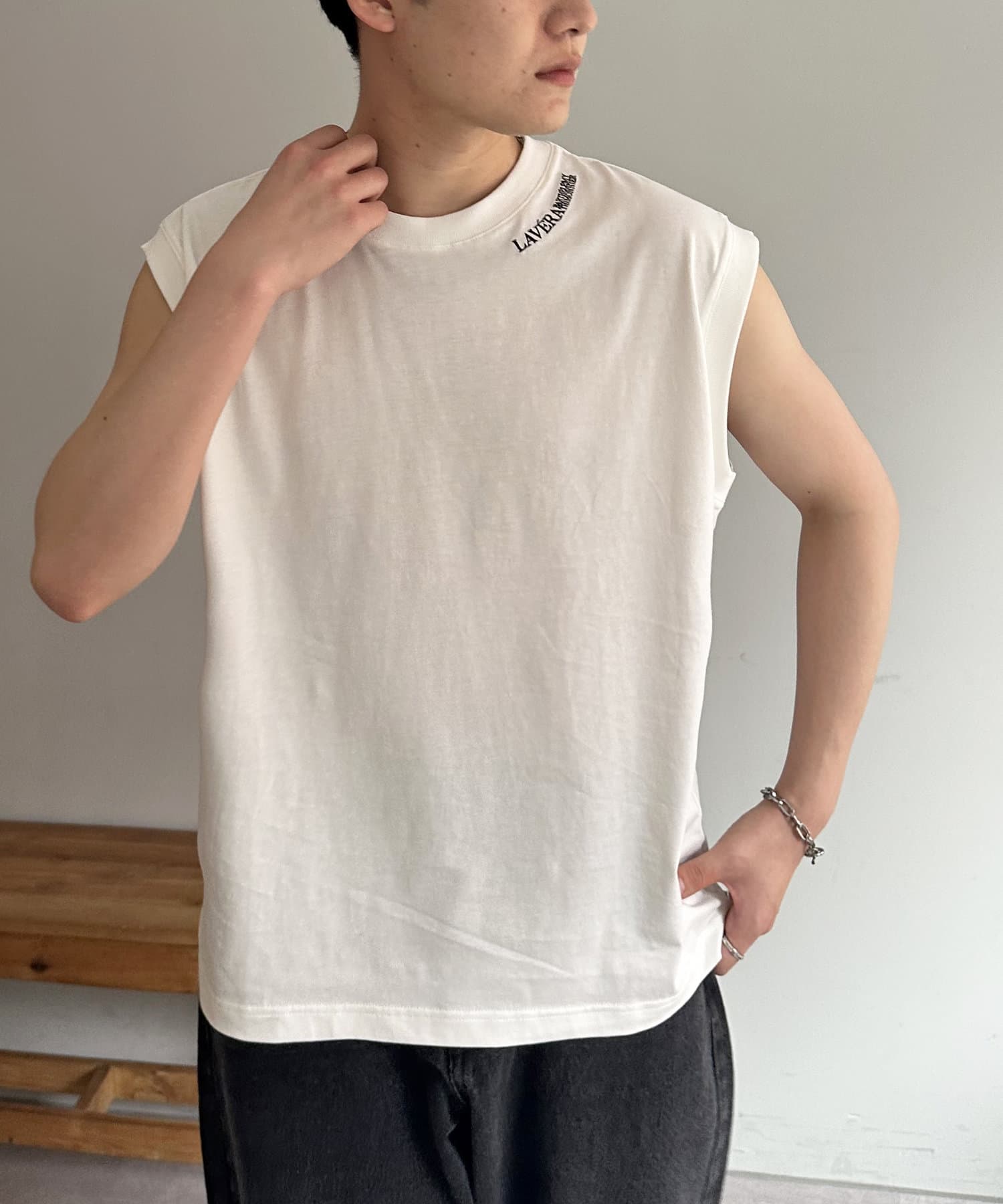首元にさりげなく施されたロゴ刺繍デザインがアクセントになった、ミニマルで洗練されたノースリーブTシャツ。