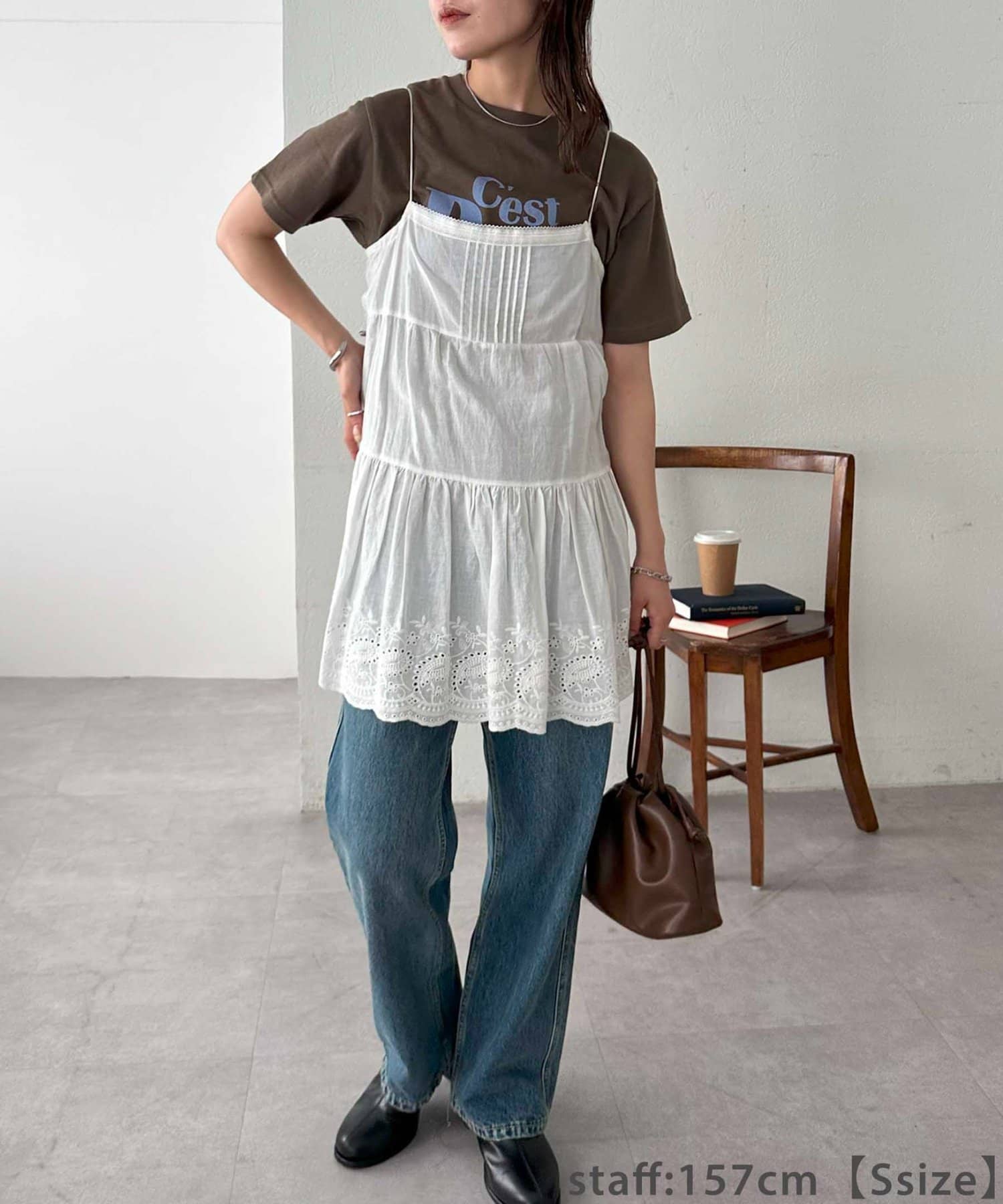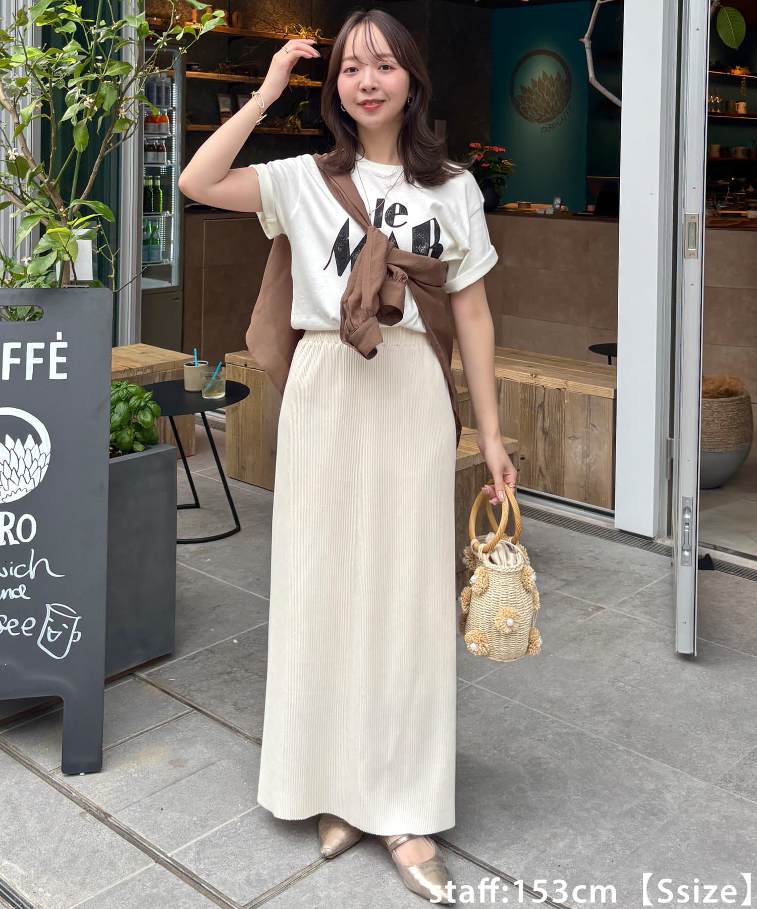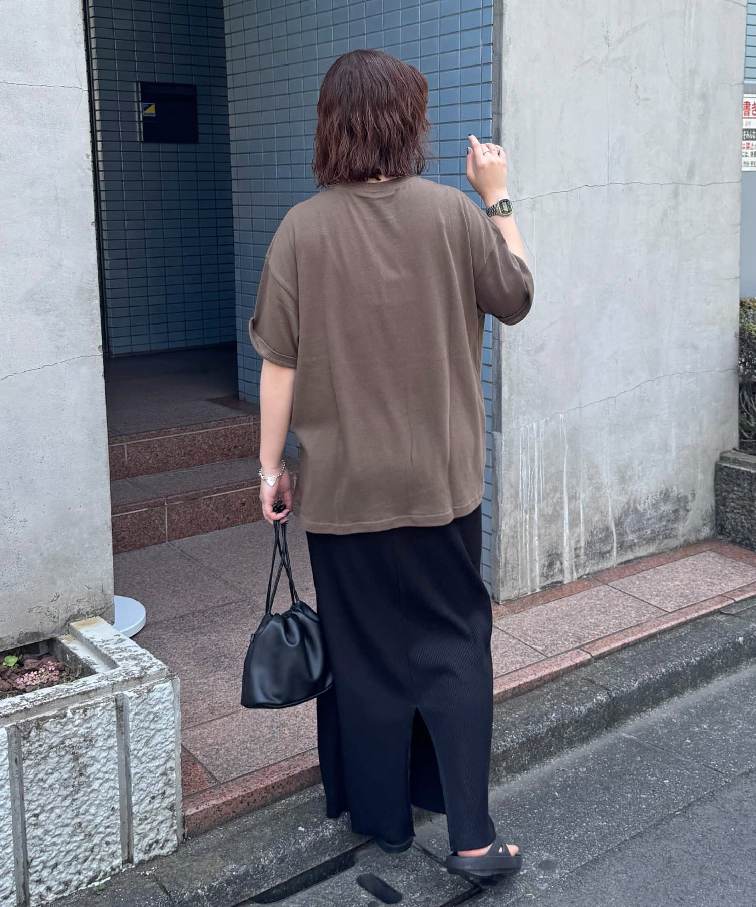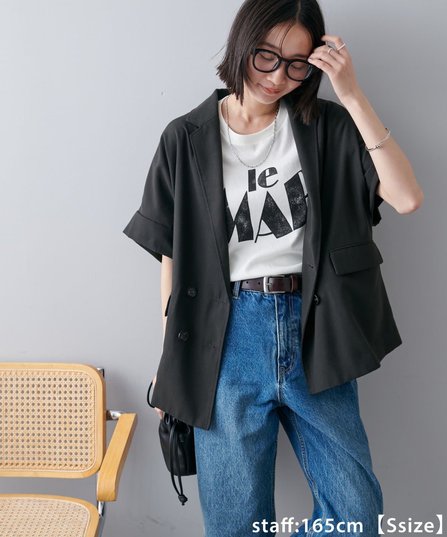 157cmレディーススタッフ(Sサイズ着用):身幅にゆとりがありつつ、すっきりとした印象。着丈はヒップの半分くらいで、イン・アウトどちらもバランスよく着られました!1枚でも重ね着でも使いやすいサイズ感です。