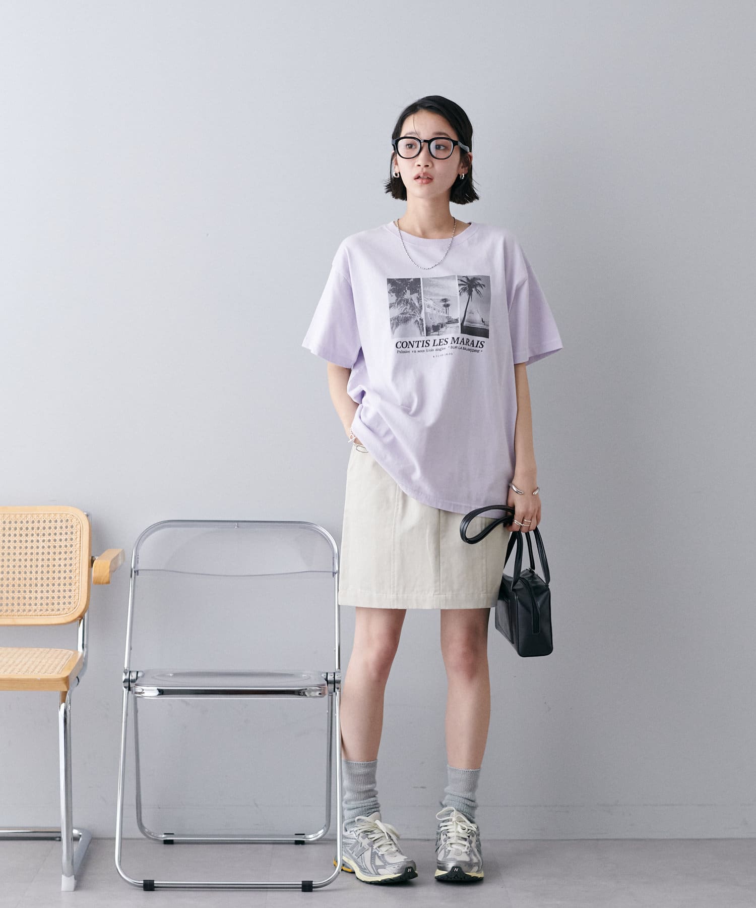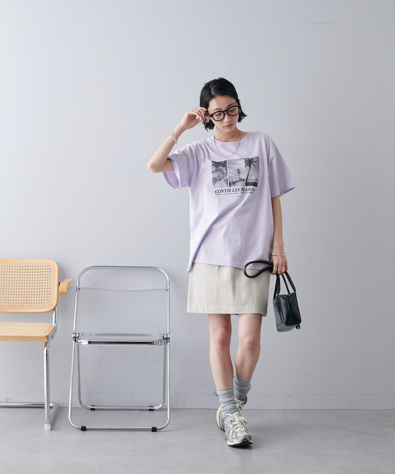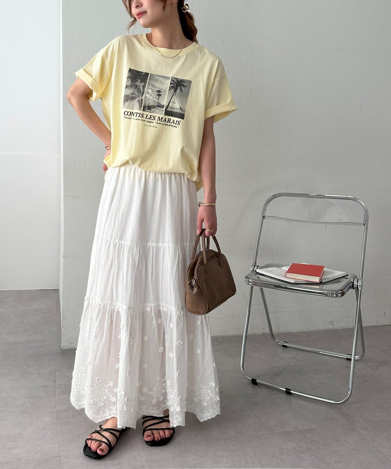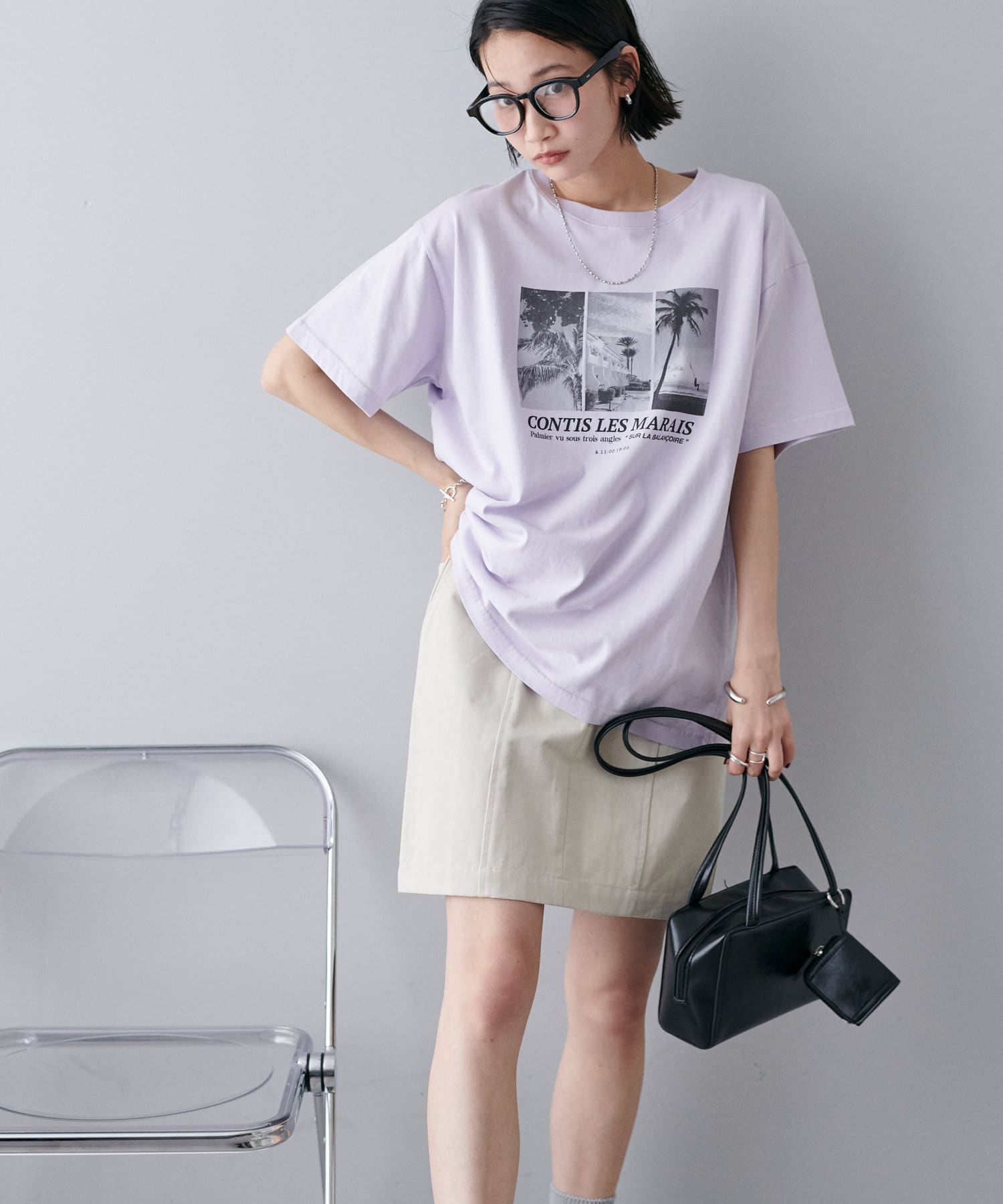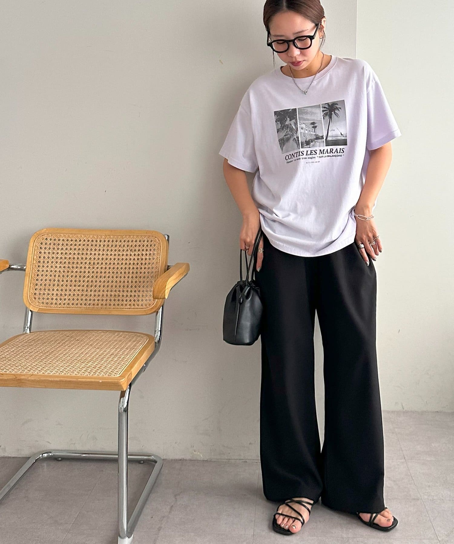 大胆なプリントでありながら、色味を抑えたモノトーンが全体を上品に引き締め、カジュアルになりすぎない絶妙なバランス感も魅力のひとつ。