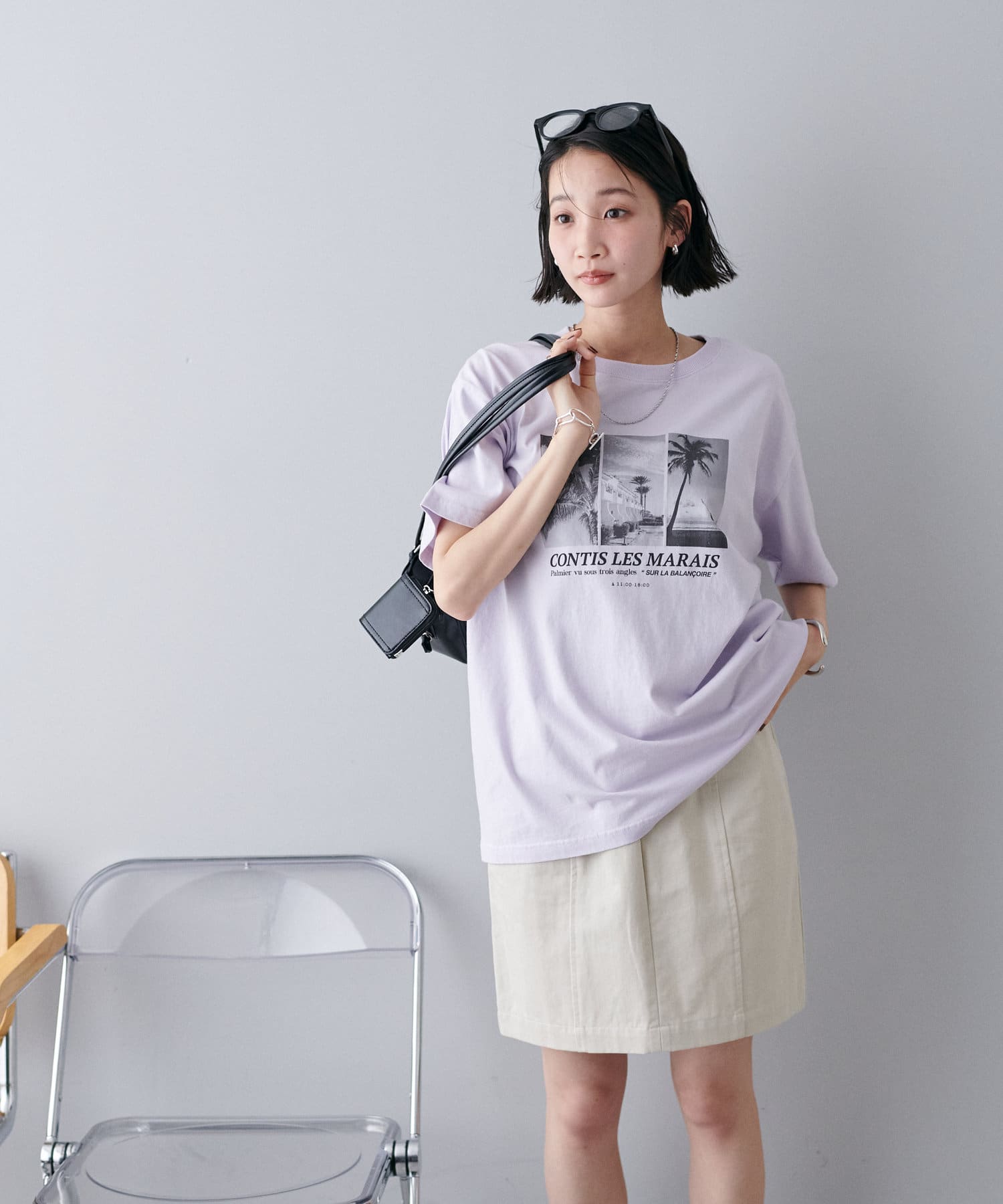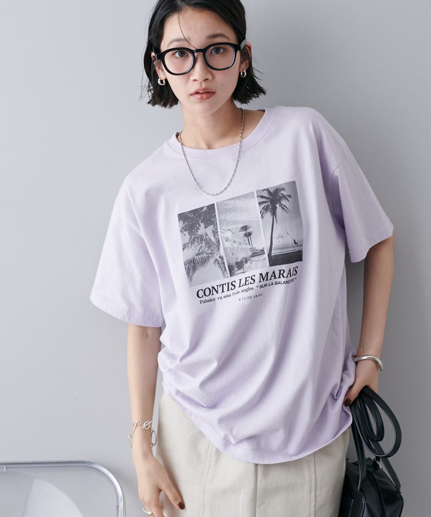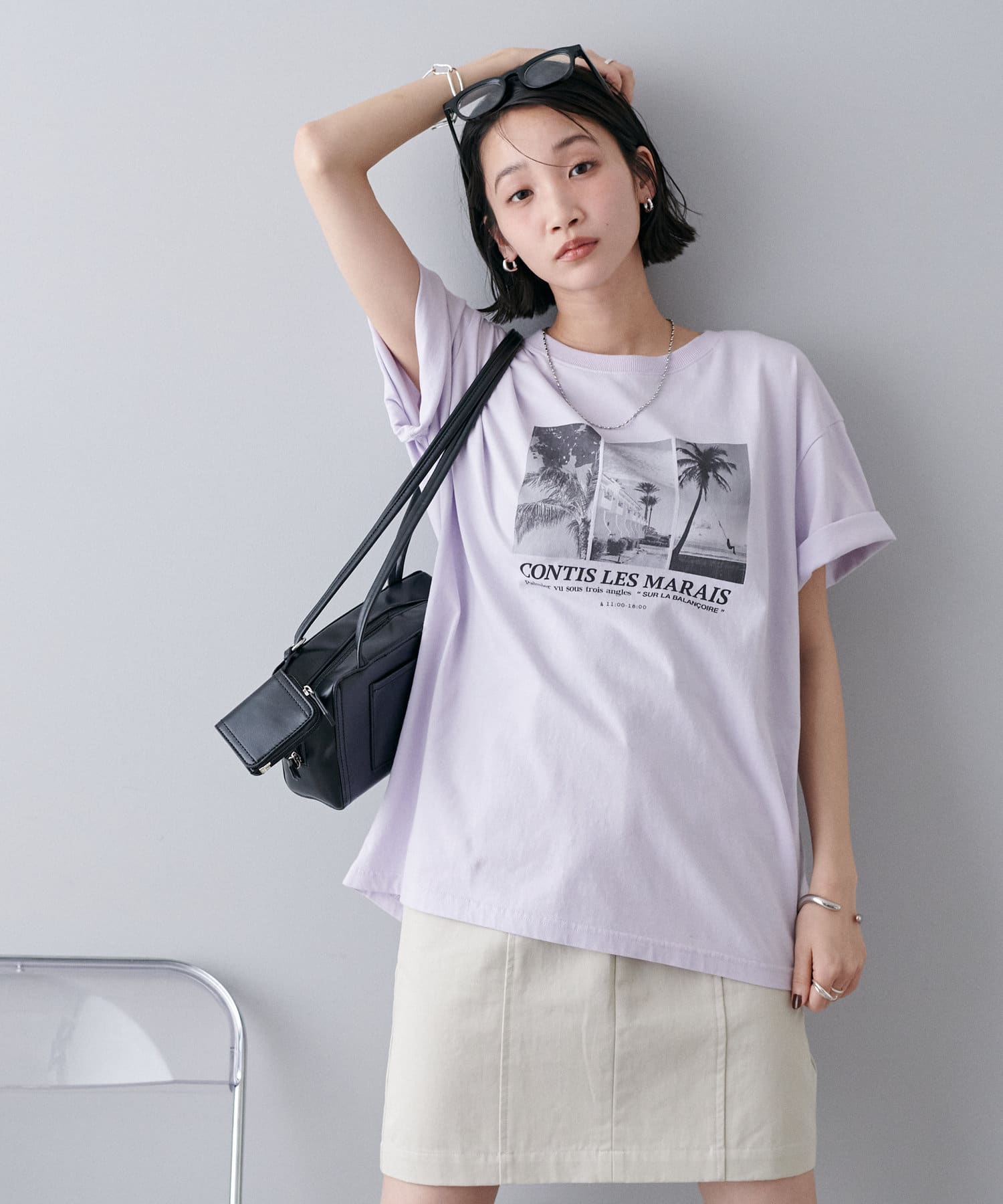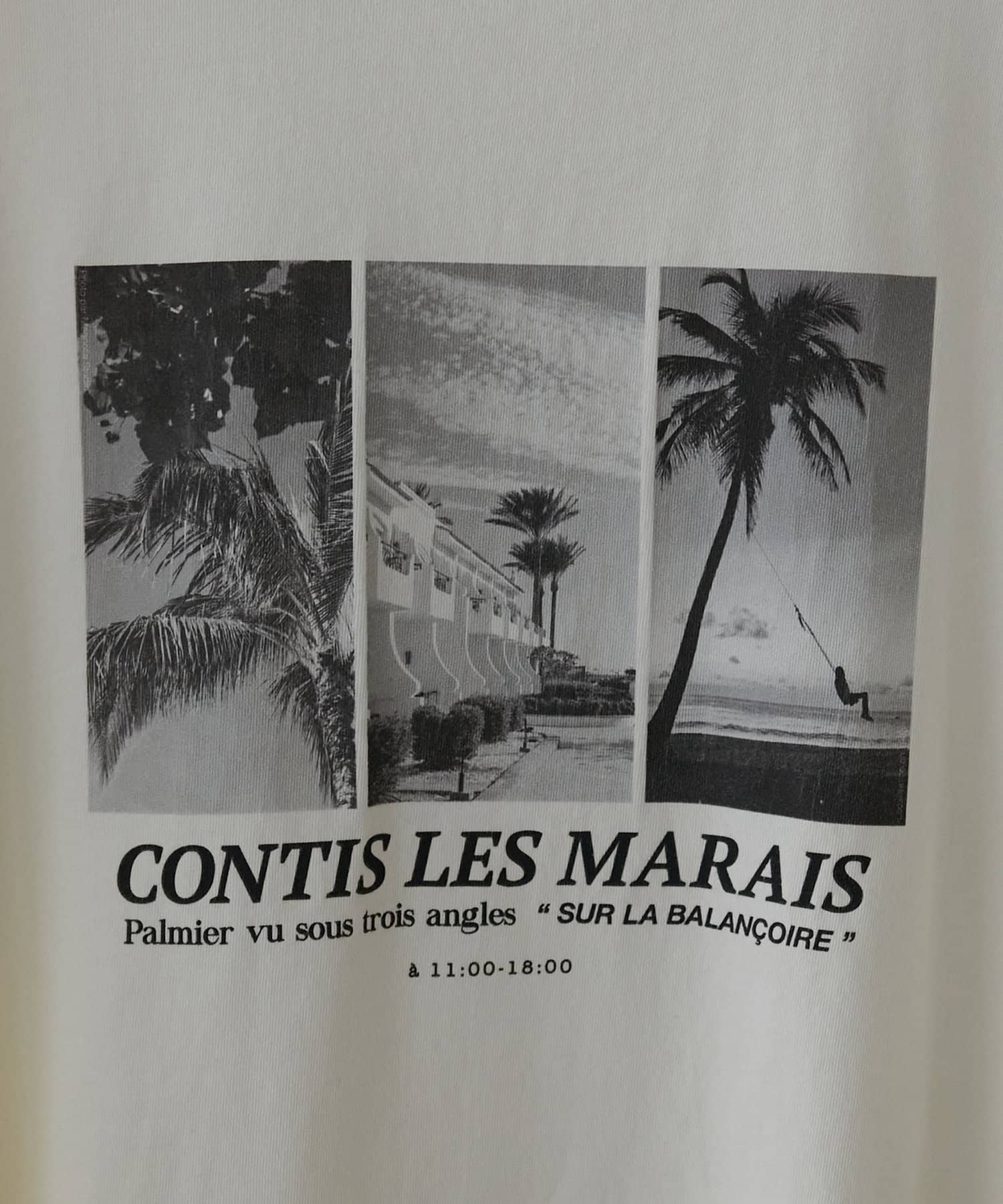 モノトーンのサマー風景フォトを3枚組み合わせたグラフィックが印象的なTシャツ。