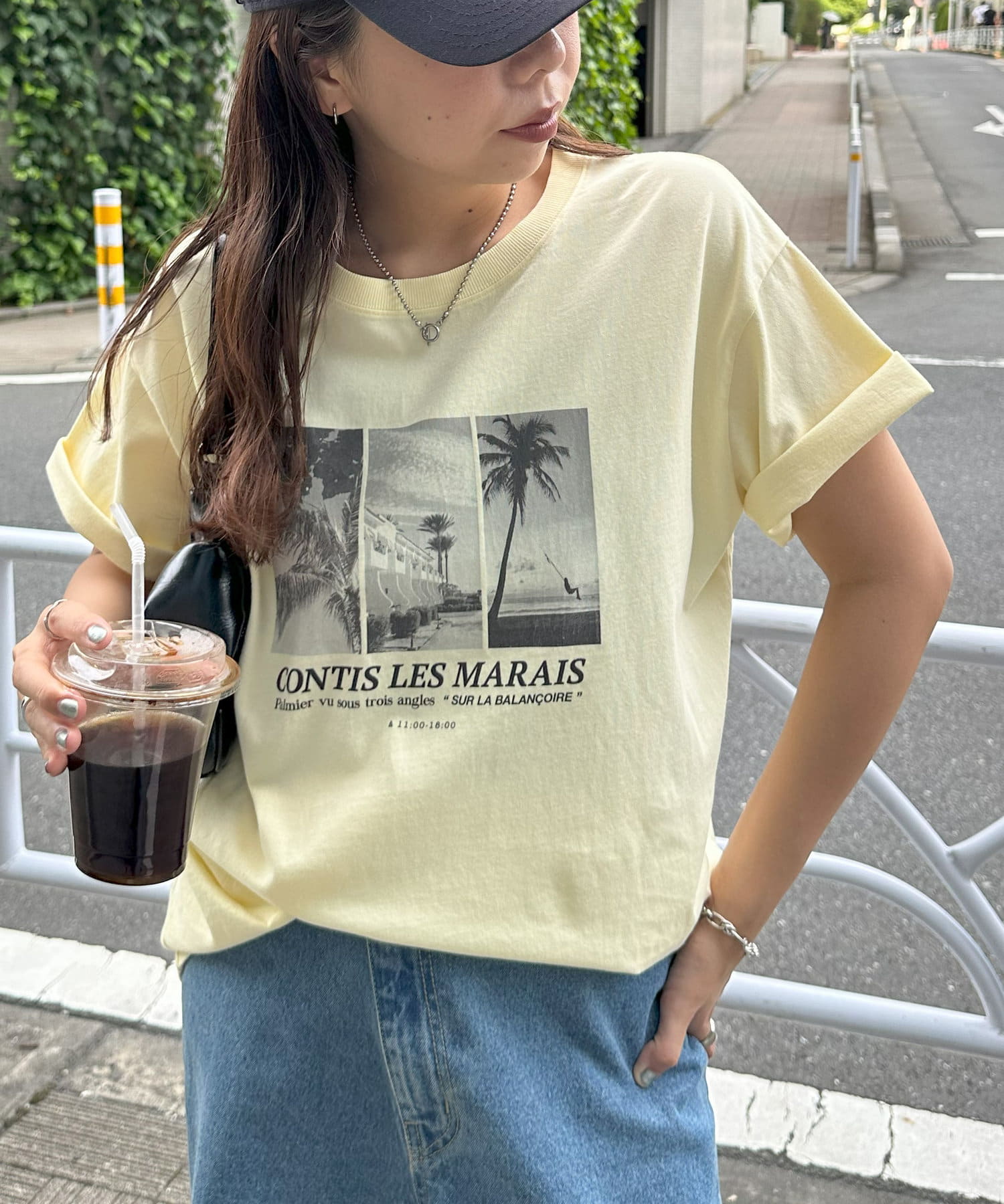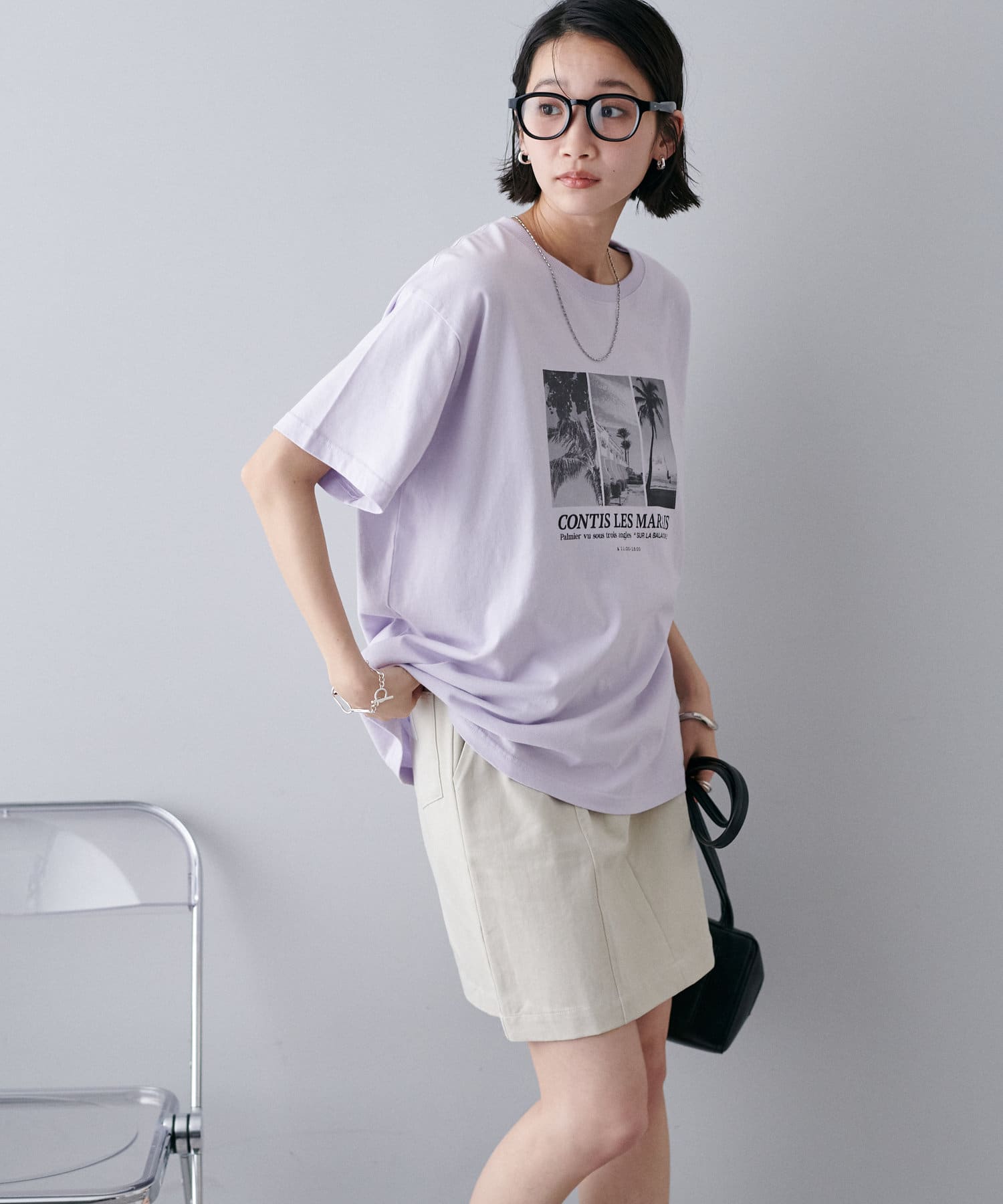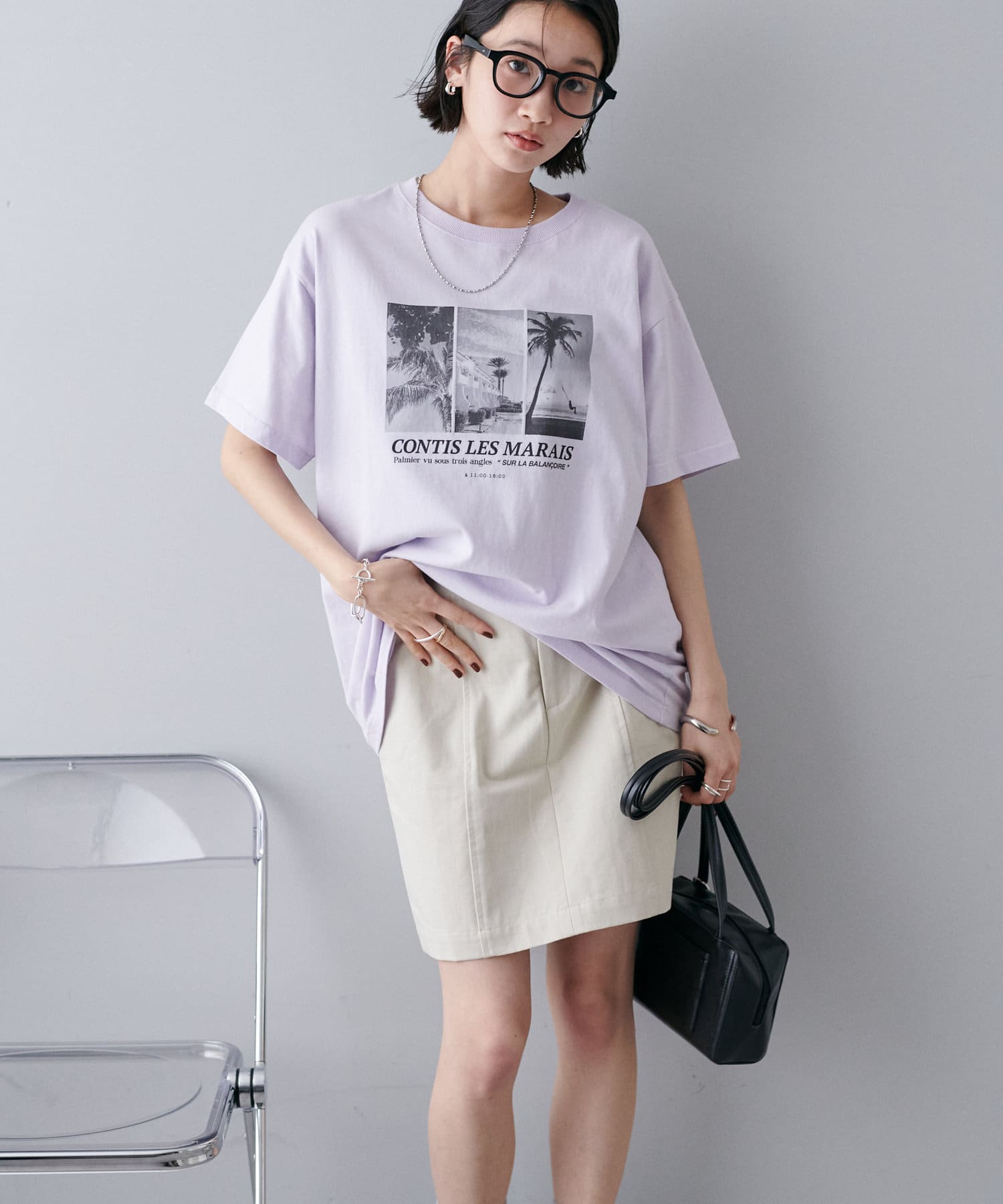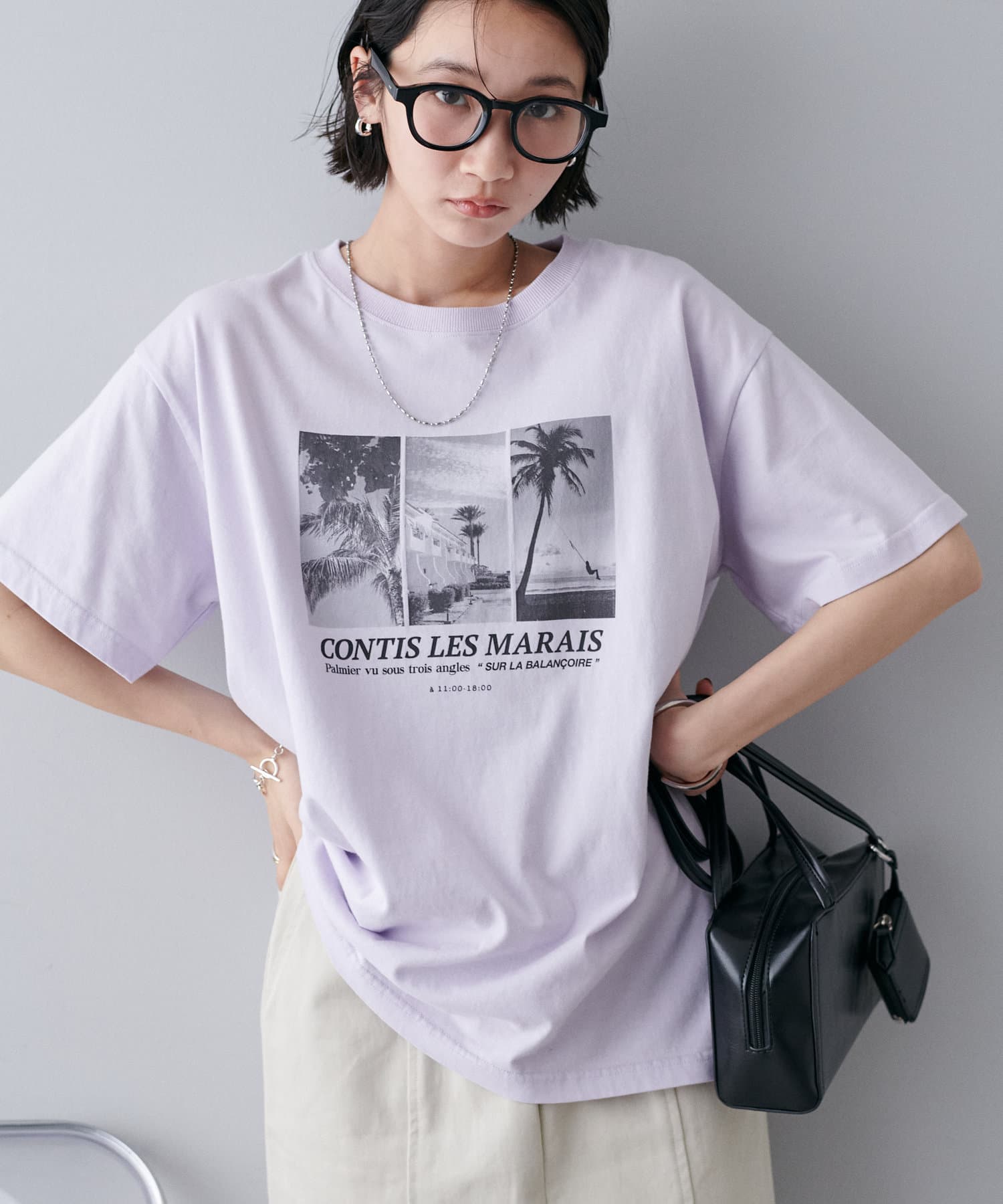 モノトーンのサマー風景フォトを3枚組み合わせたグラフィックが印象的なTシャツ。