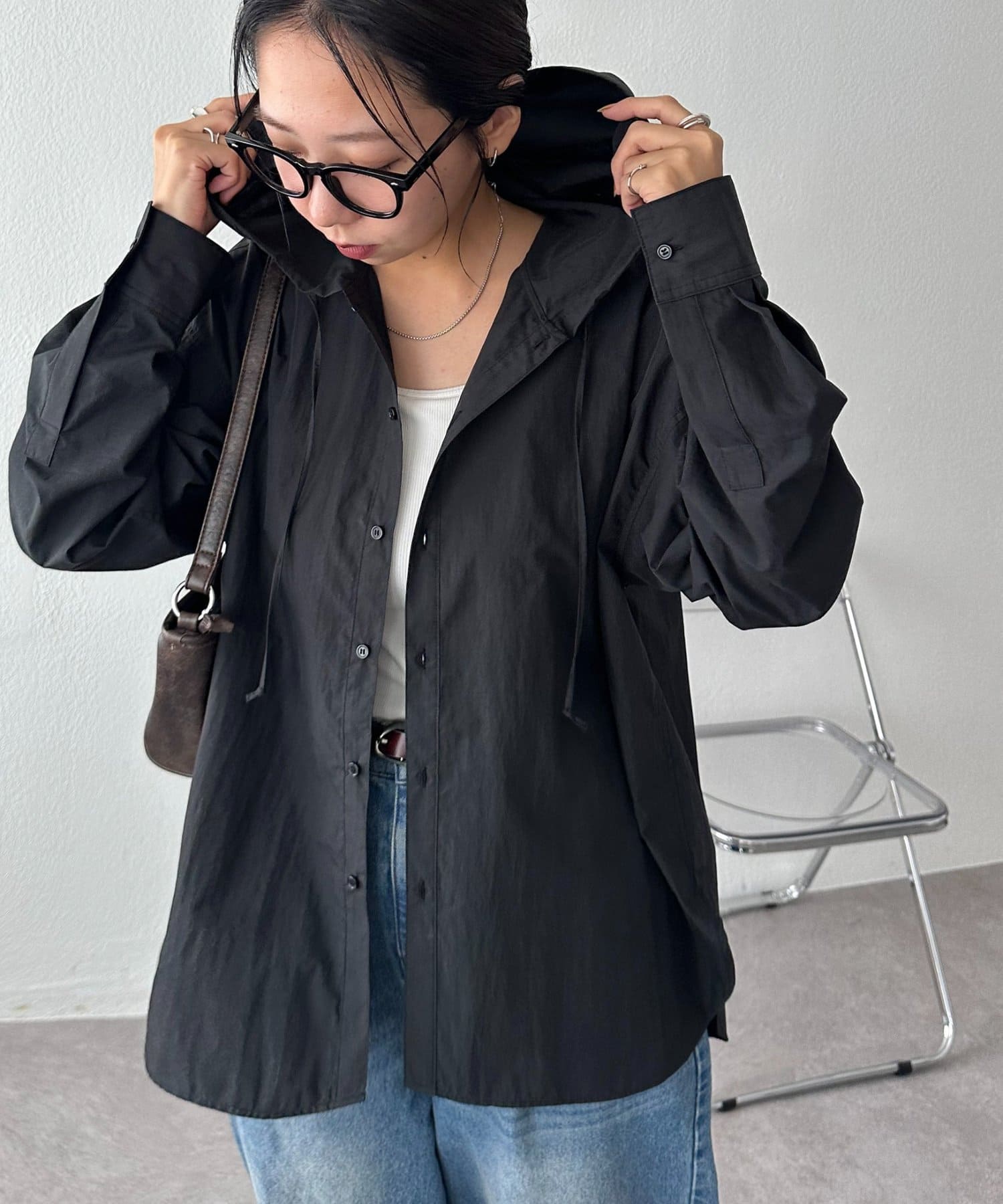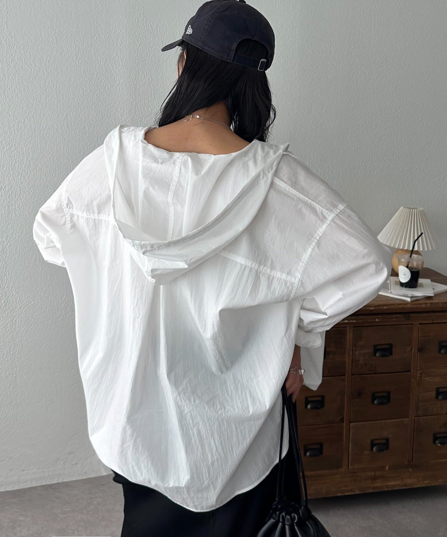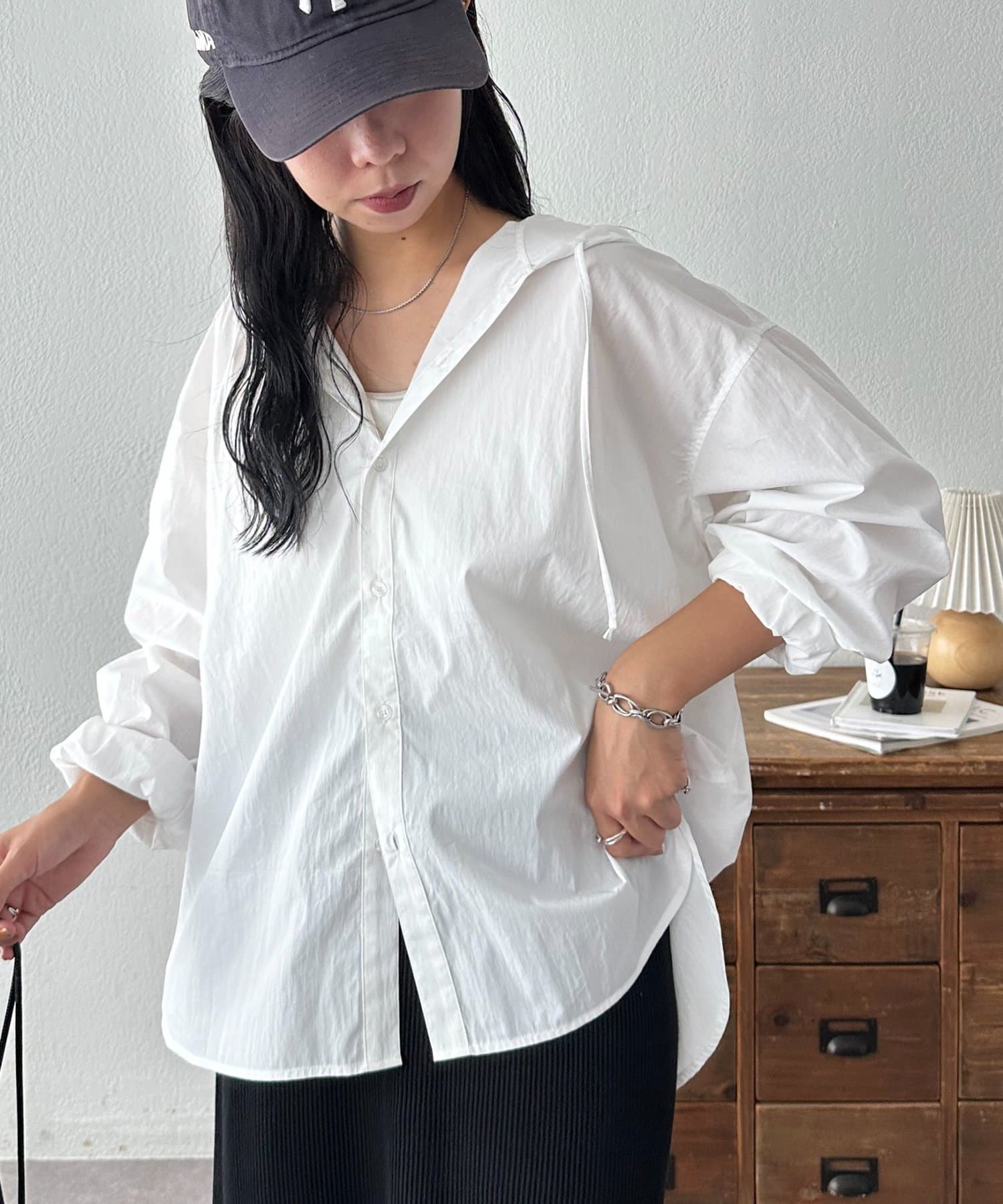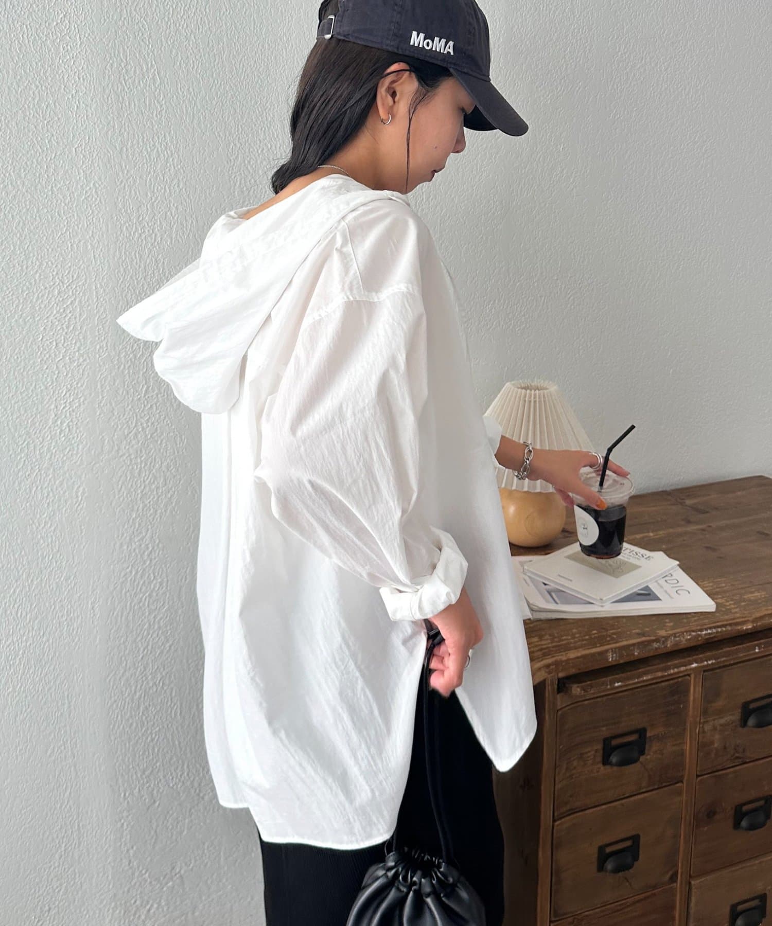 程よい抜け感を演出できる、オーバーシルエットのフード付きシャツ。