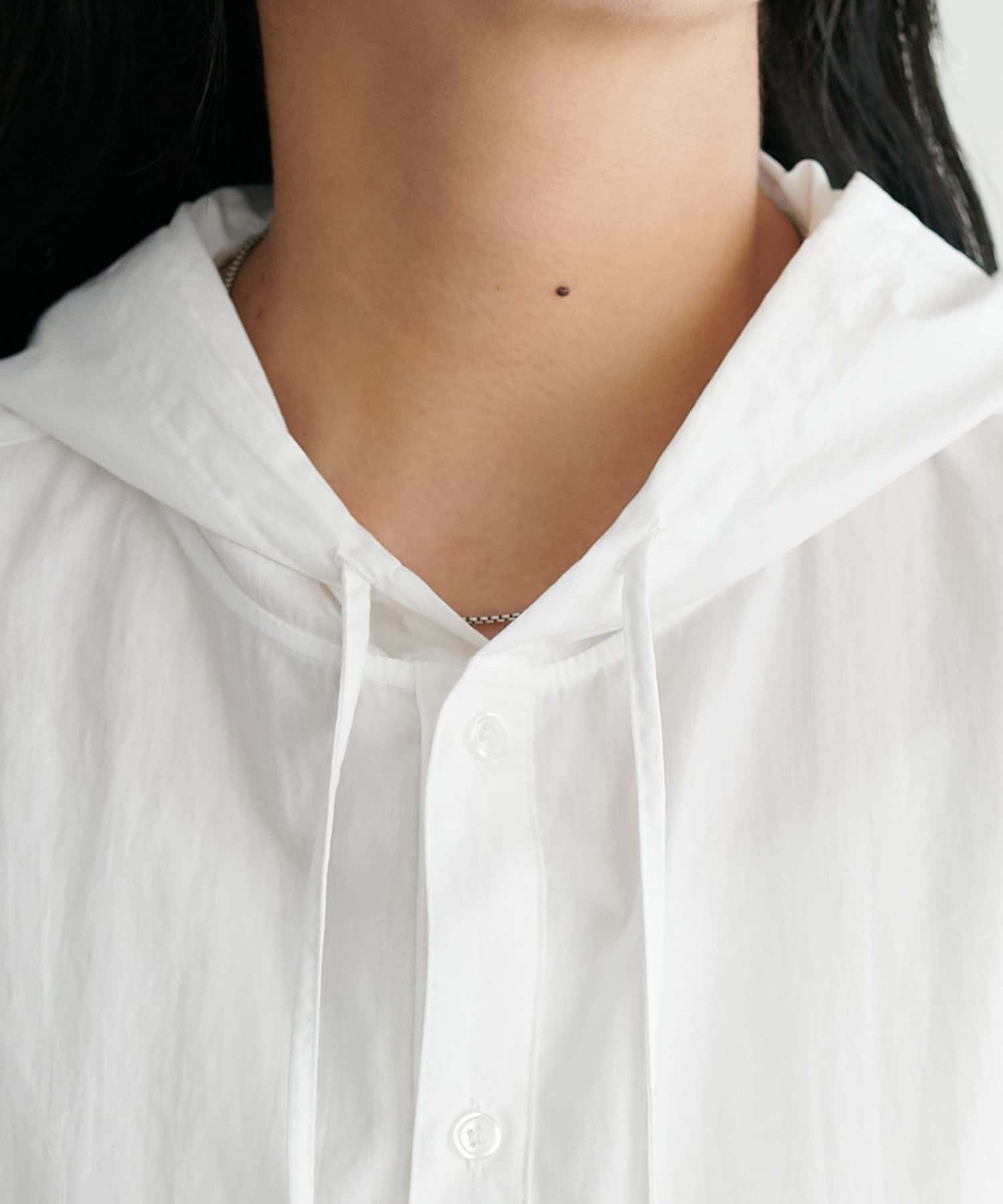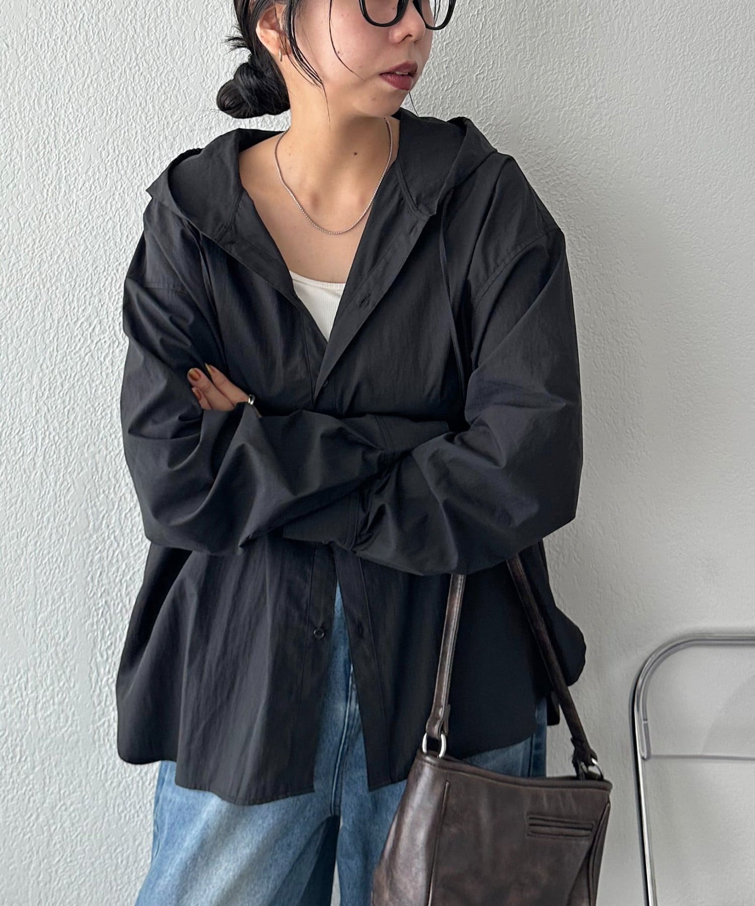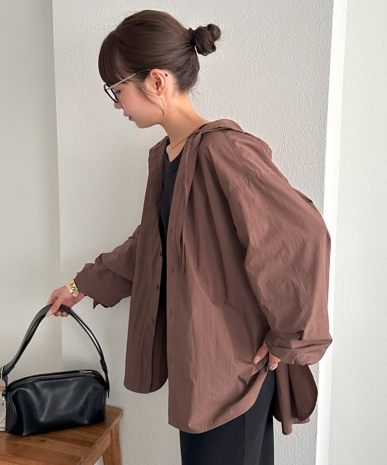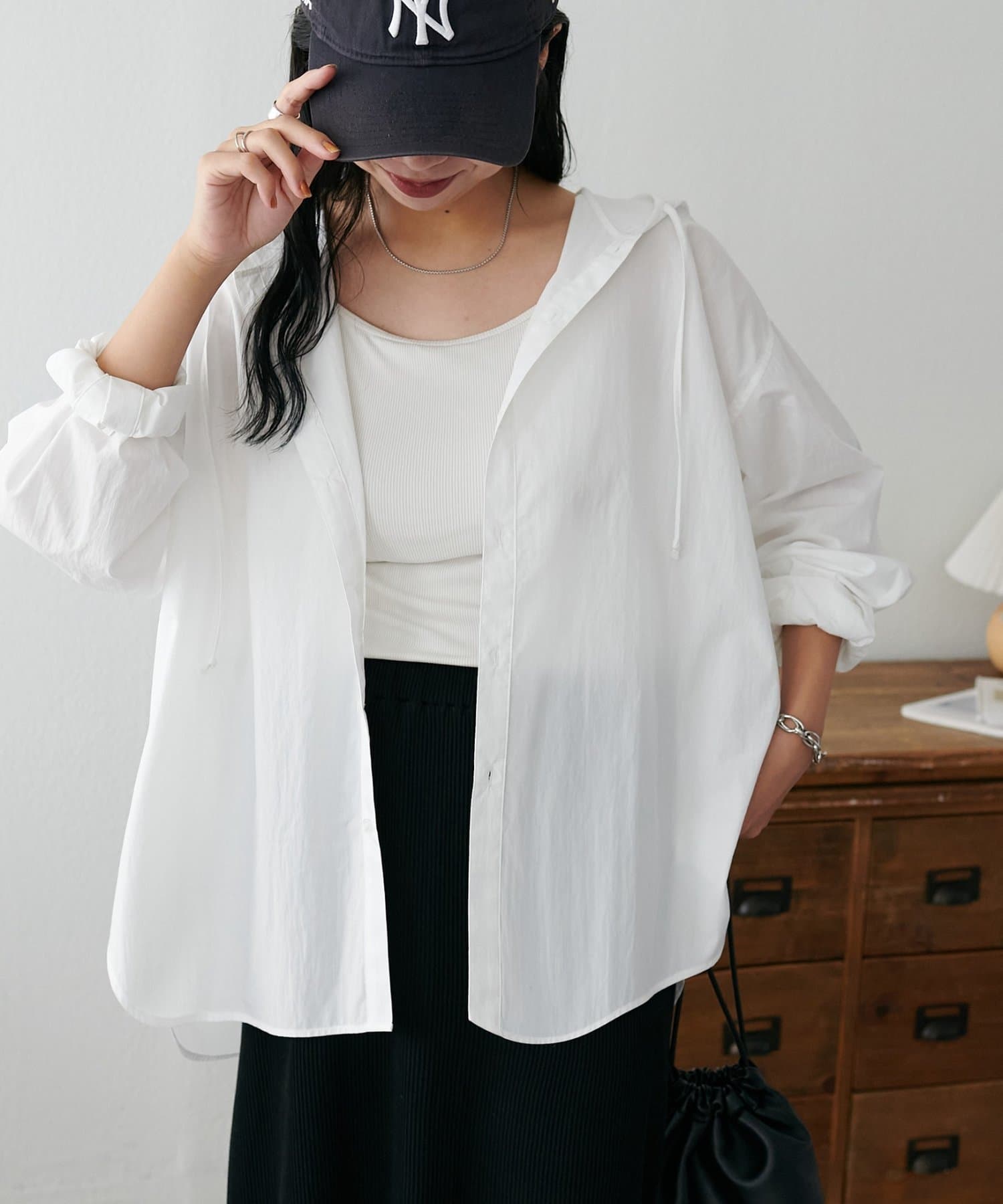 程よい抜け感を演出できる、オーバーシルエットのフード付きシャツ。