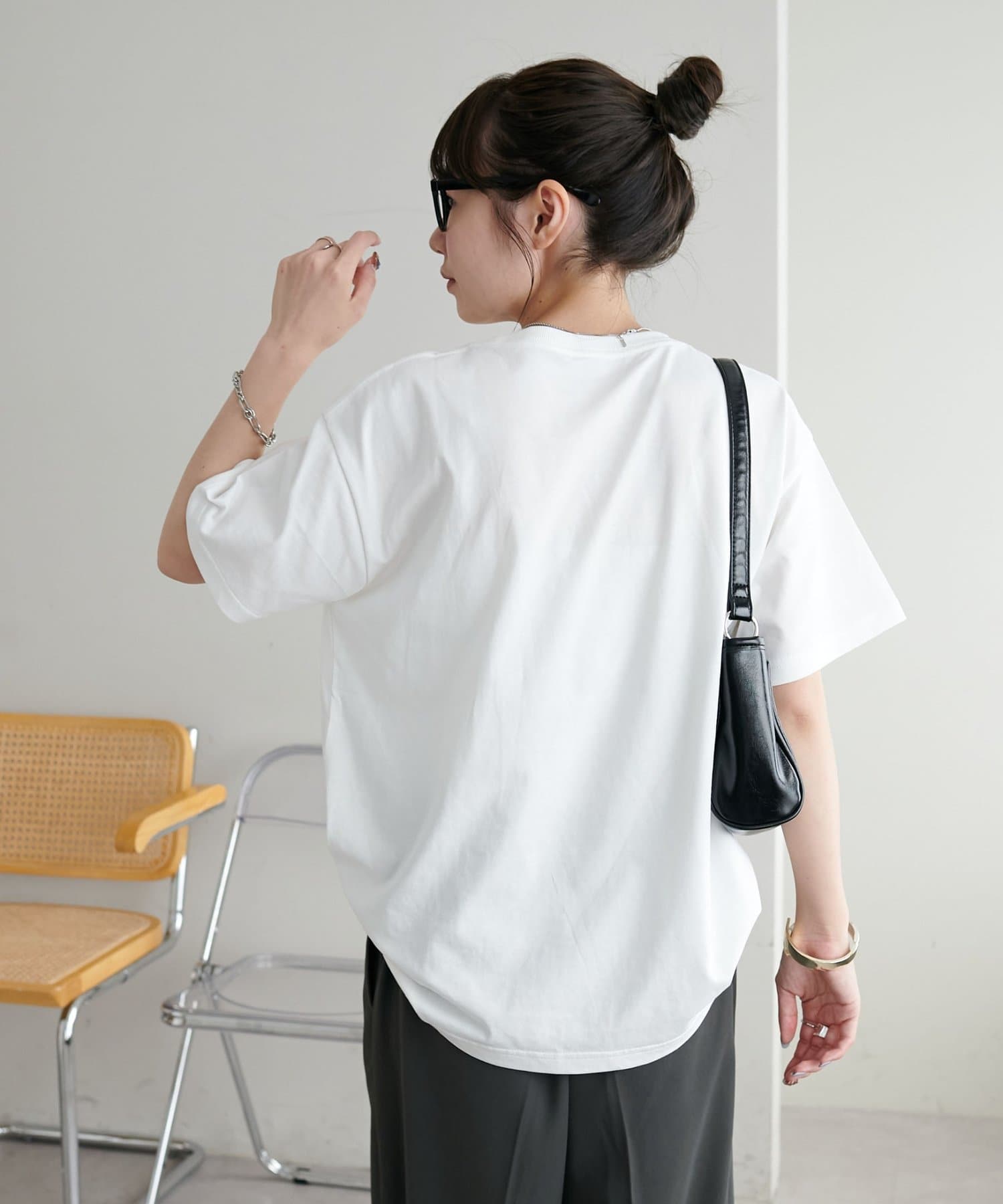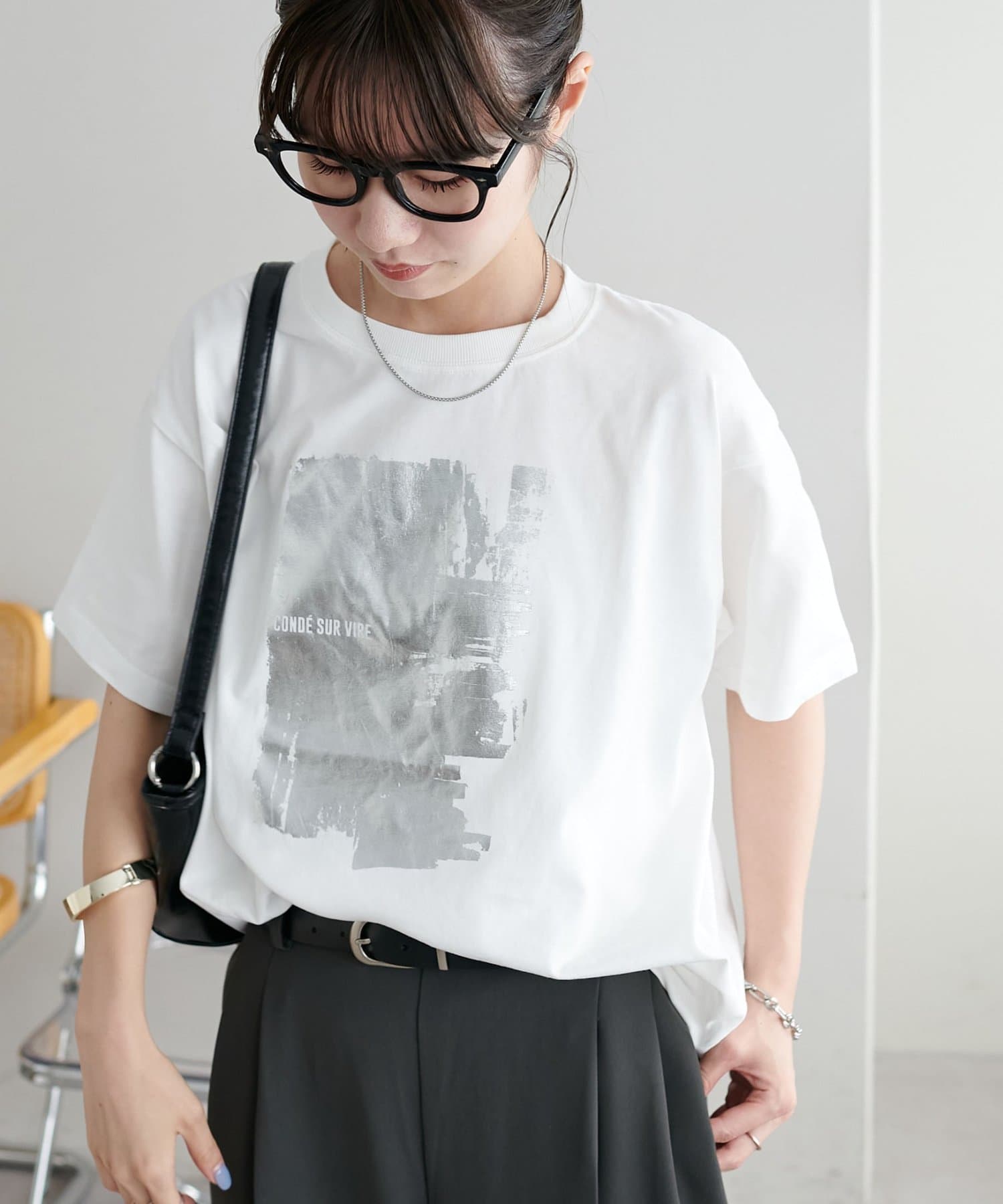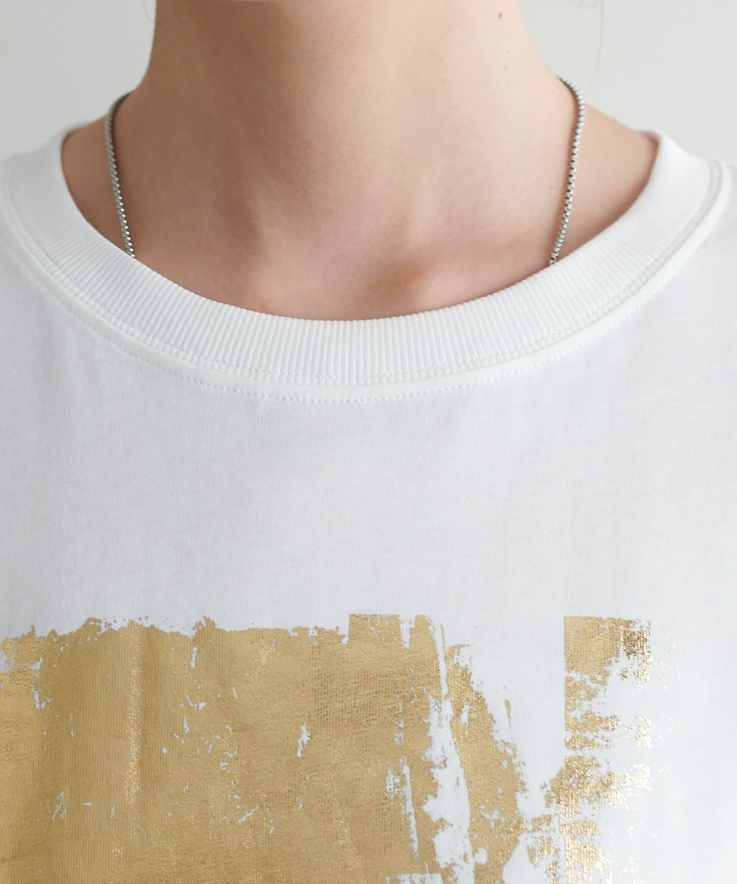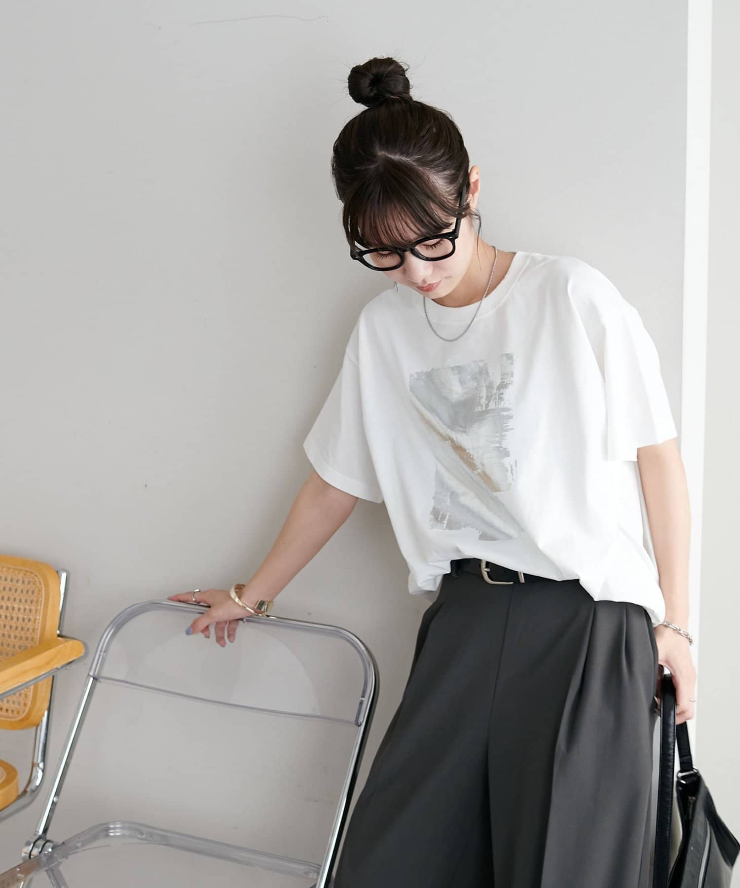 フロントに施されたハクグラフィックが、シンプルなTシャツに上品なアクセントをプラス◎光の角度によってさりげなく輝き、コーディネートに華やかさを添えてくれます。ベーシックなシルエットながら、1枚で存在感のある着こなしが叶うデザインです。ジャケットやシャツのインナーとしても映え、幅広いスタイリングに活躍します♪