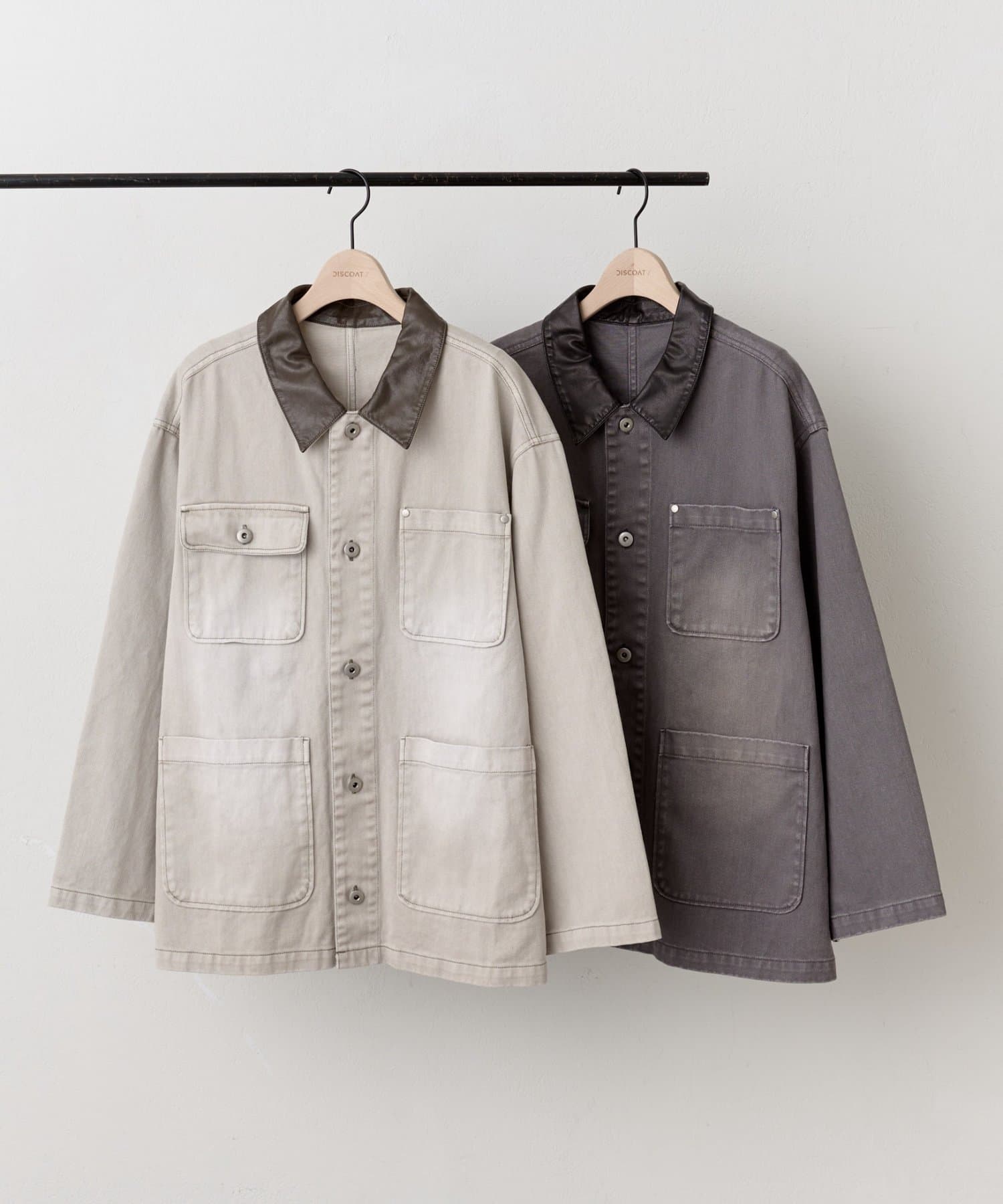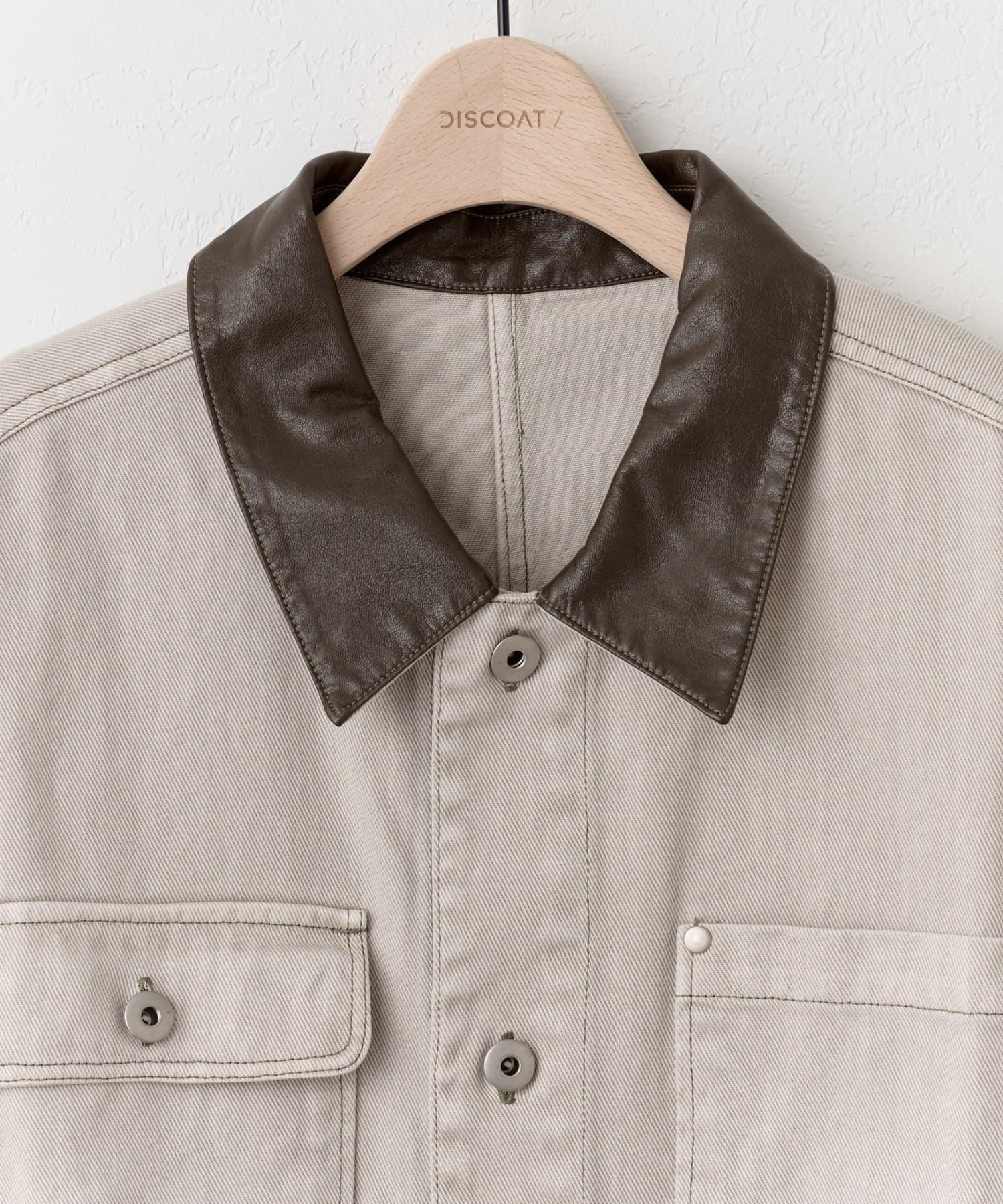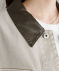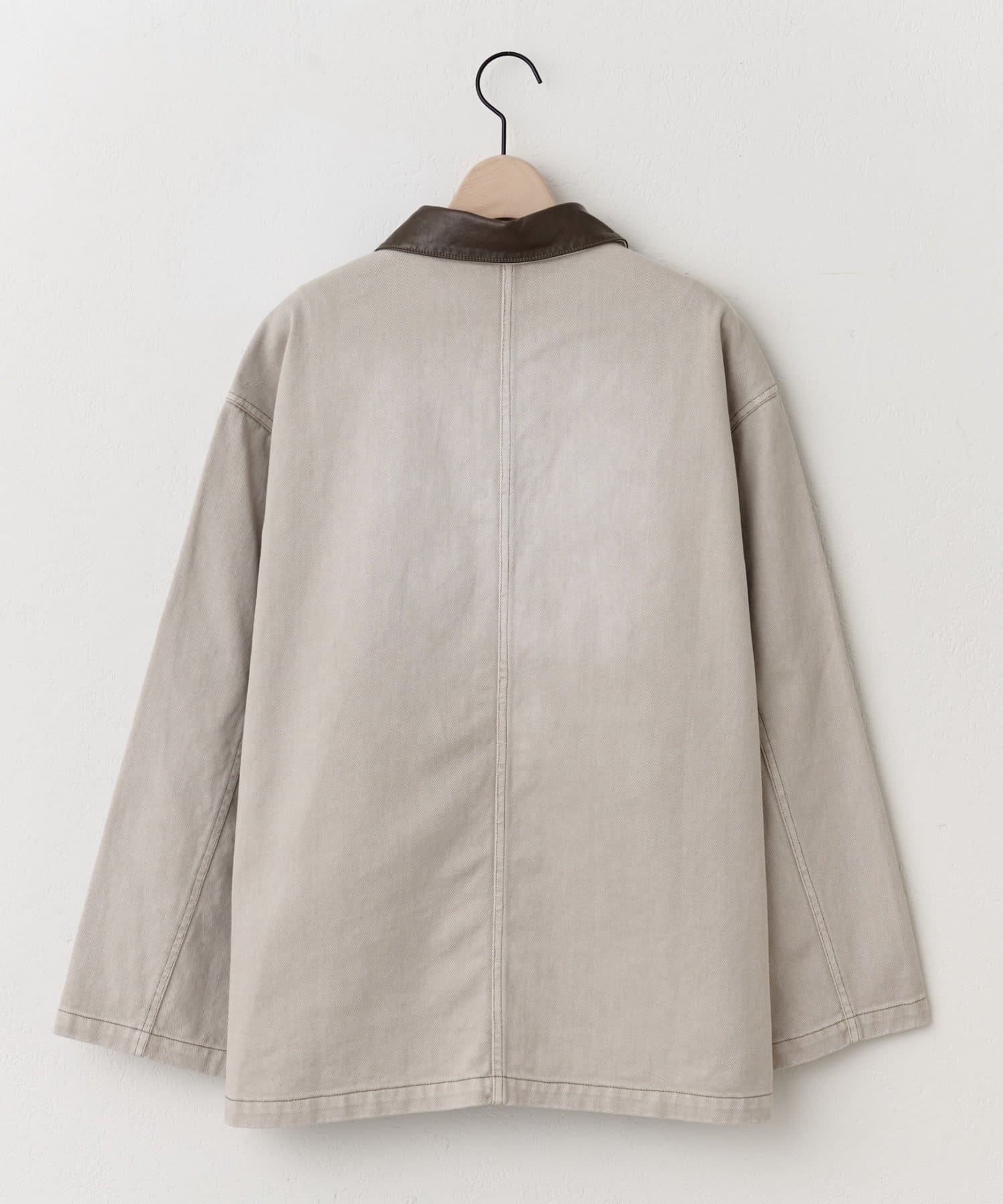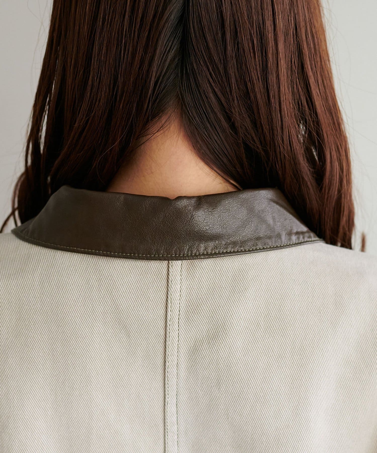 程よい厚みとハリ感のあるコットン素材を使用し、長く愛用できるタフさが魅力。襟部分にはフェイクレザーを使用しており、異素材ミックスがシンプルな装いに奥行きを与えてくれます。見た目以上に軽く、さらっと羽織りやすいのも嬉しいポイント。