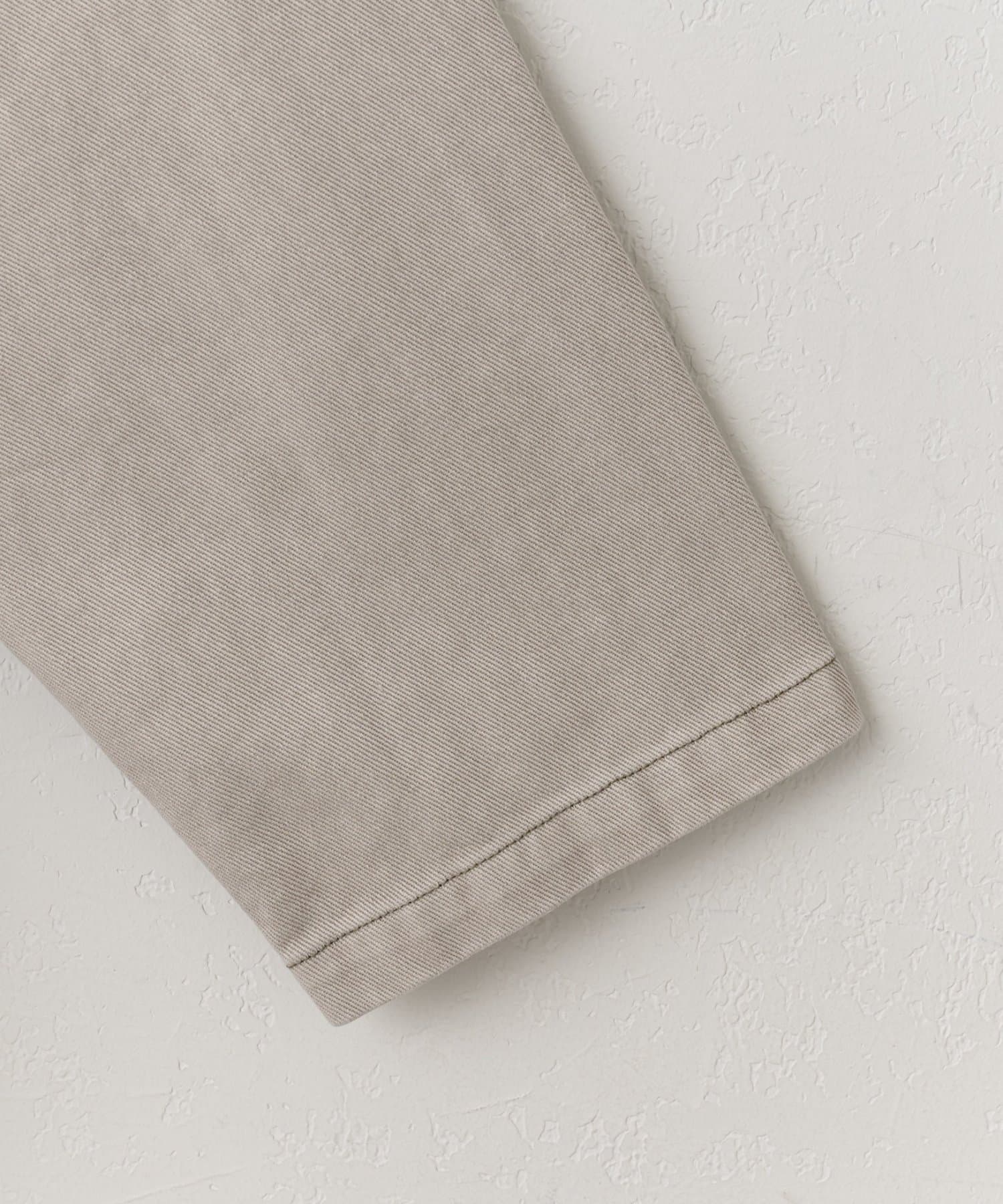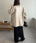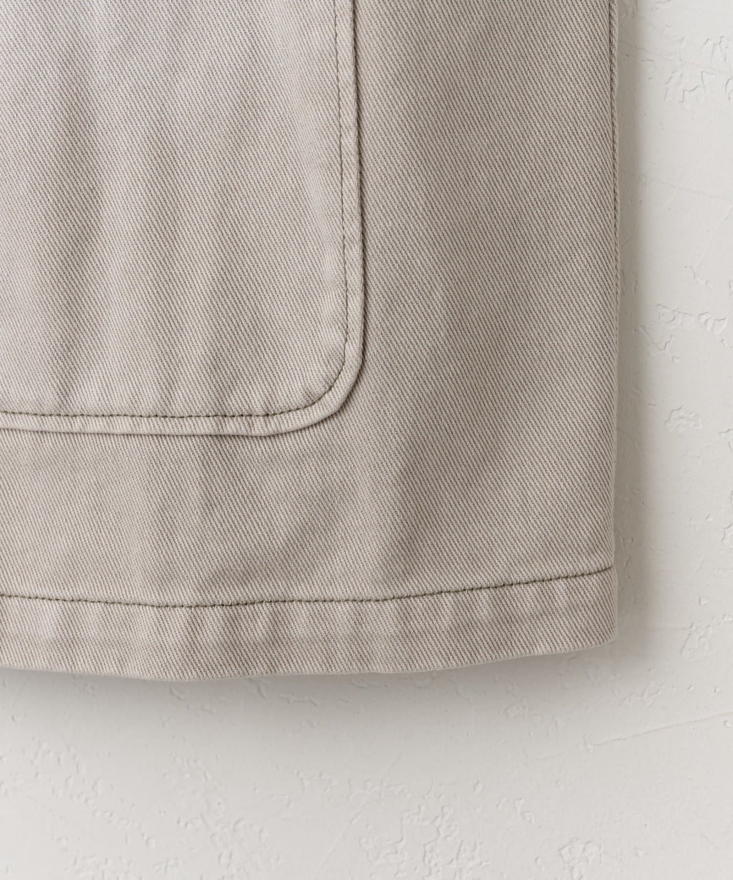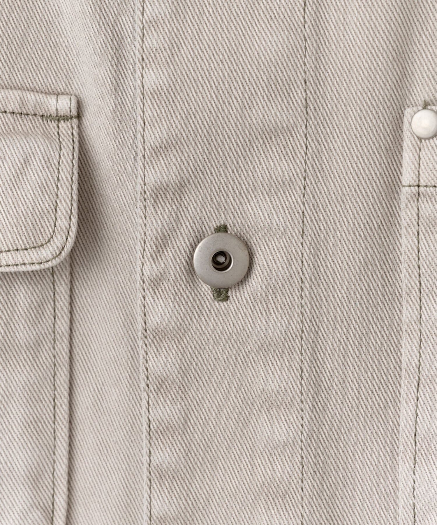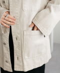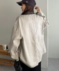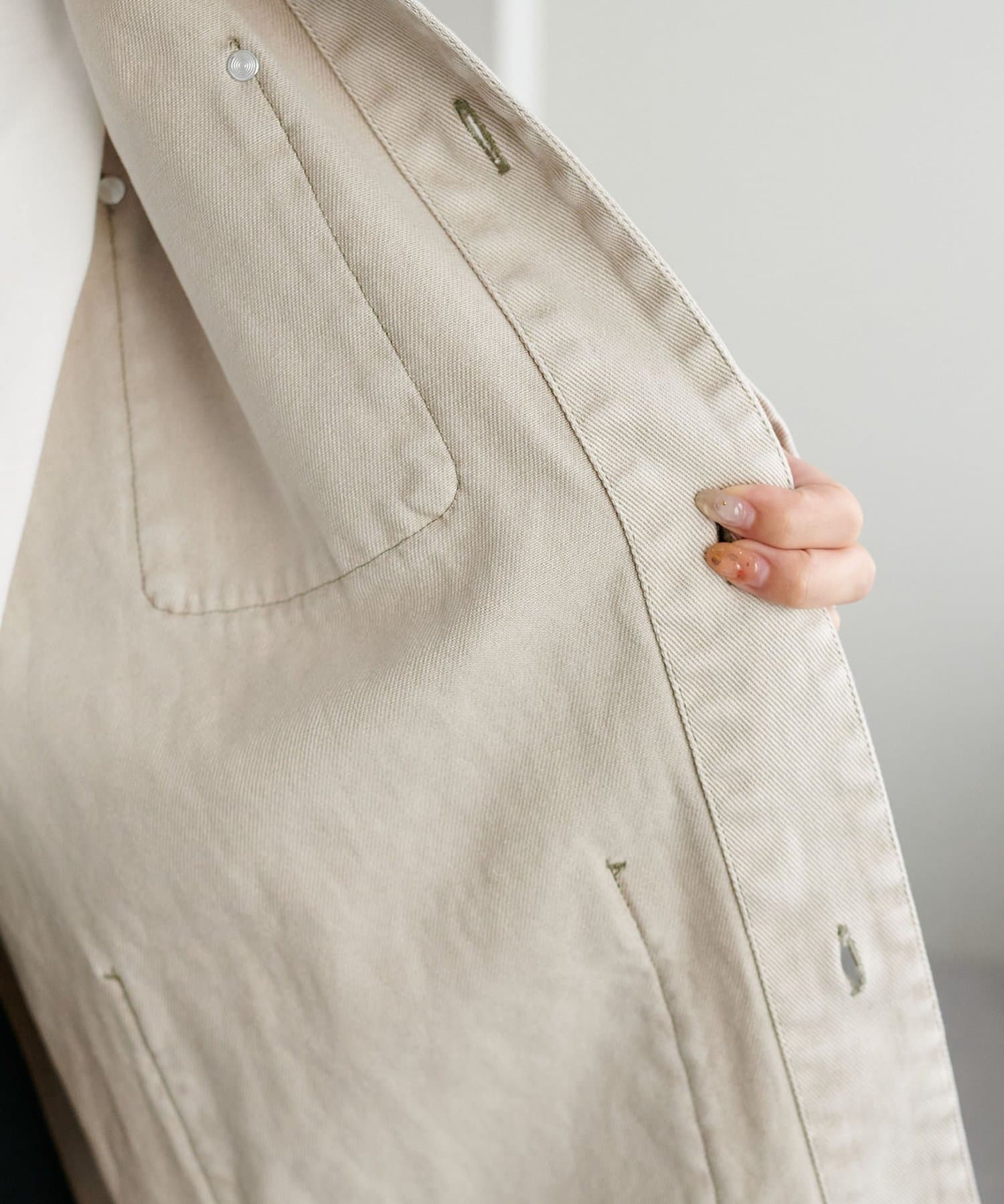 程よい厚みとハリ感のあるコットン素材を使用し、長く愛用できるタフさが魅力。襟部分にはフェイクレザーを使用しており、異素材ミックスがシンプルな装いに奥行きを与えてくれます。見た目以上に軽く、さらっと羽織りやすいのも嬉しいポイント。