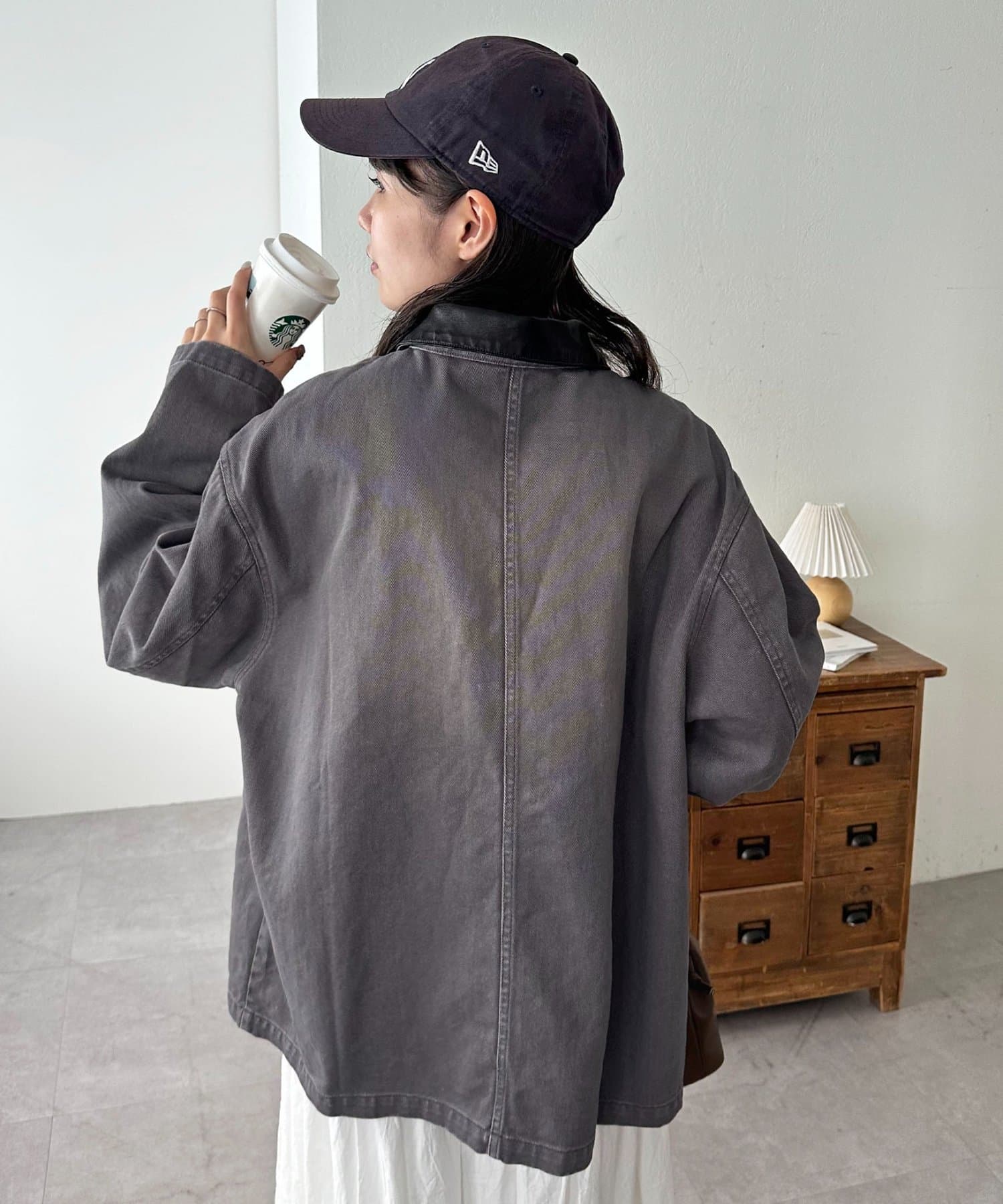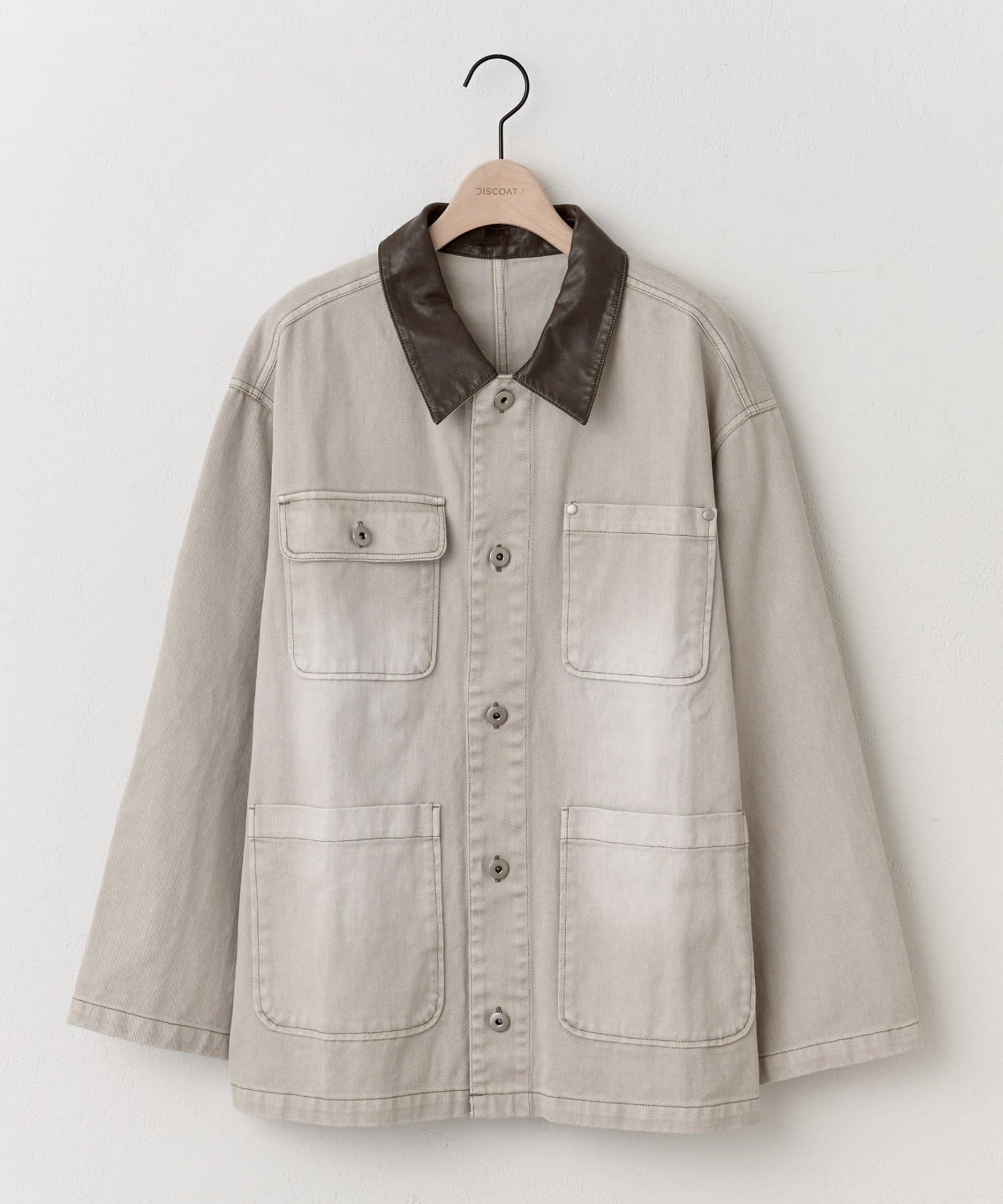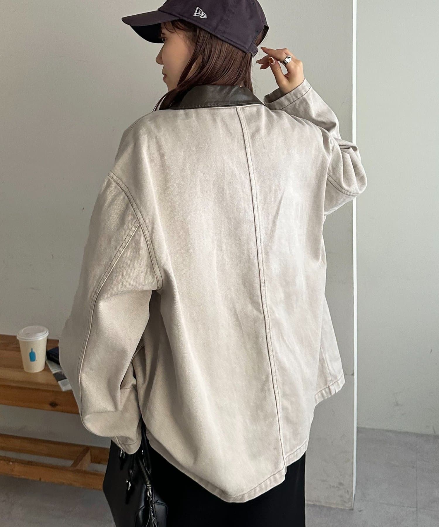 クラシカルなカバーオールをベースに、襟元のフェイクレザー切り替えでさりげない個性をプラス。程よいオーバーサイズと大きめのフロントポケットが、機能性とデザイン性を両立。重くならないスマートなフォルムで、メンズライクな雰囲気の中に抜け感を感じさせる1着です。