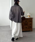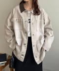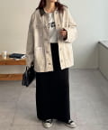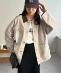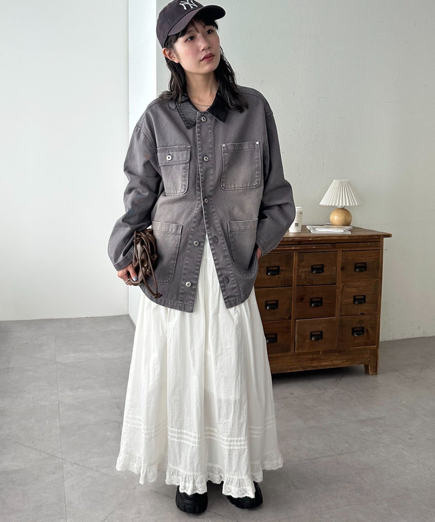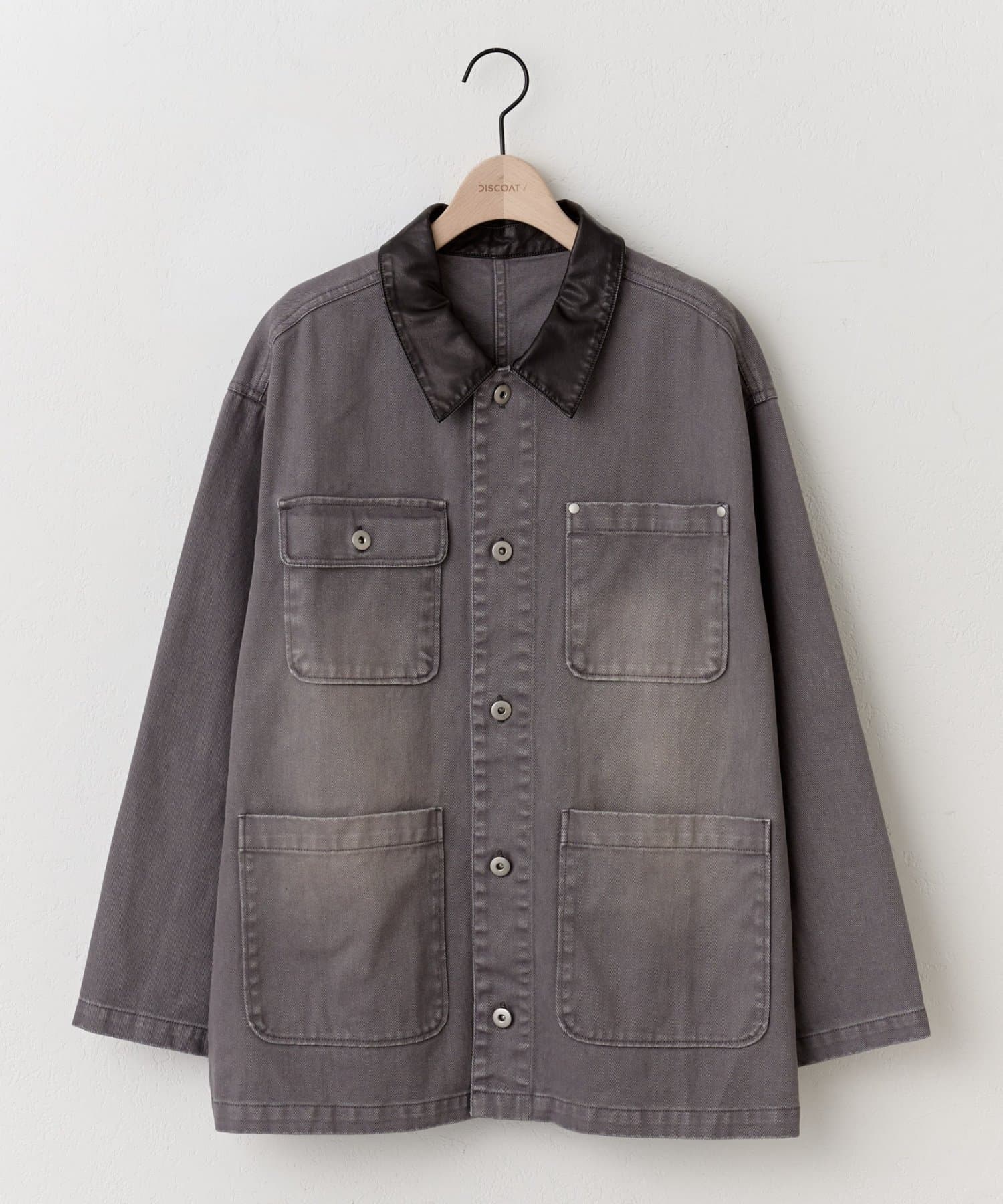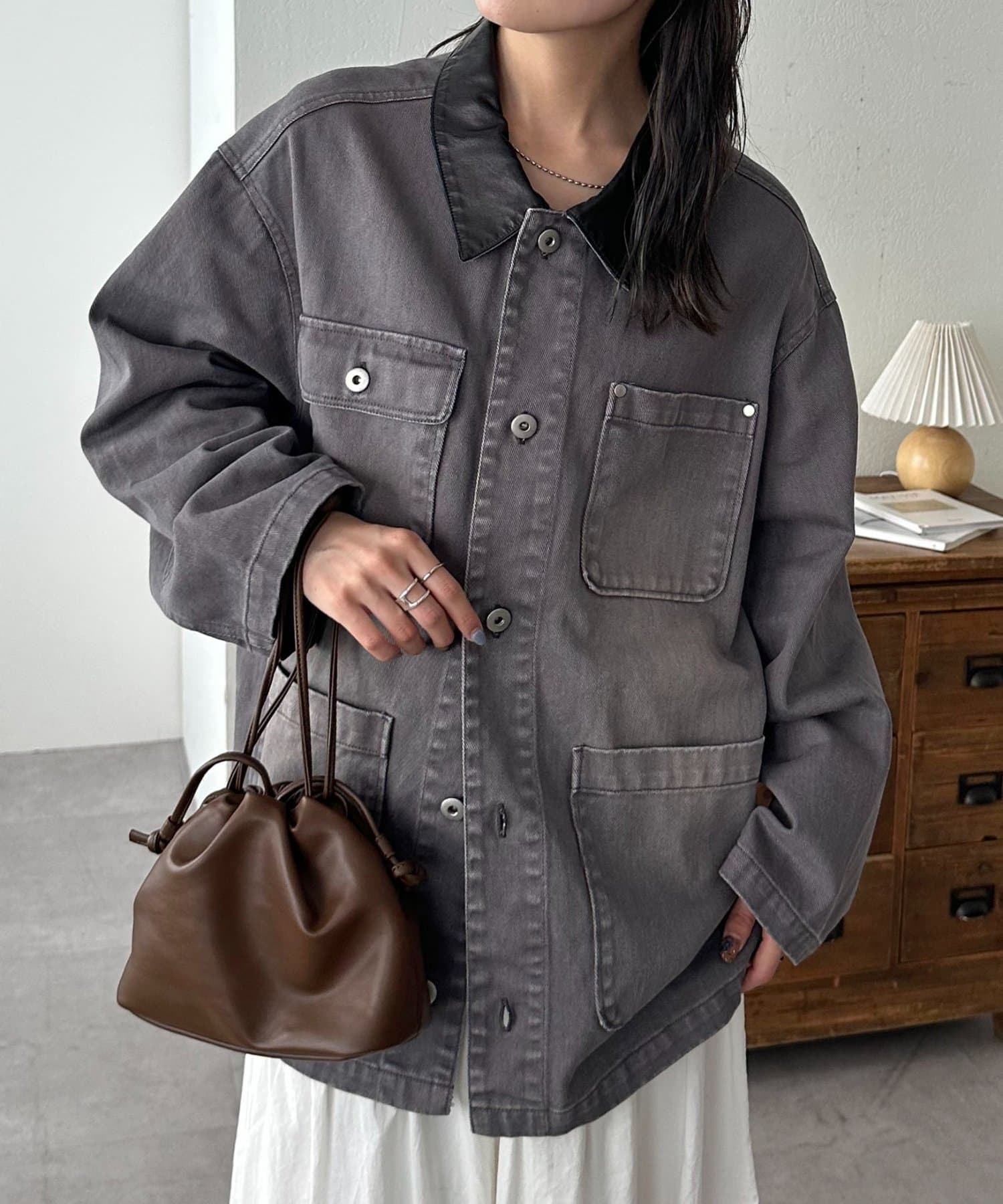 クラシカルなカバーオールをベースに、襟元のフェイクレザー切り替えでさりげない個性をプラス。程よいオーバーサイズと大きめのフロントポケットが、機能性とデザイン性を両立。重くならないスマートなフォルムで、メンズライクな雰囲気の中に抜け感を感じさせる1着です。