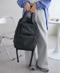 スタイリッシュな見た目と高い機能性を兼ね備えた、頼れるバックパック。メイン収納に加えて、外側・内側に複数のポケットを備えており、荷物の整理整頓もスムーズに◎軽量で丈夫なポリエステル素材を使用しており、デイリー使いにぴったりのタフさと扱いやすさが魅力です。程よい光沢感のあるナイロン調の表面感が、カジュアルすぎず、きれいめスタイルにもマッチ。両サイドにはペットボトルや折りたたみ傘が収まるポケット付きで、通勤・通学・旅行など幅広いシーンに対応します。