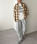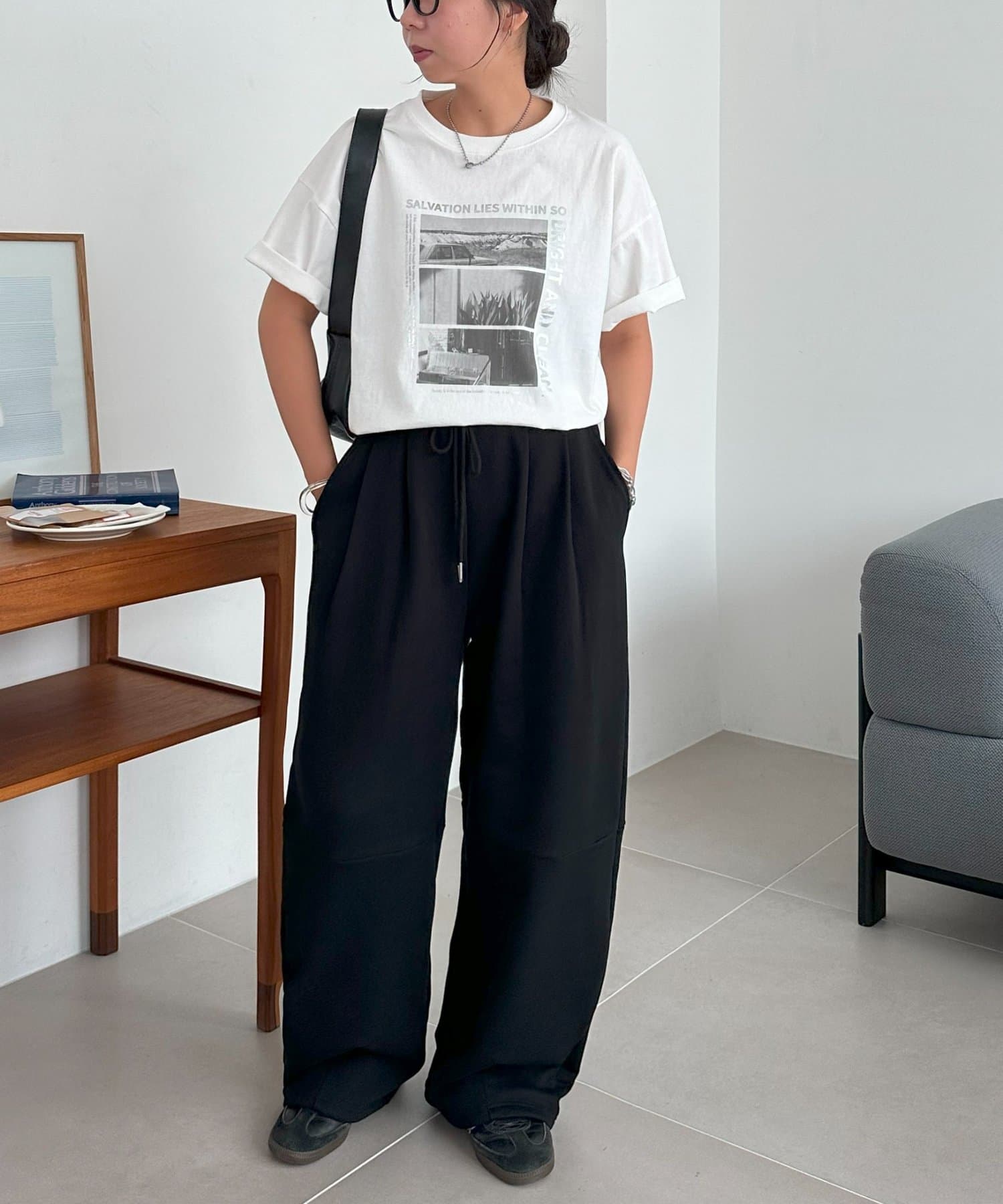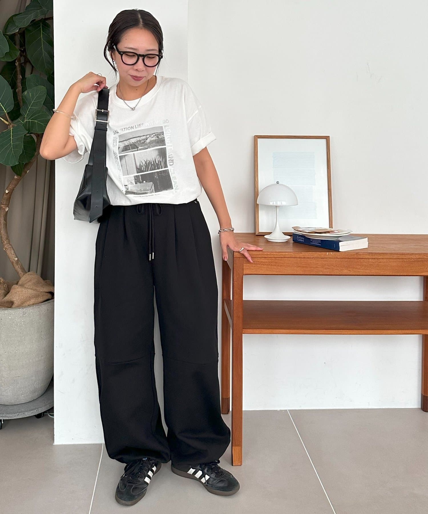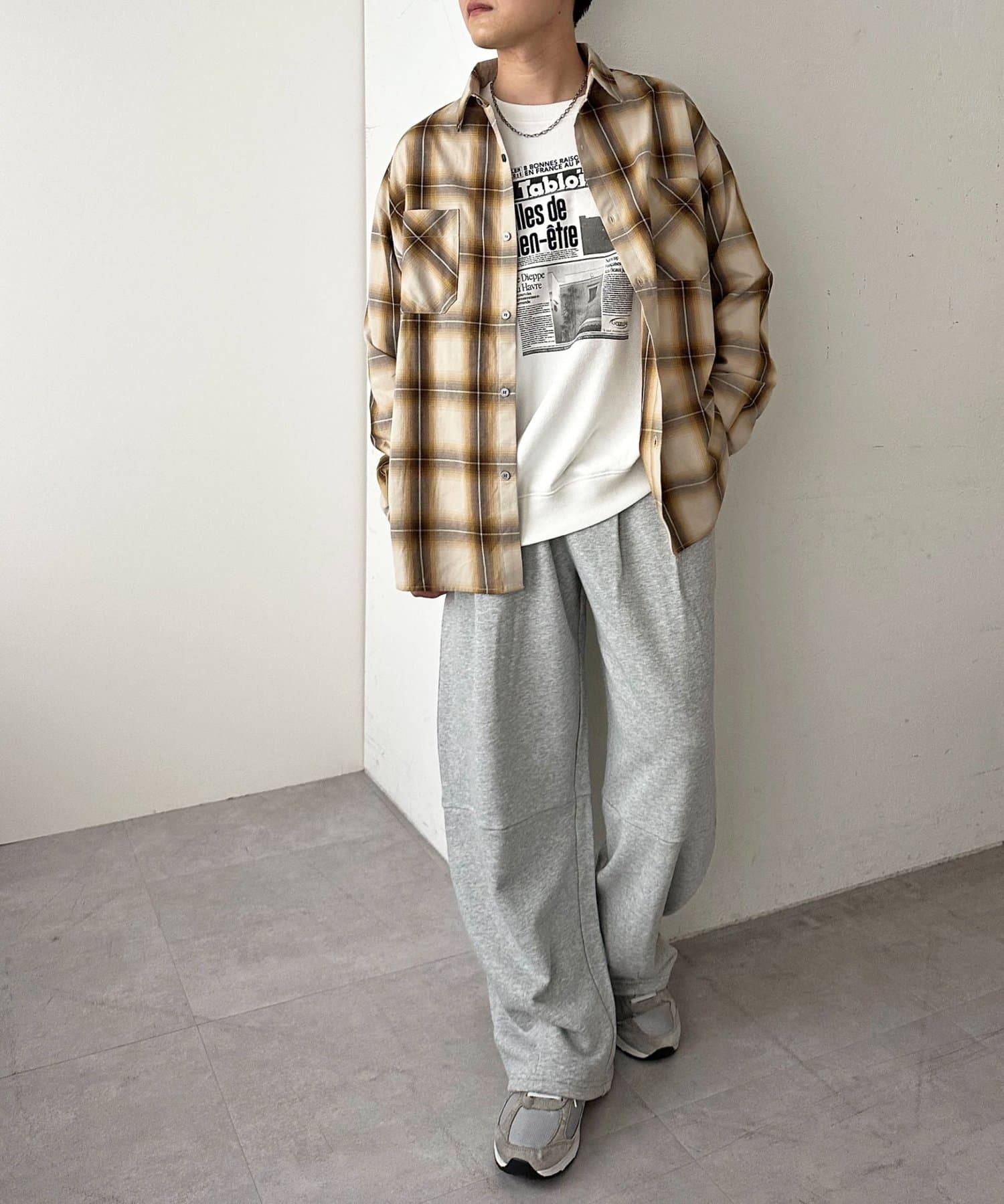 定番のTシャツやスウェットなどラフなアイテムと合わせたカジュアルスタイル。