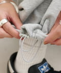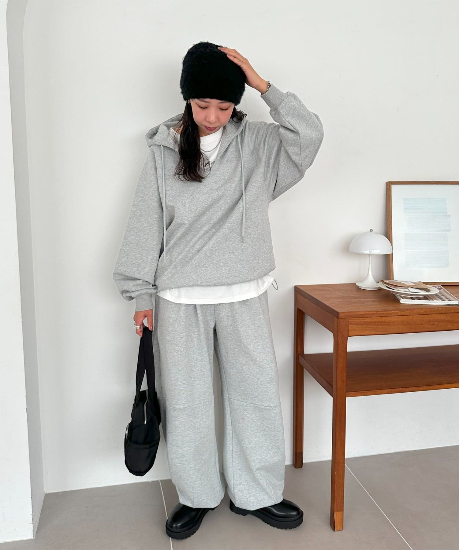 同素材のスウェットフーディーと合わせてセットアップ風の着こなしもおすすめ。