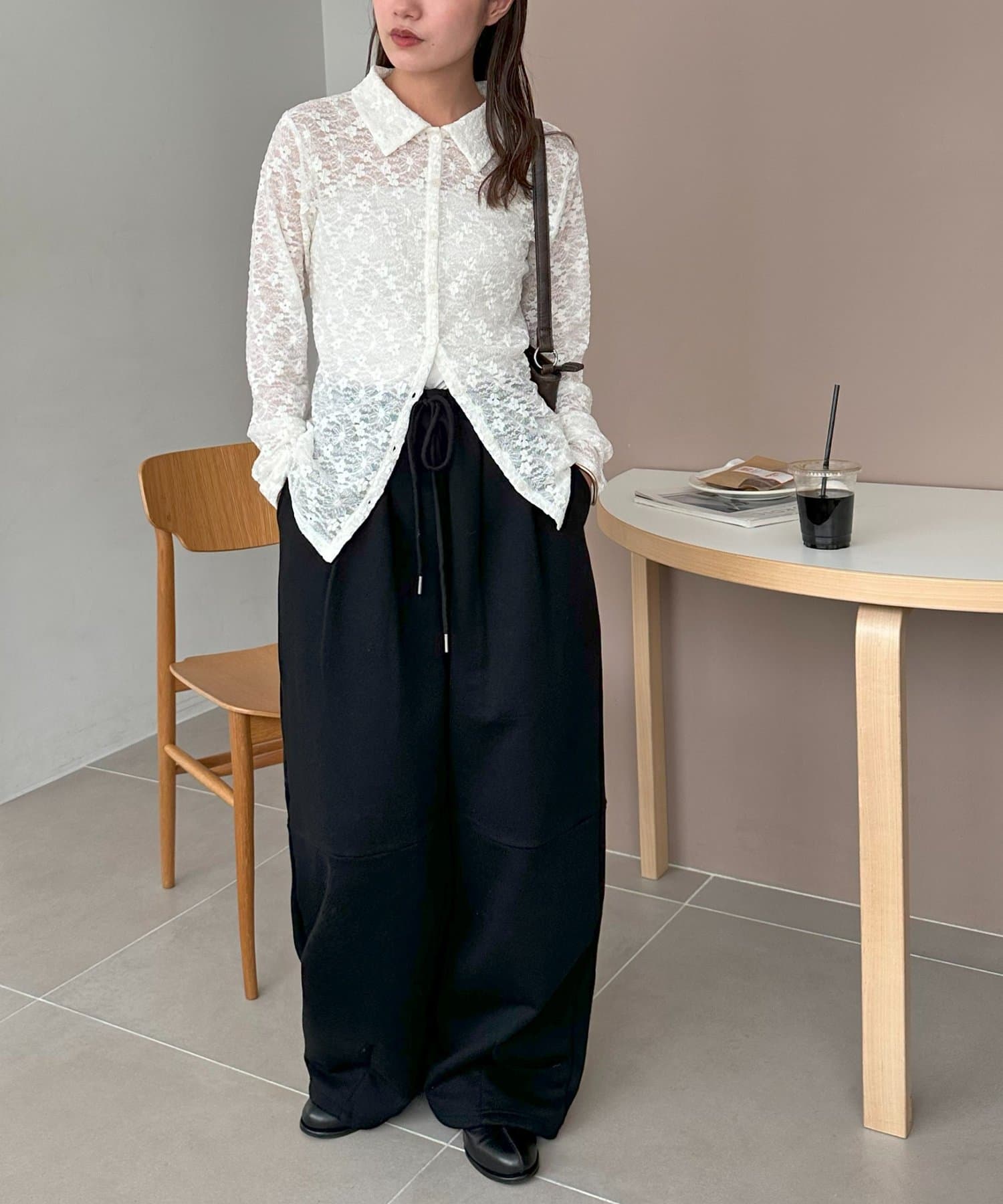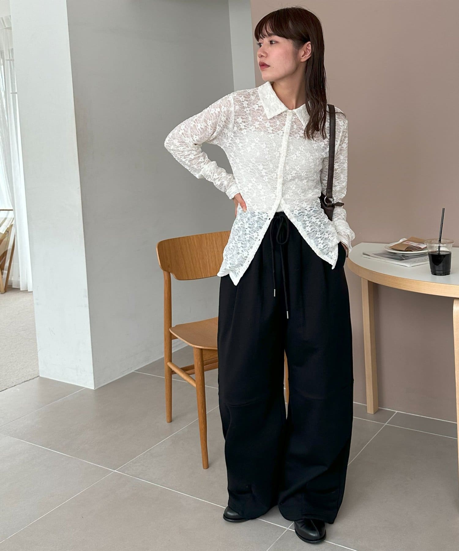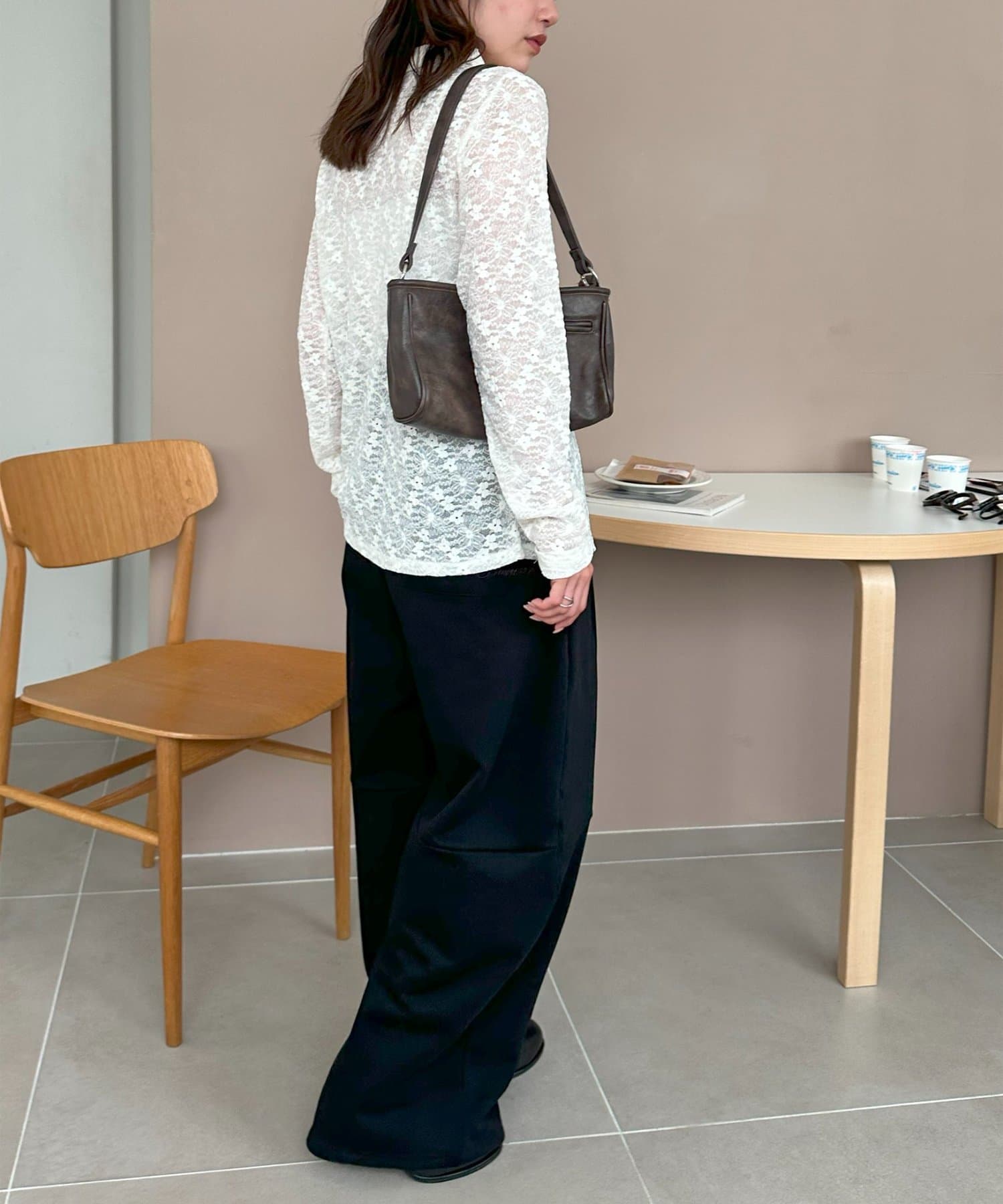 あえてレーストップスなどフェミニンなアイテムを合わせることで、ぐっとこなれた雰囲気に。