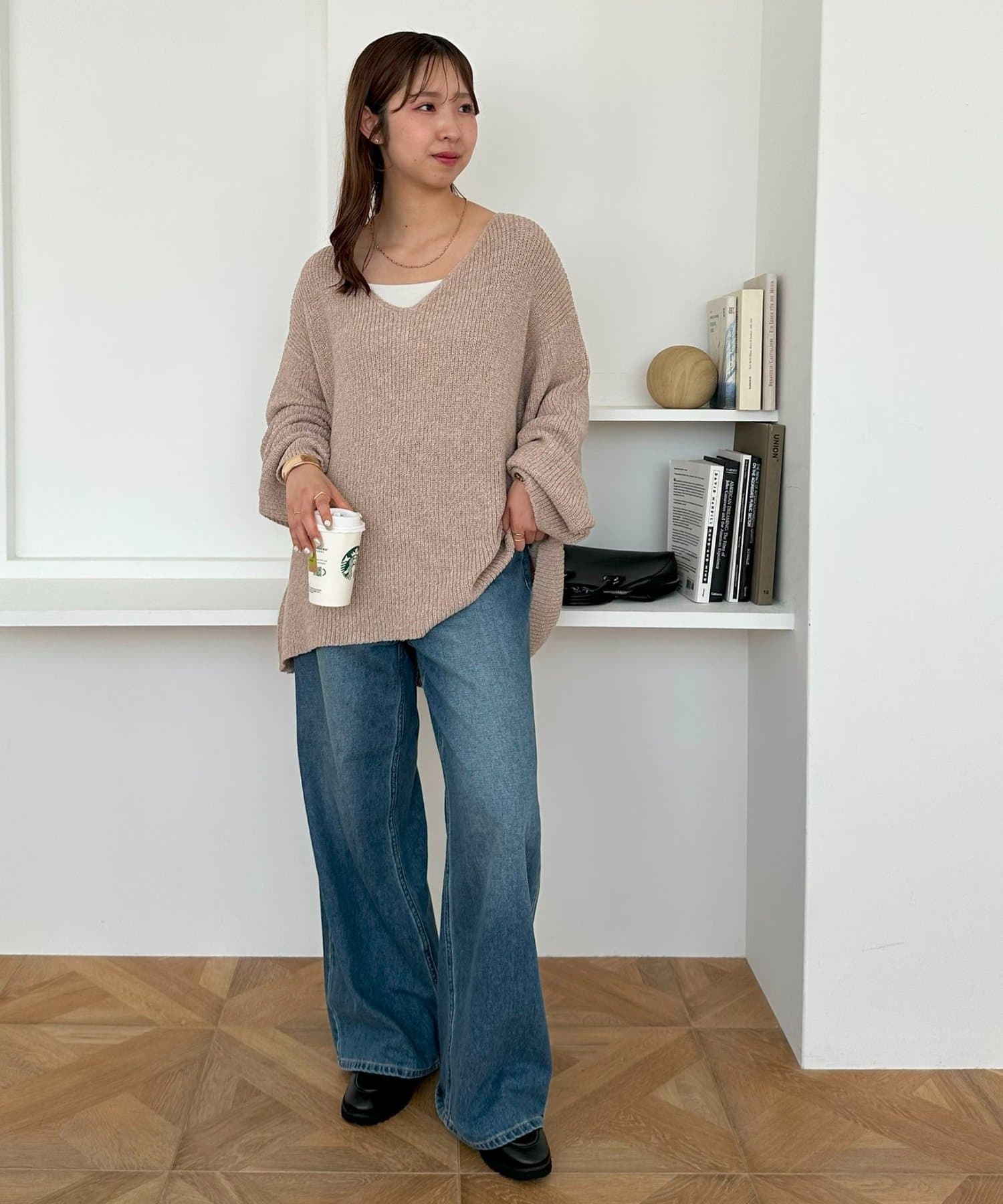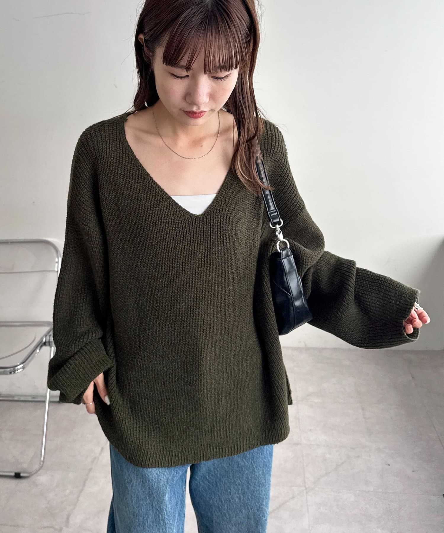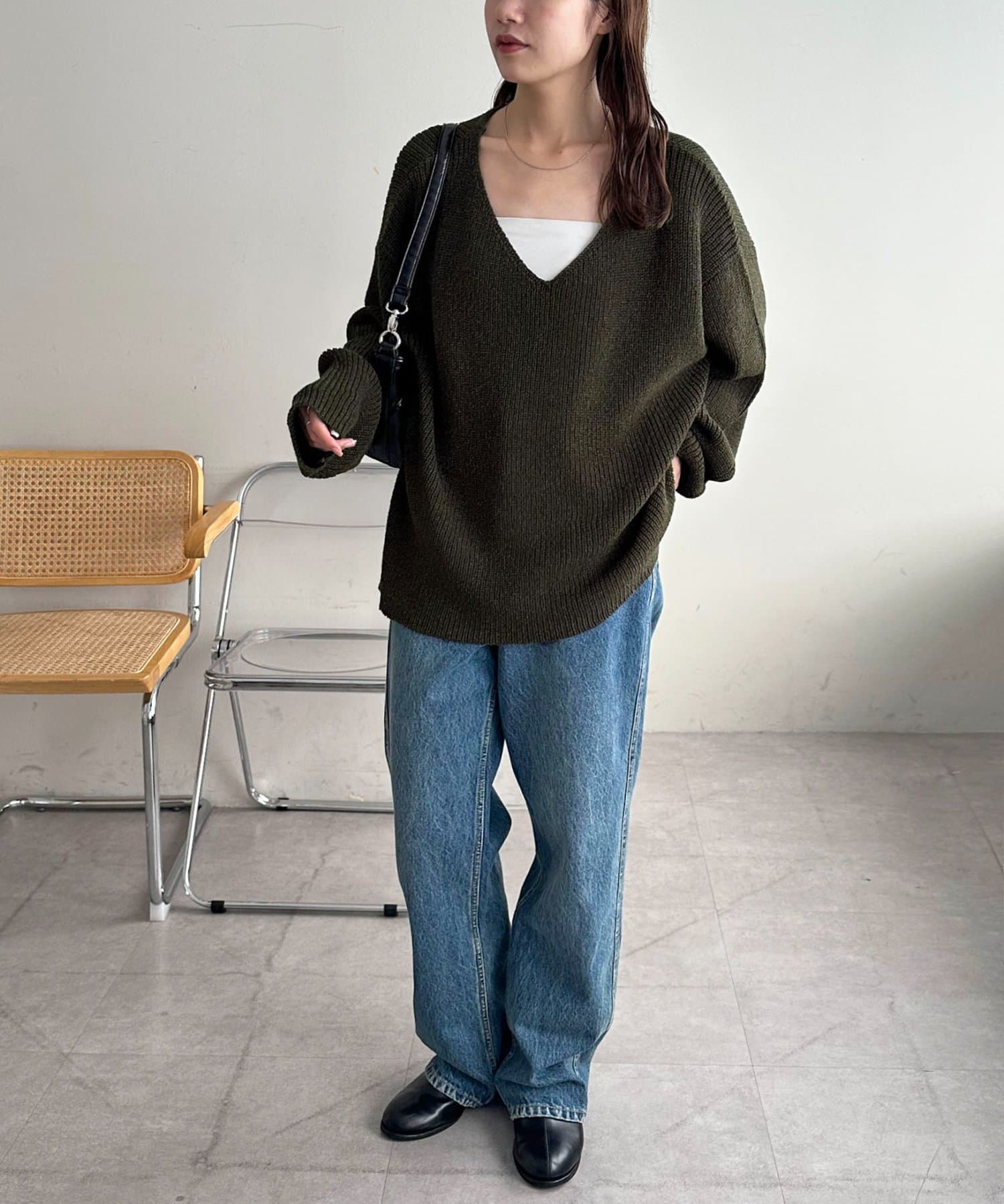 158cmレディーススタッフ:ヒップまで隠れる丈感なので、細身のボトムと合わせても安心感があります。首元のVネックデザインが顔周りをすっきりと見せてくれるので抜け感も◎