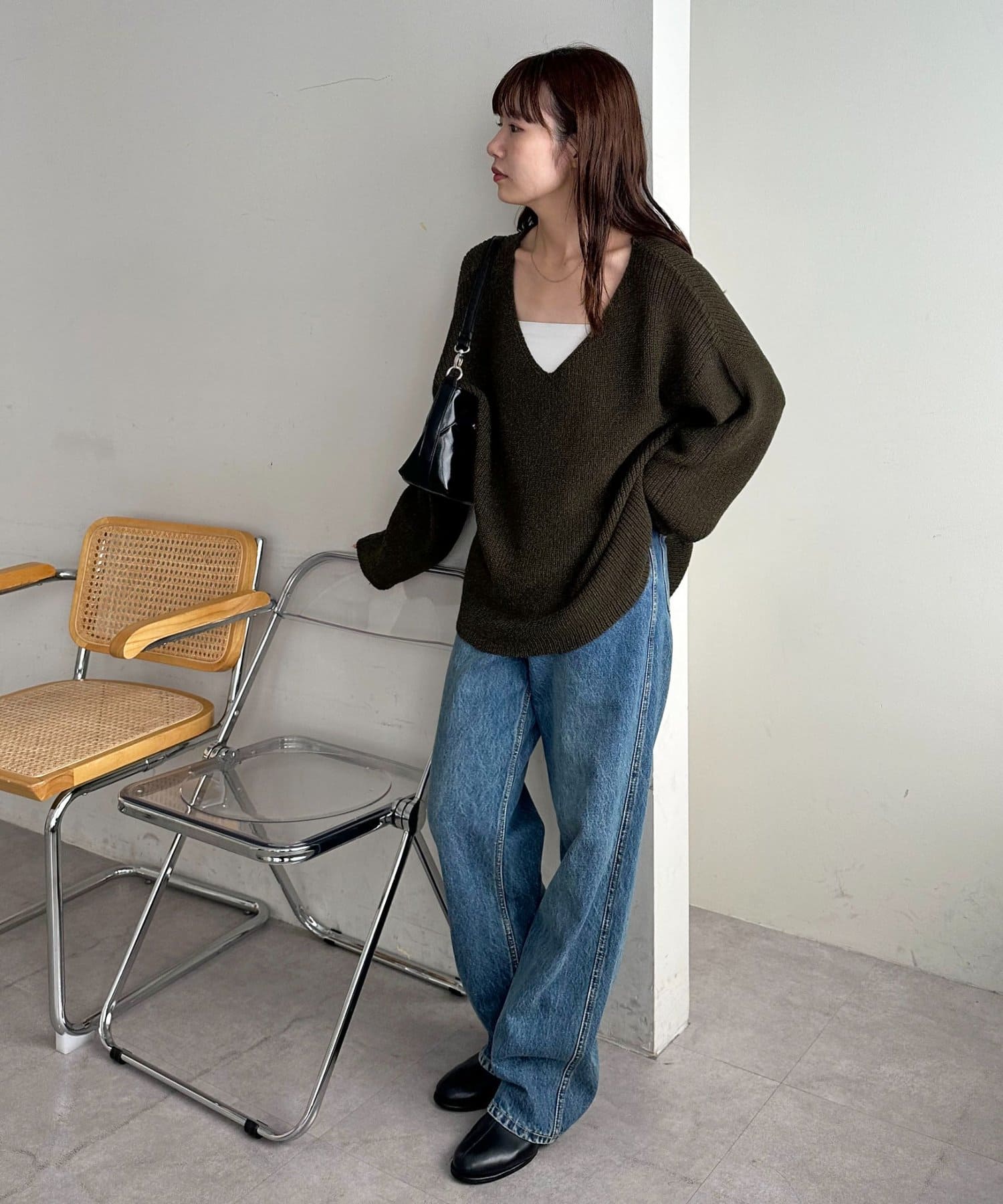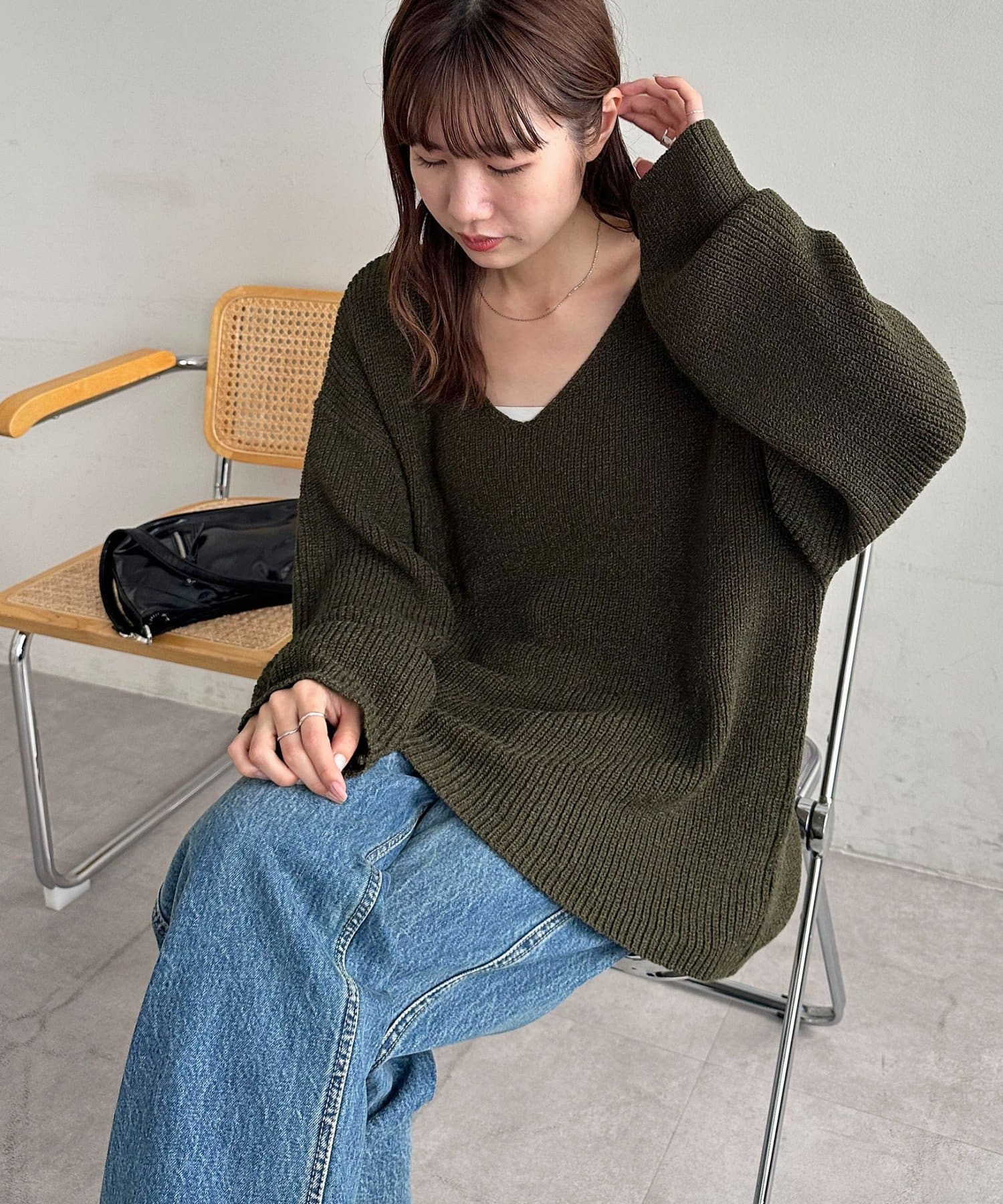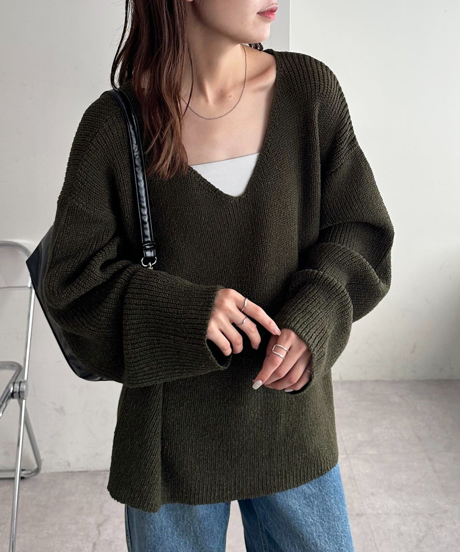 158cmレディーススタッフ:ヒップまで隠れる丈感なので、細身のボトムと合わせても安心感があります。首元のVネックデザインが顔周りをすっきりと見せてくれるので抜け感も◎
