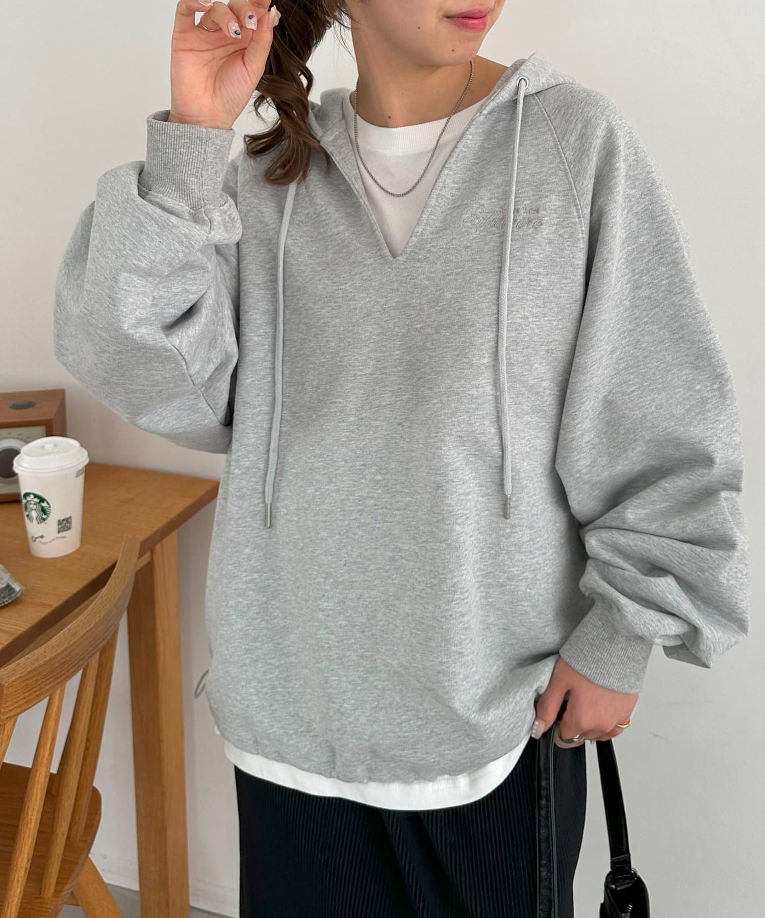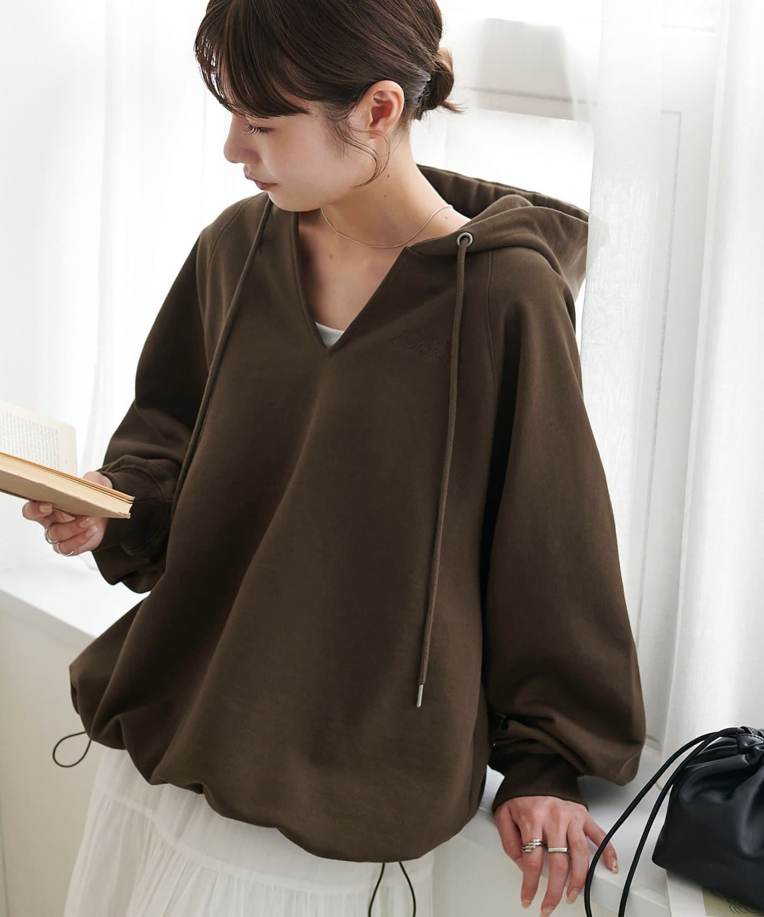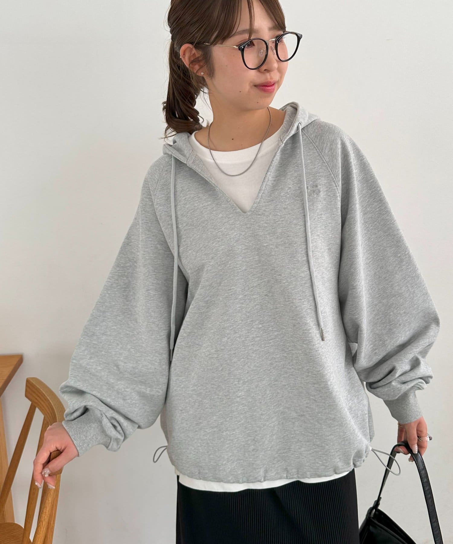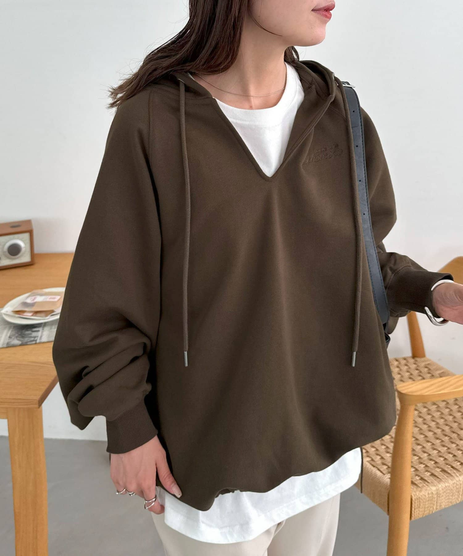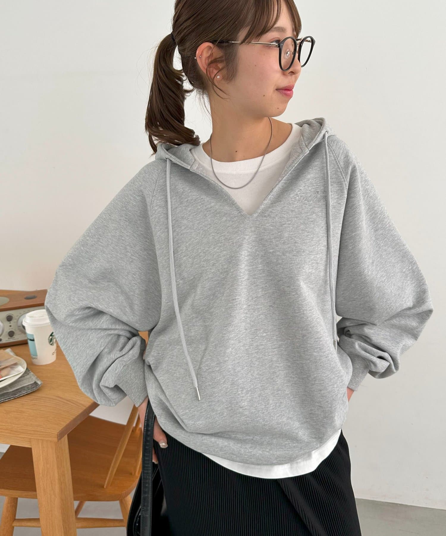 ゆったりとしたシルエットに、さりげなく抜け感を演出するVネックが特徴のフーディ。