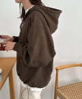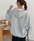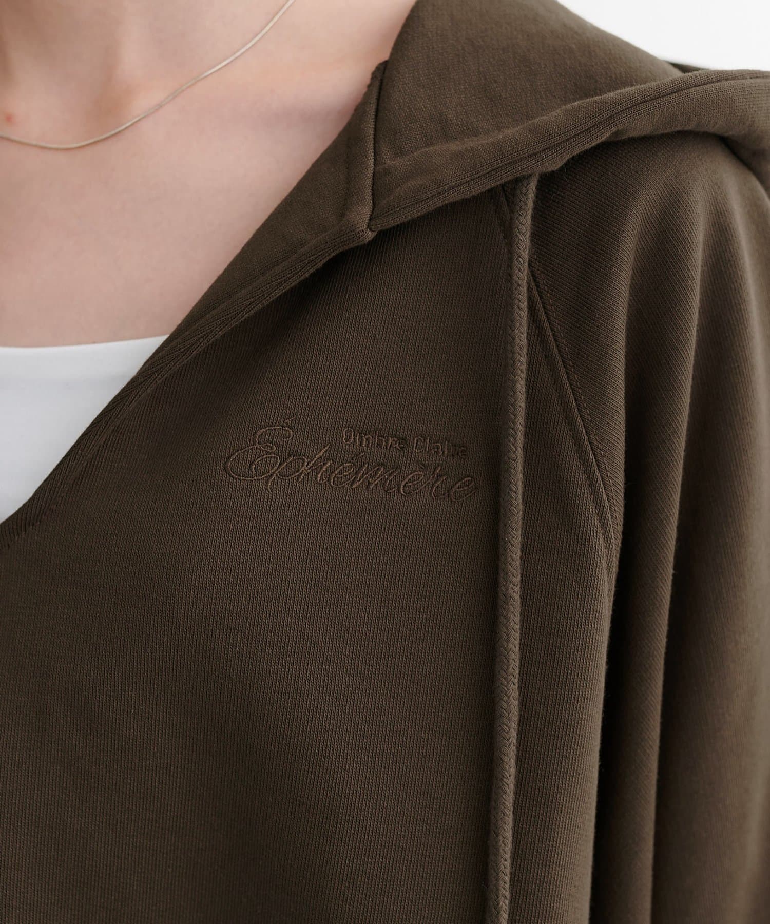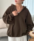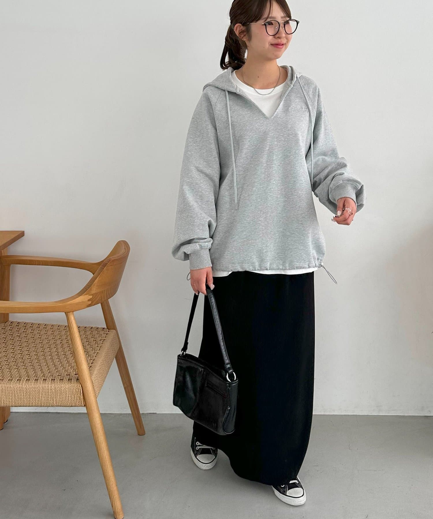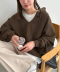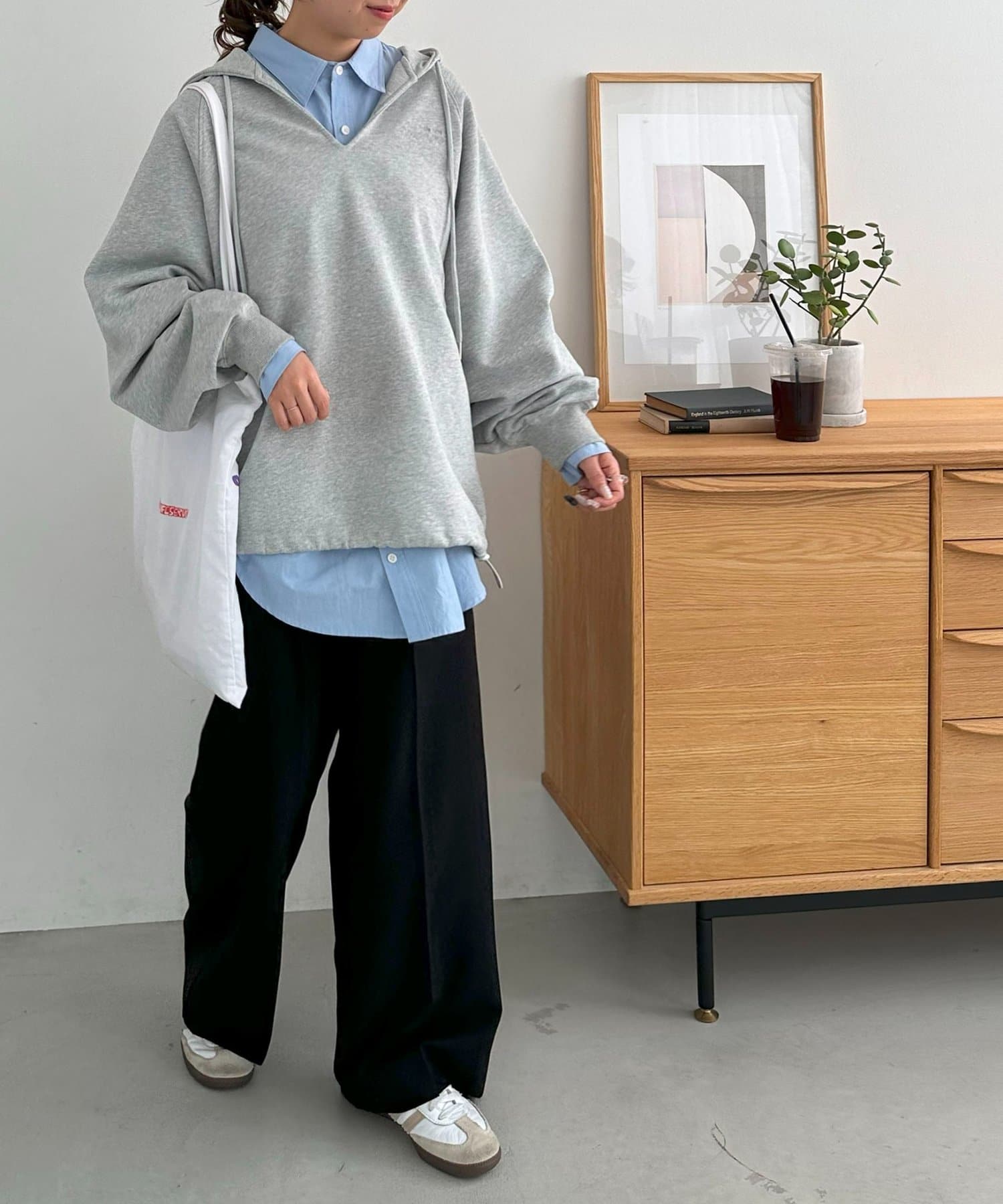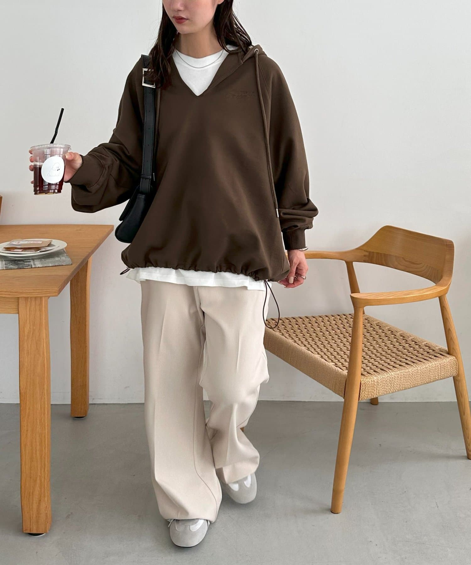 ゆったりとしたシルエットに、さりげなく抜け感を演出するVネックが特徴のフーディ。