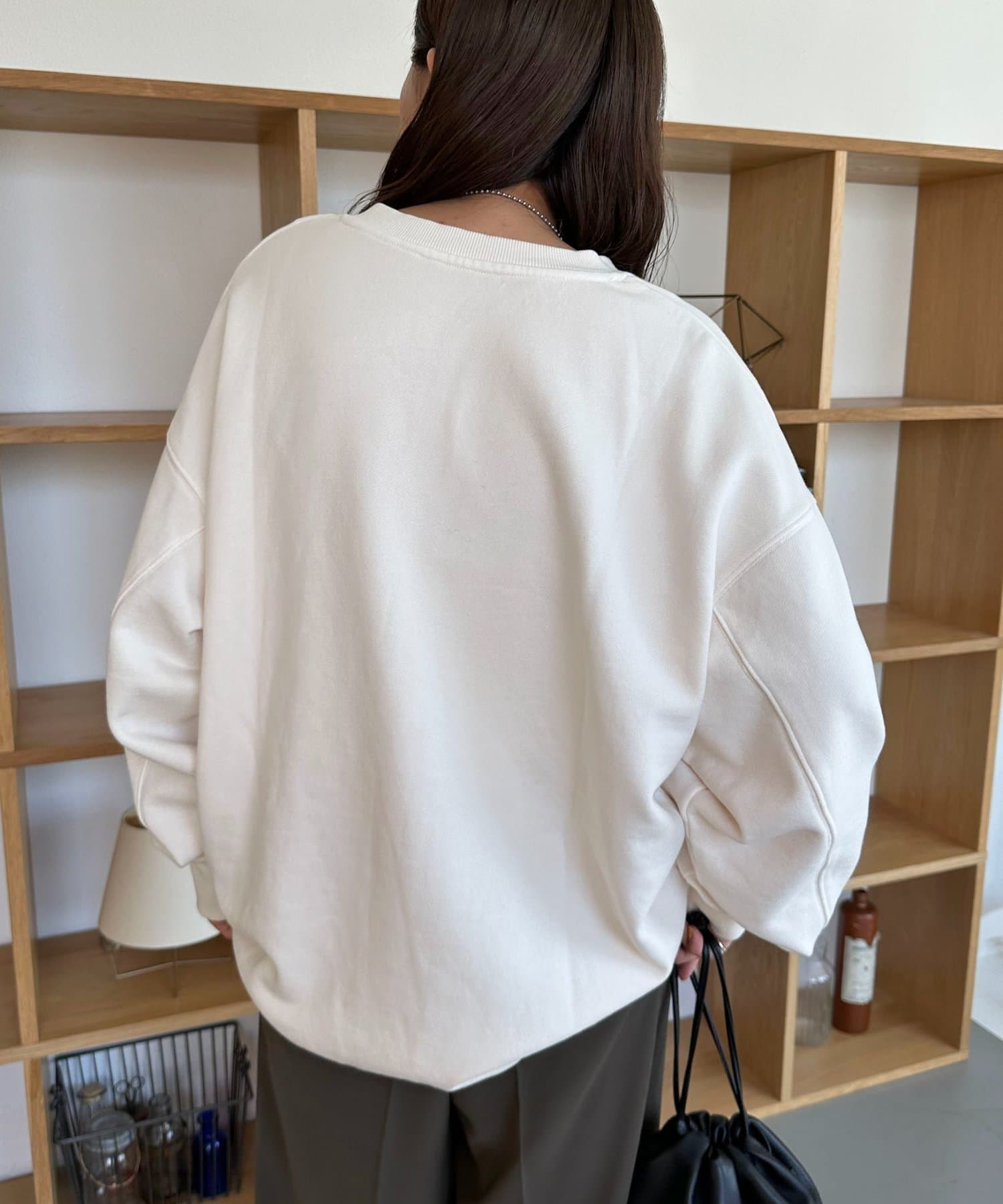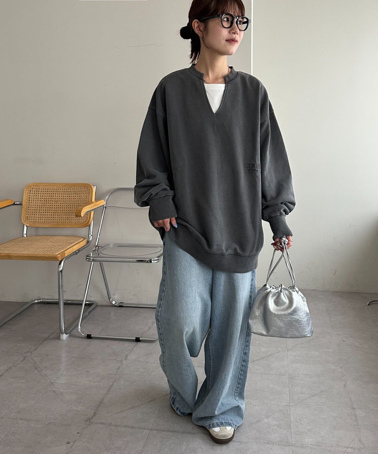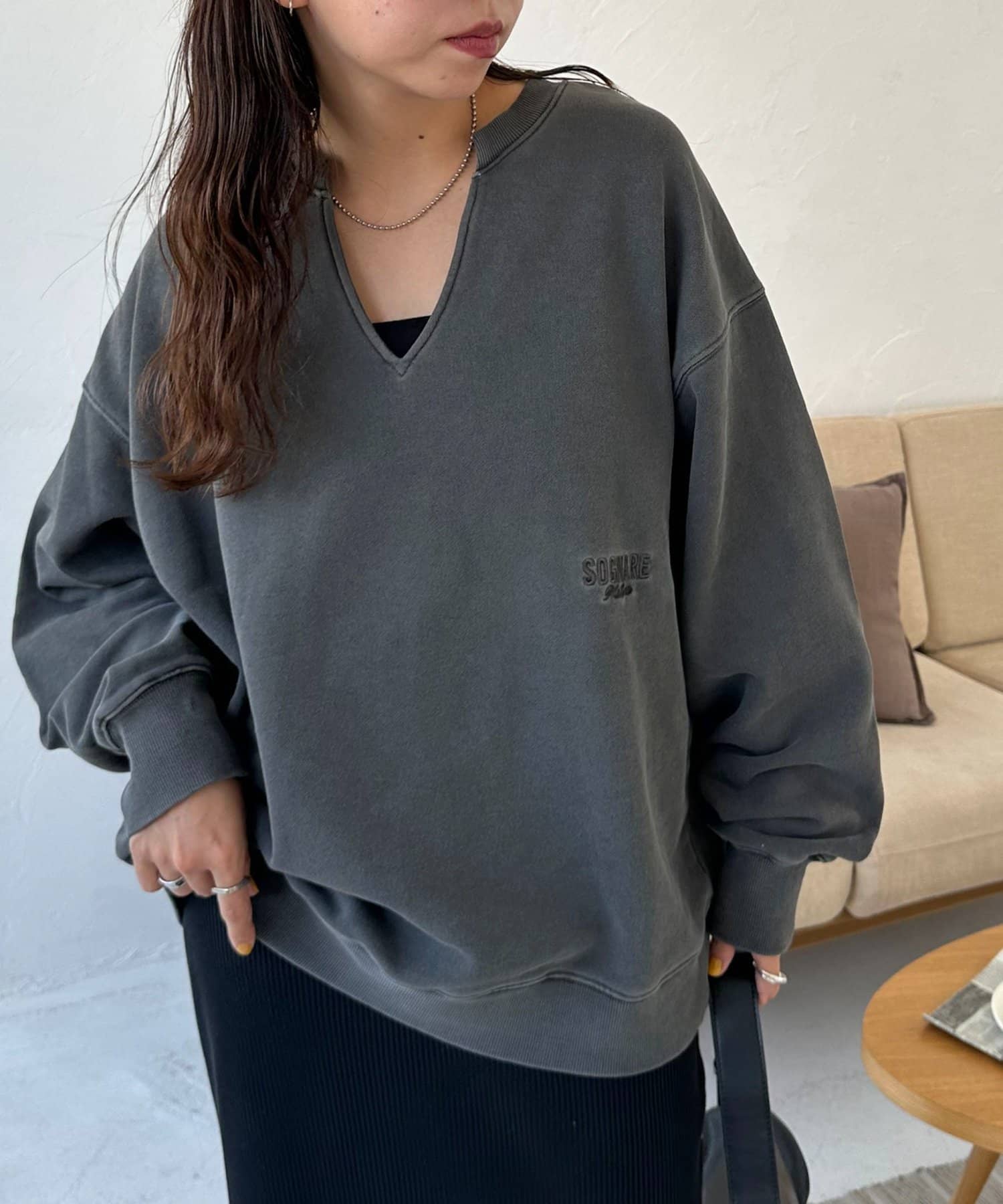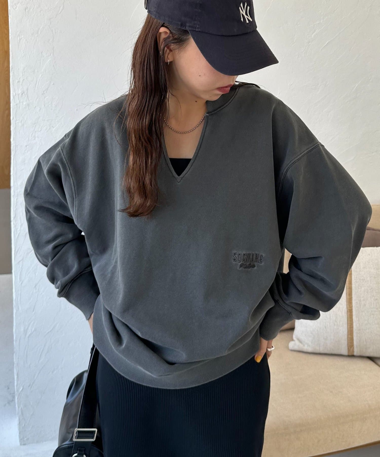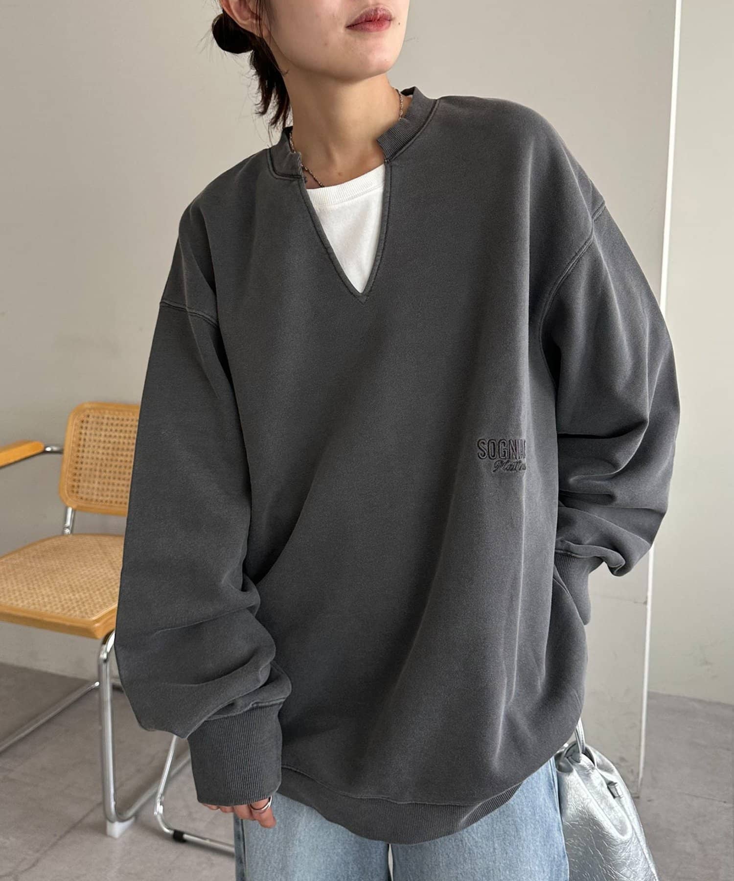 【首元スッキリ、抜け感♪/ユニセックス】ワンポイント刺繍ピグメントスキッパースウェット
