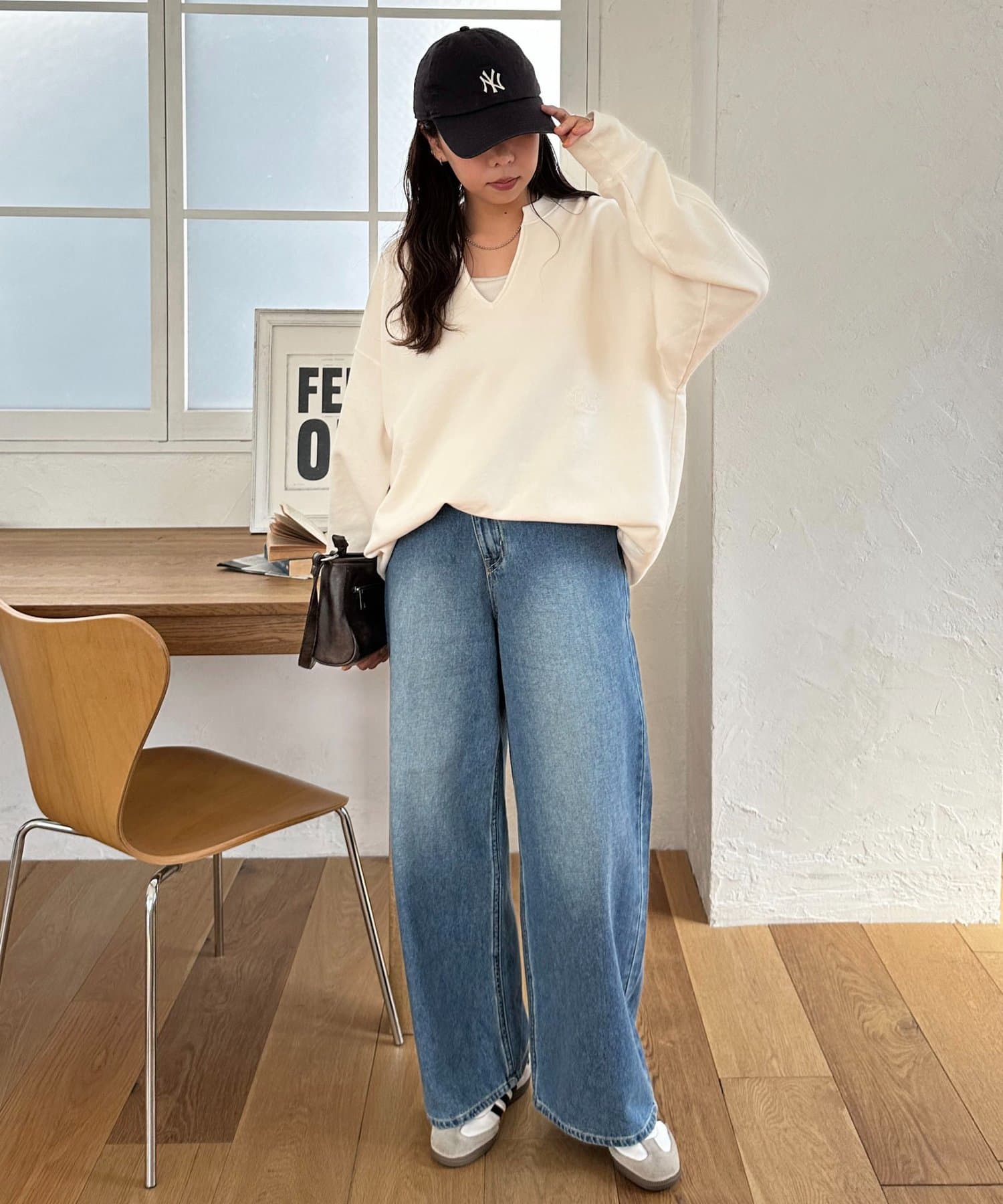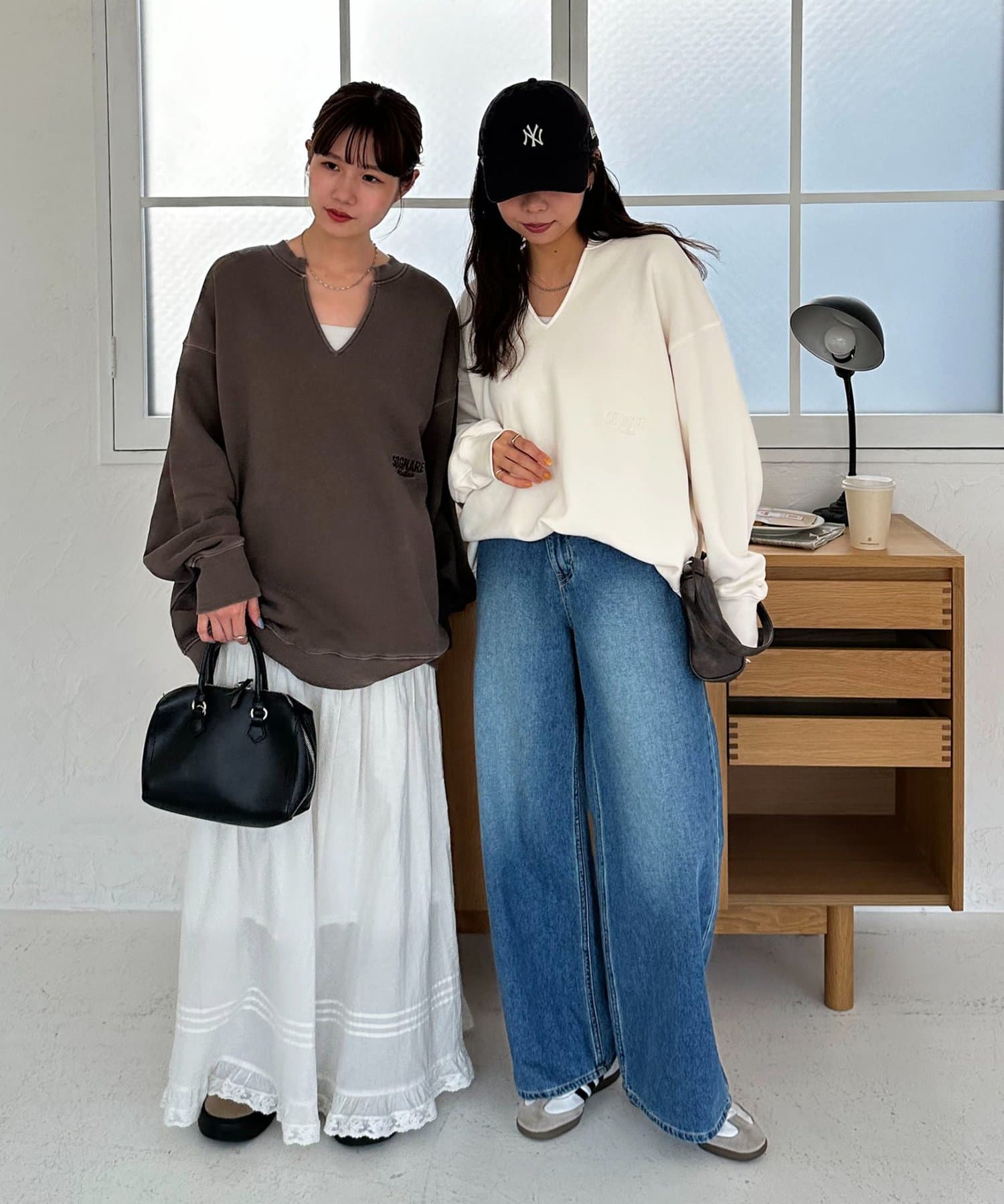 デニムやワイドパンツに合わせてラフにまとめたり、スカートと合わせてカジュアルミックスなスタイルも◎
