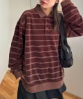 細めボーダーとポロ襟の組み合わせで、ラフに着られるのに程よくおしゃれ感のある1枚。