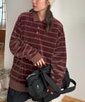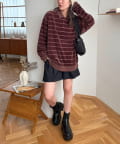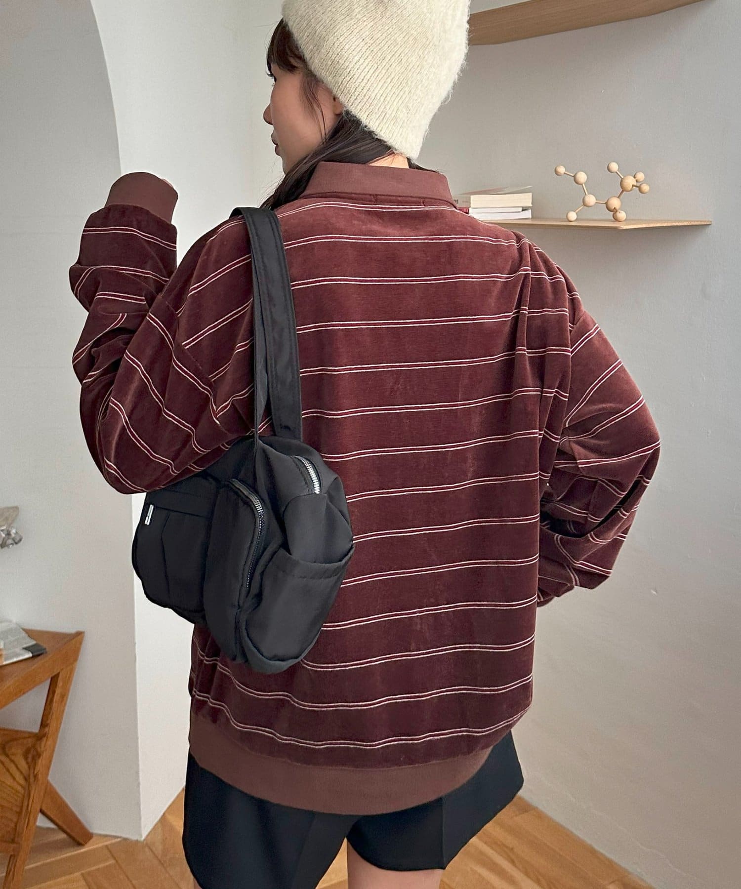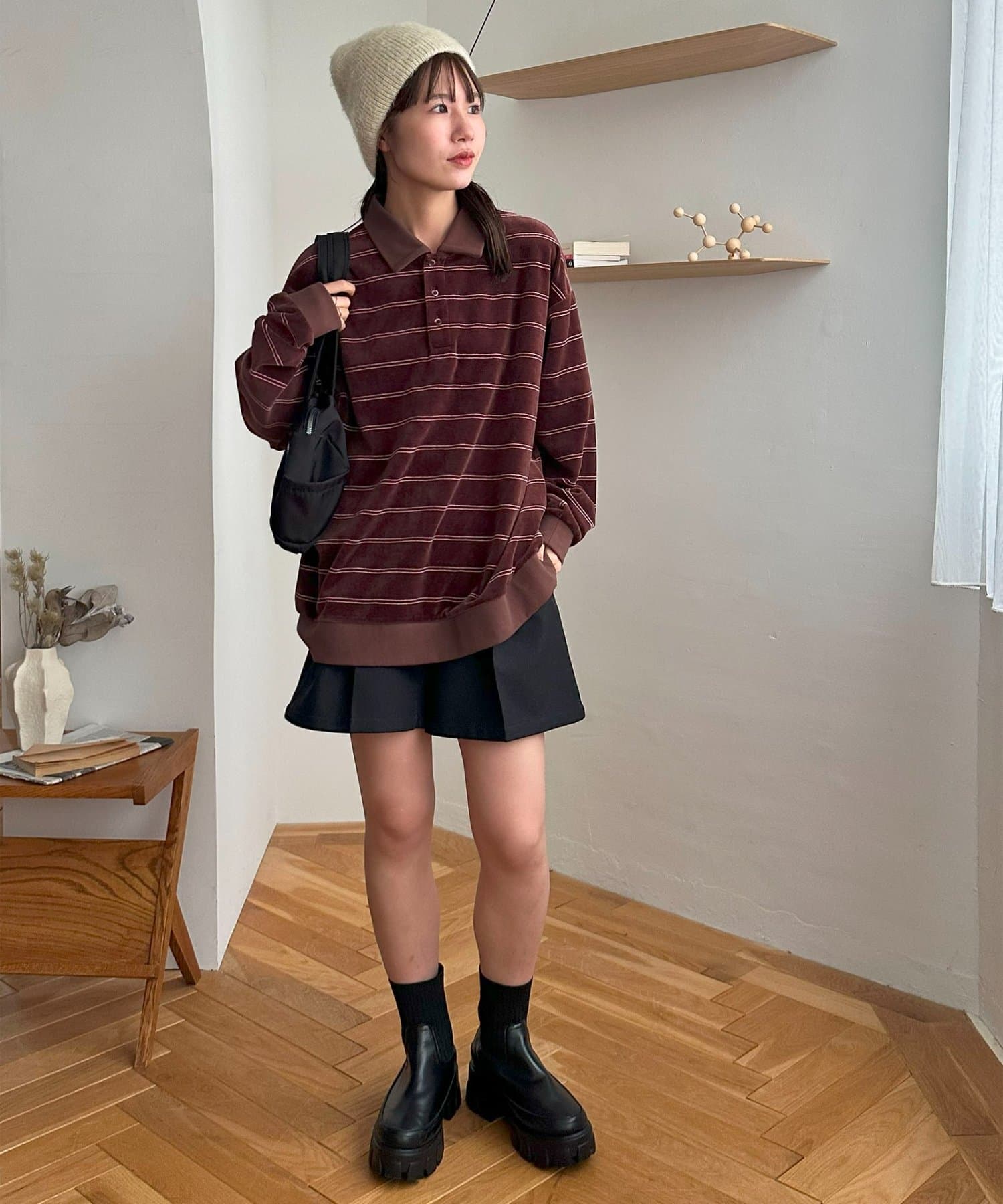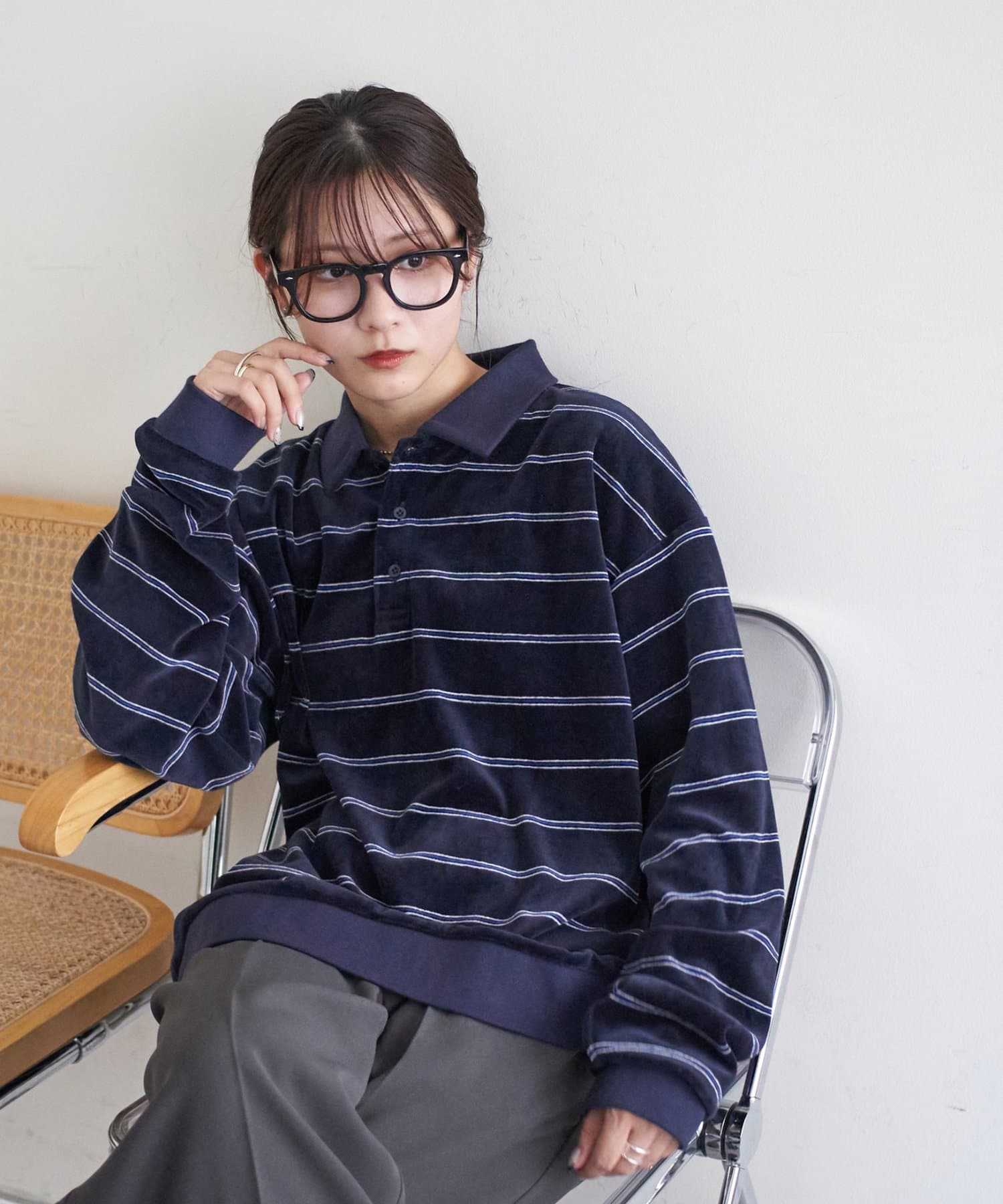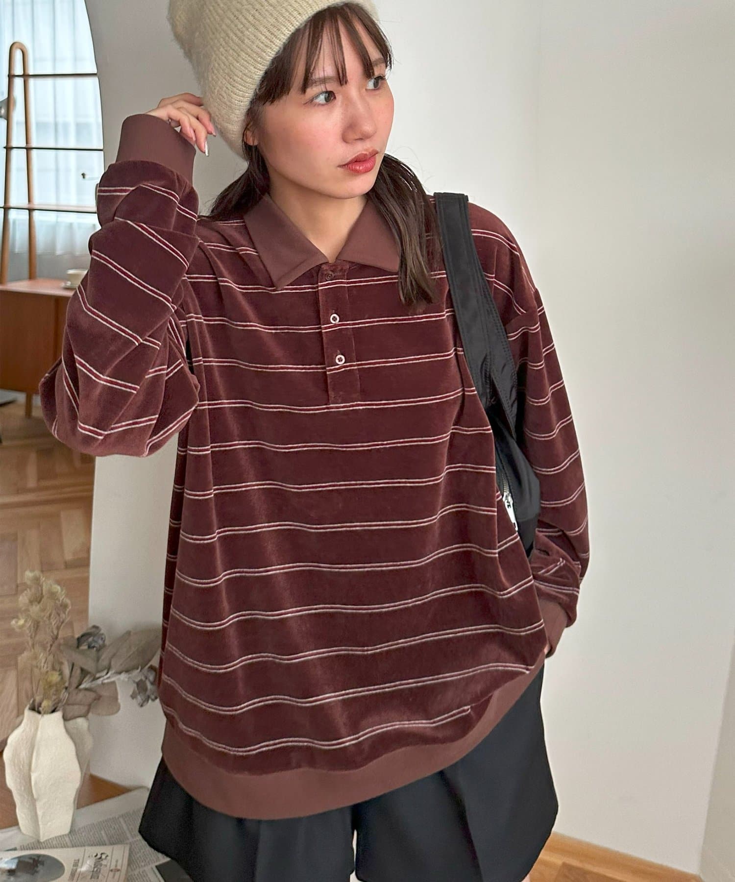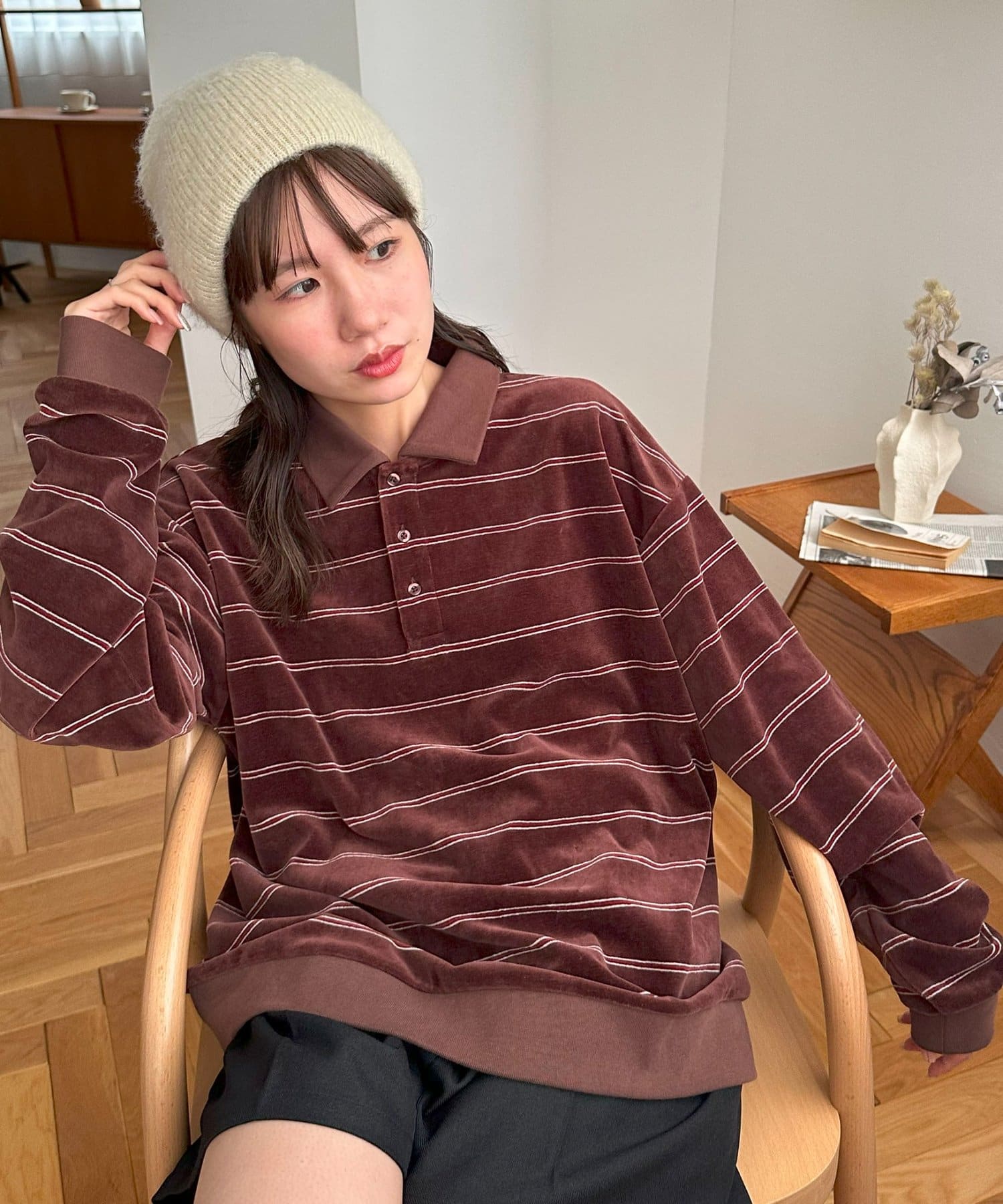 光沢ベロアで差がつく、ゆるカジュアルベロアボーダーポロ
