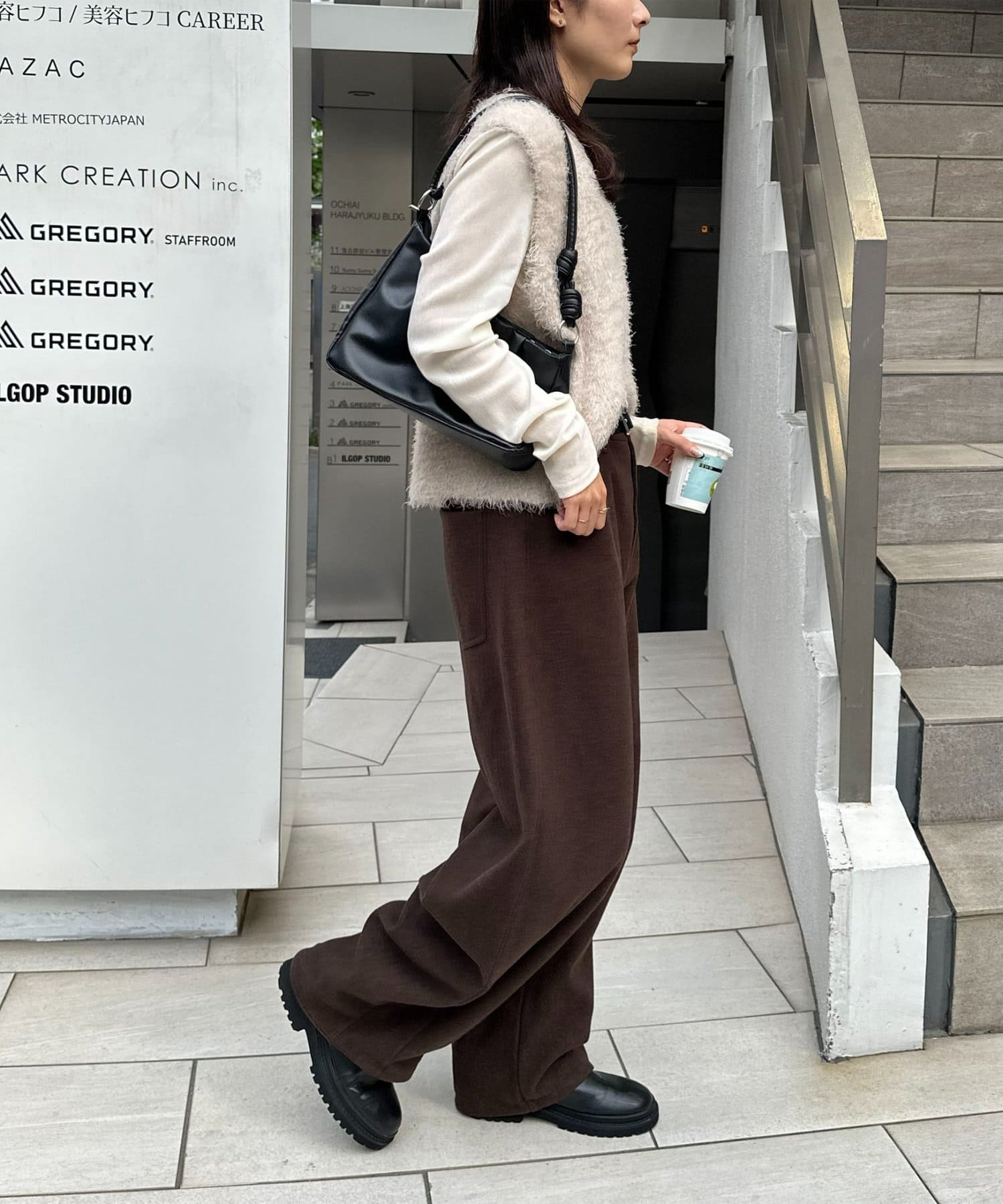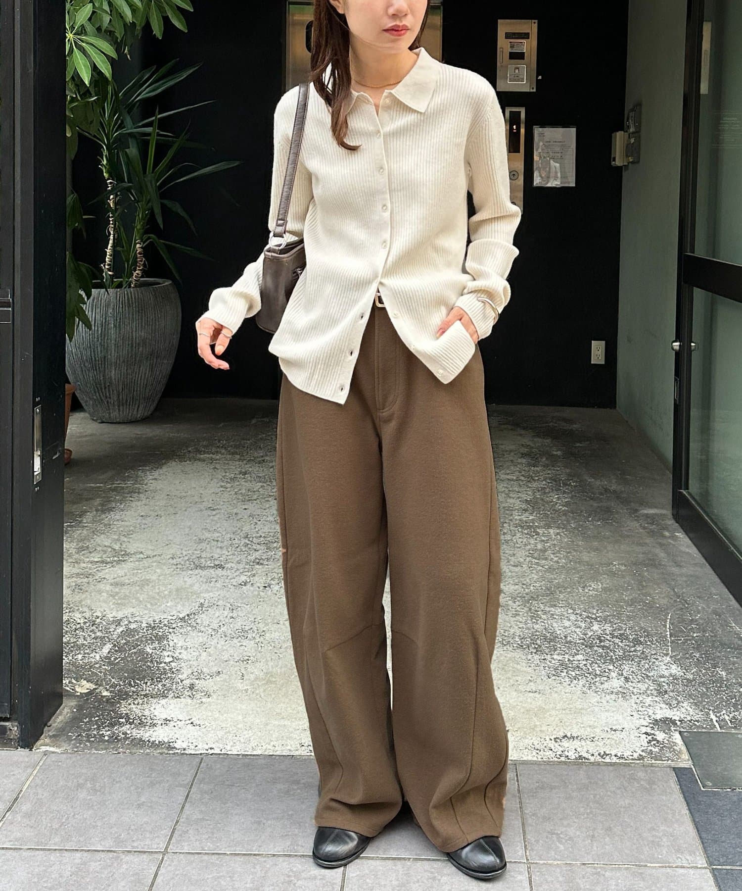 シンプルなリブニットにステンカラーのコートを合わせるときちんと感の中に抜け感のあるコーデが完成。