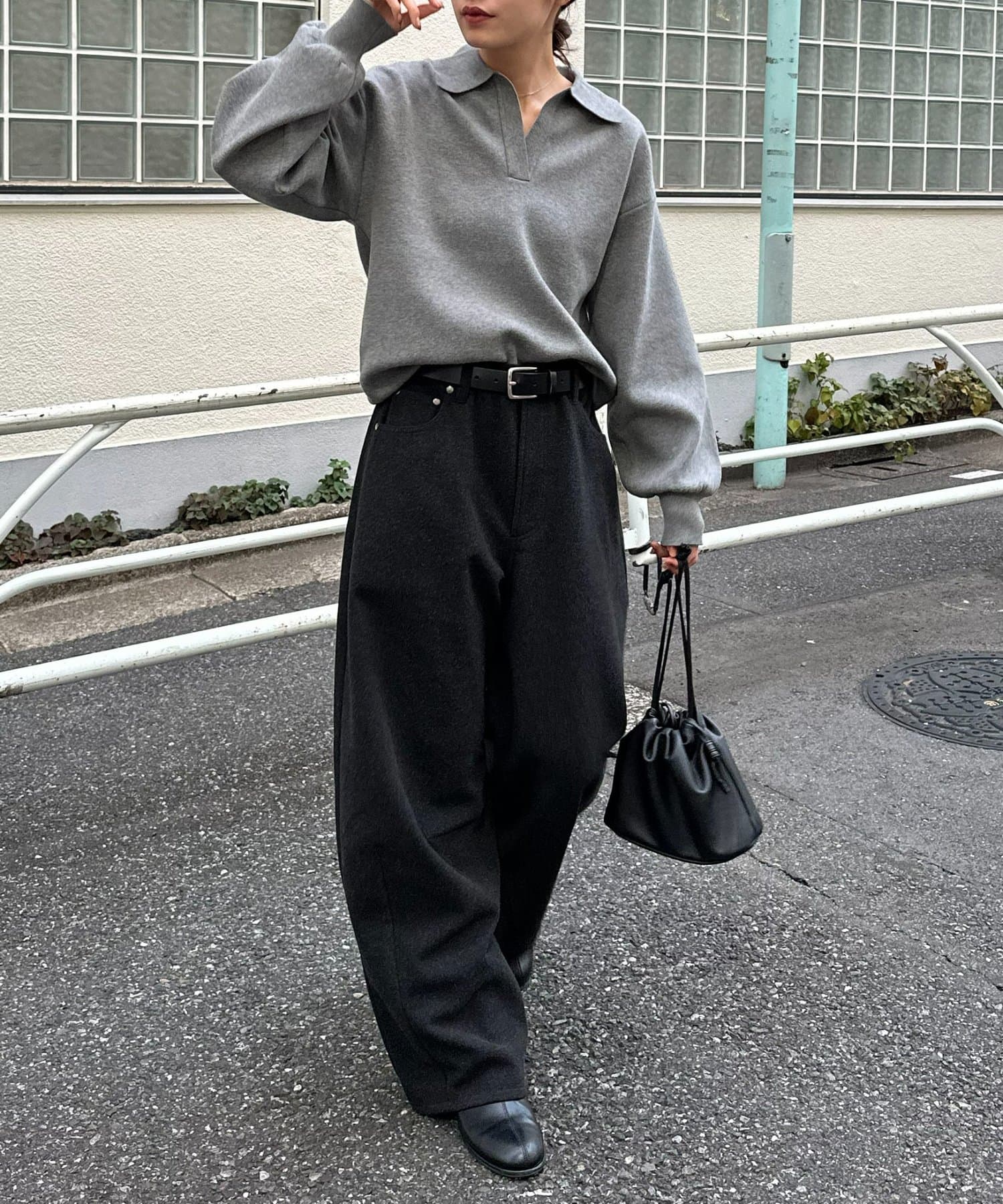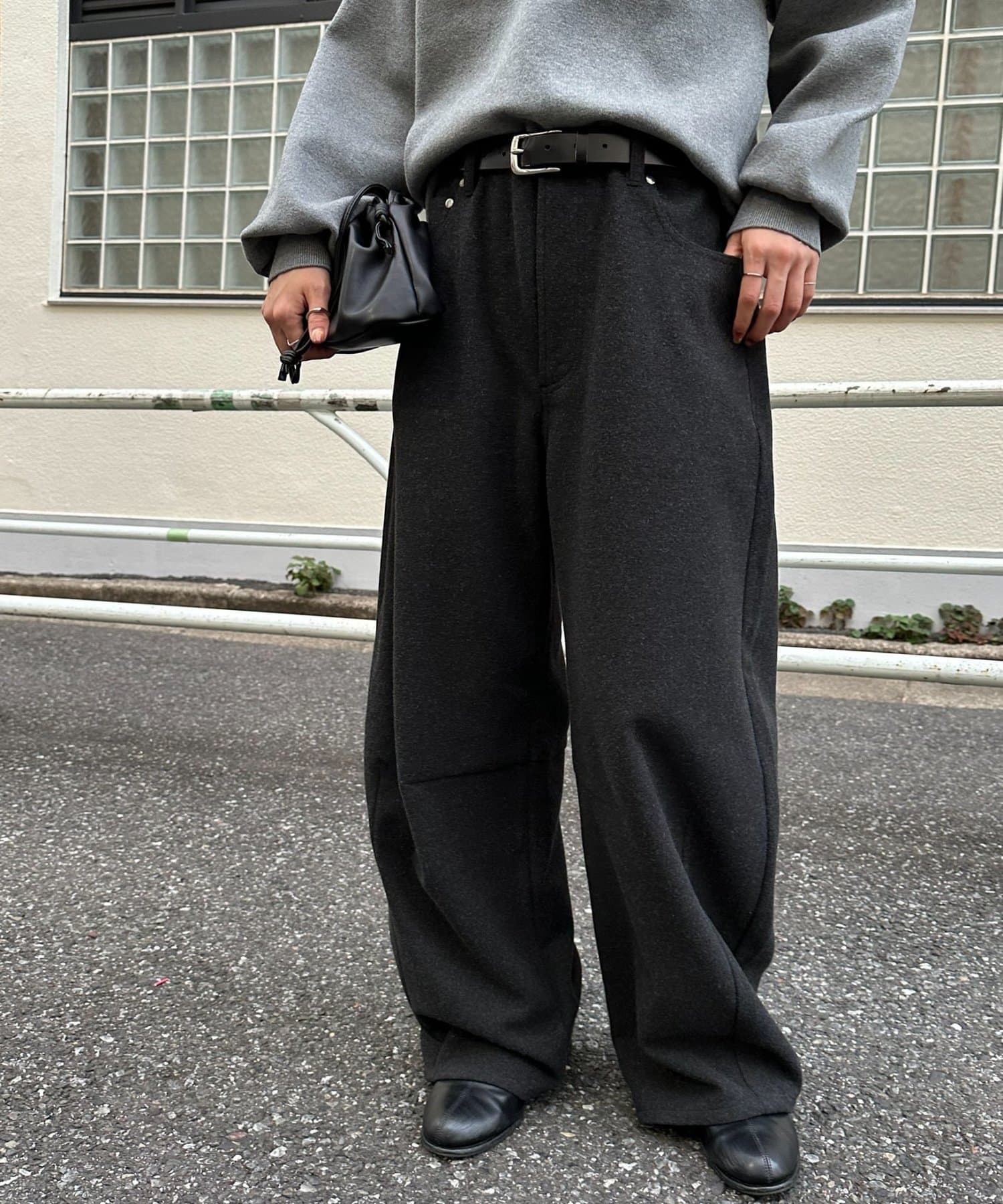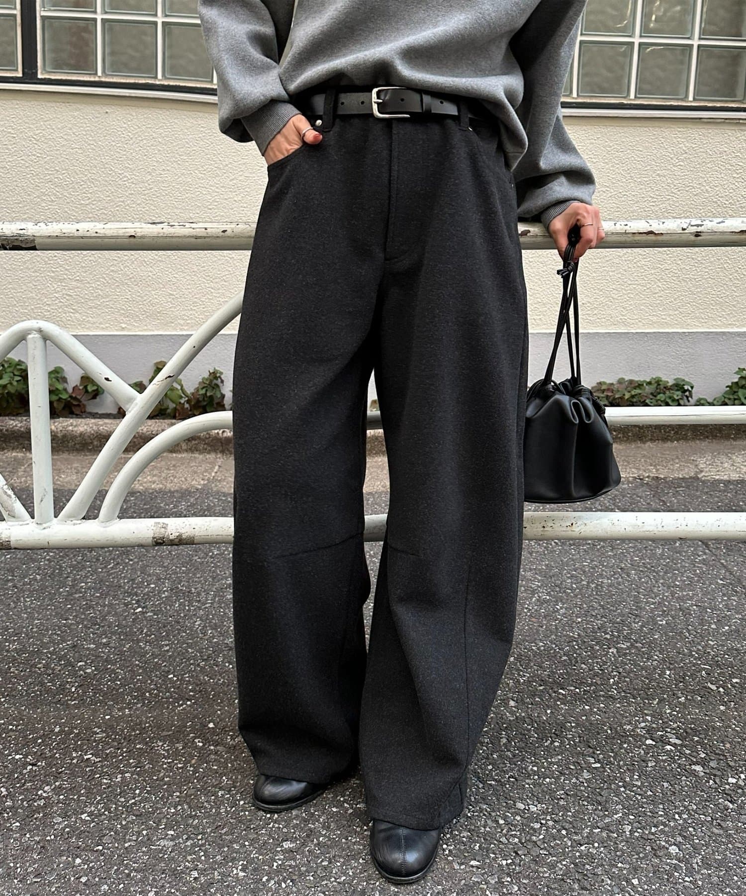 上品なウールライク素材で仕立てた、程よく丸みのあるバレルシルエットが魅力のユニセックスパンツ。
