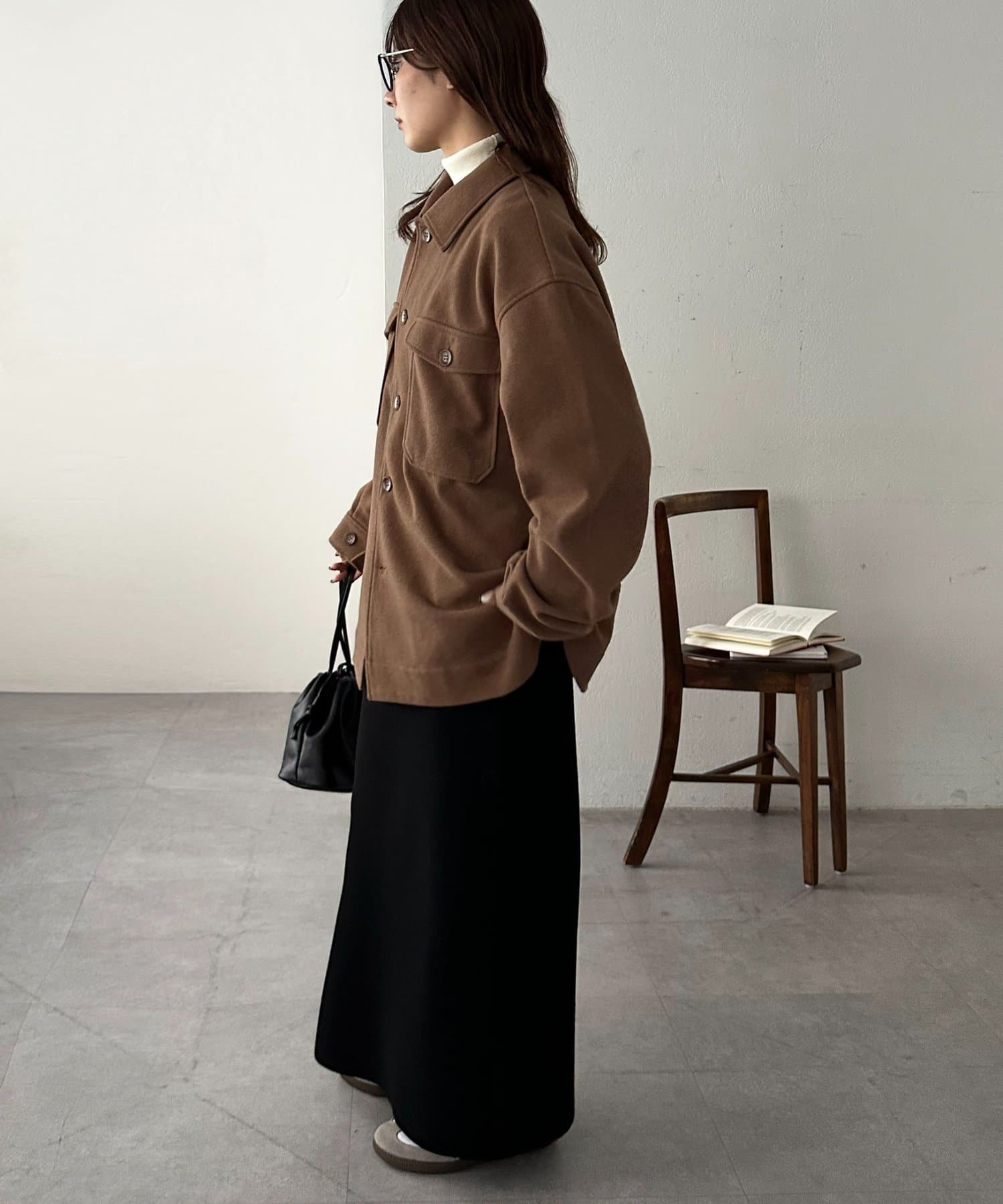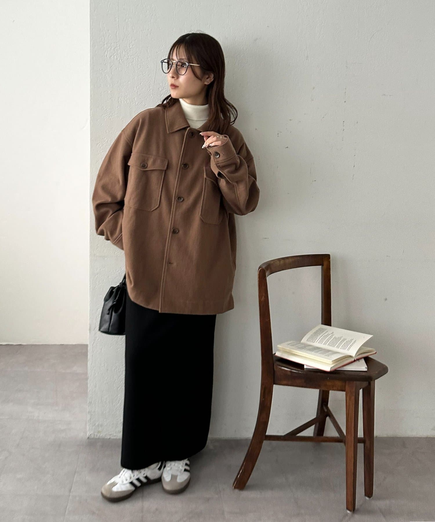 シャツのようにも着れるジャケットなので、スラックスパンツやナロースカートを合わせるとコーデが締まり、キレイメな印象に◎
