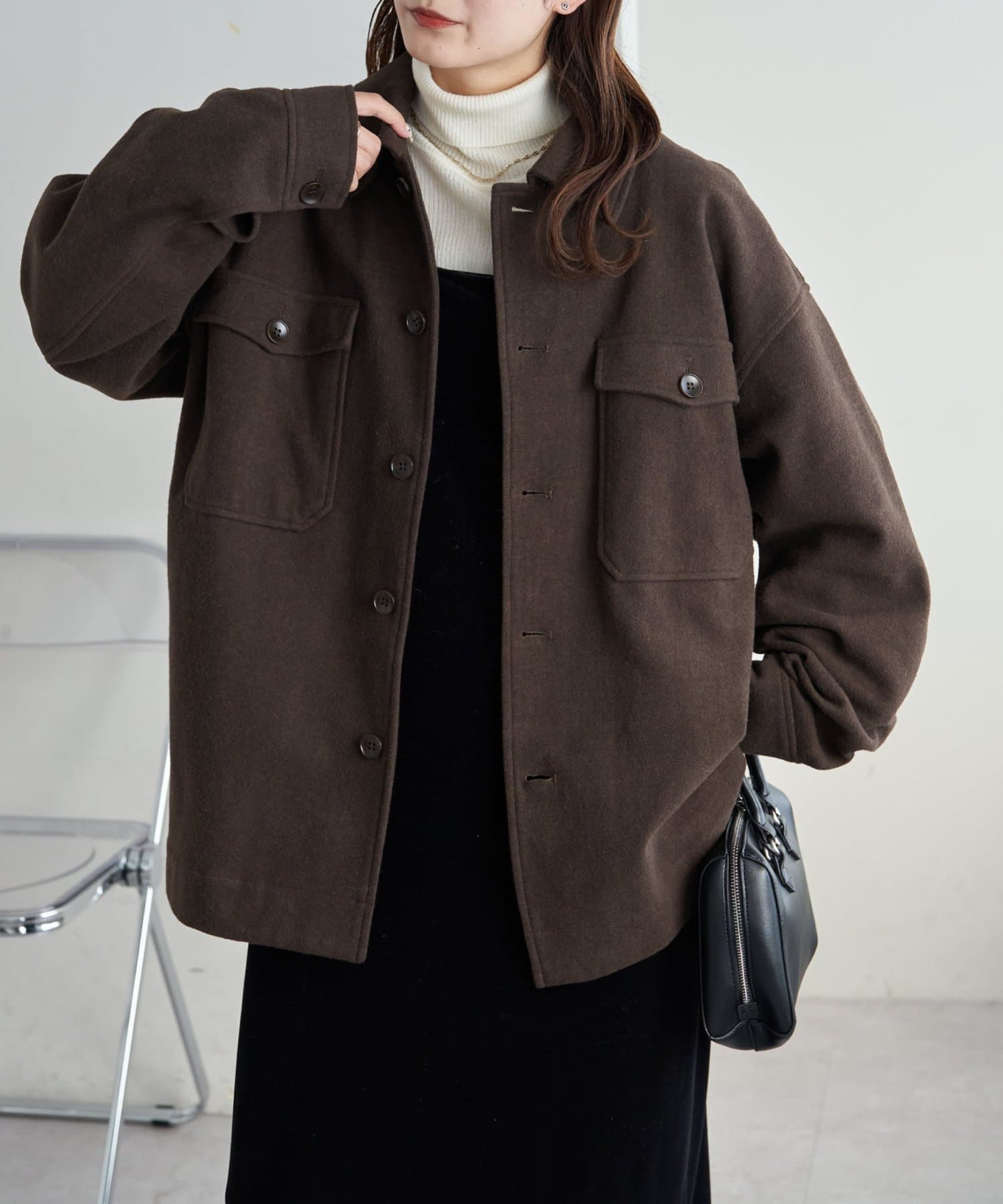 シャツのように気軽に羽織れるジャケットは、ウールのような暖かみがあるウールライク素材を使用したことでアウターとしても活躍◎