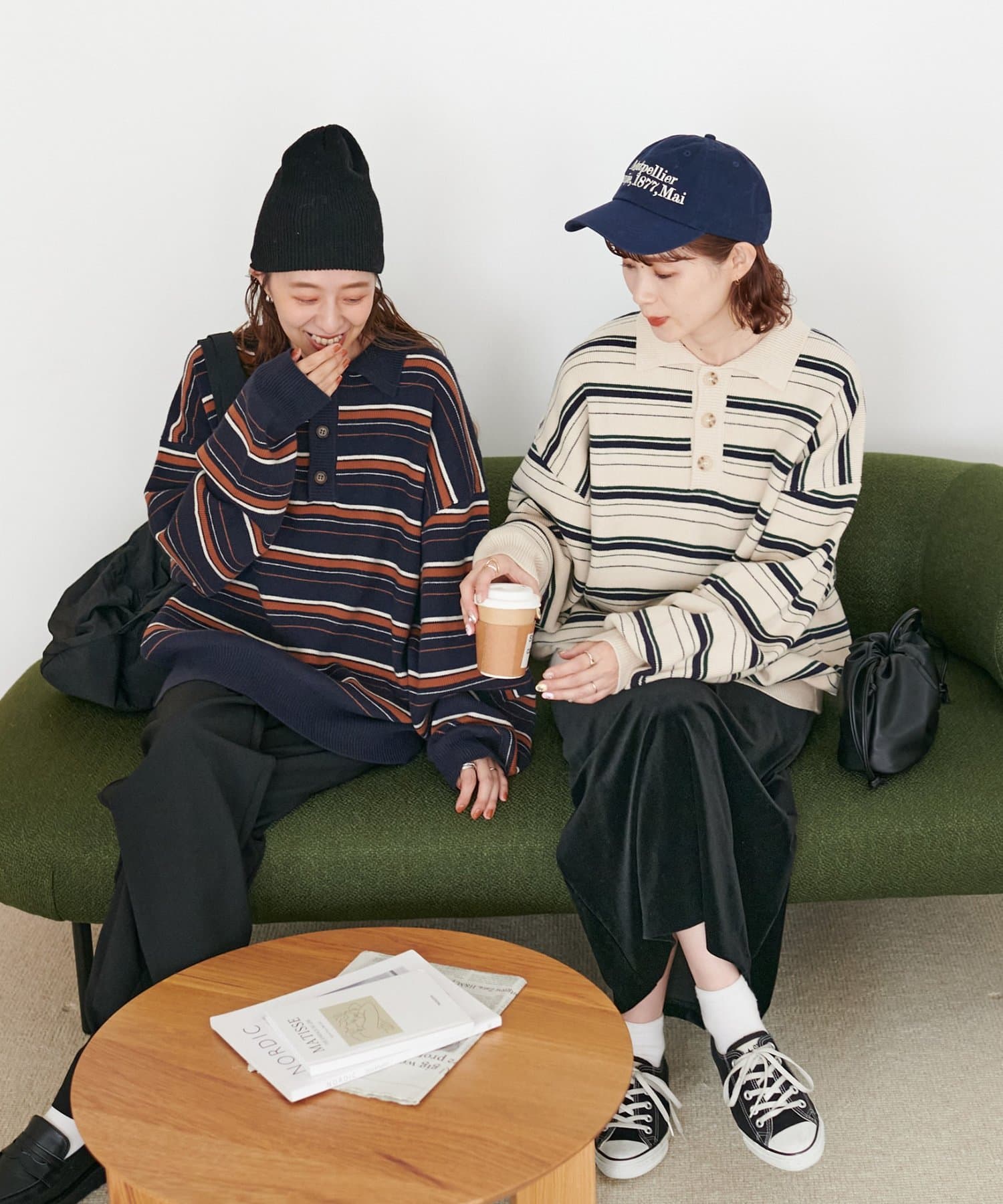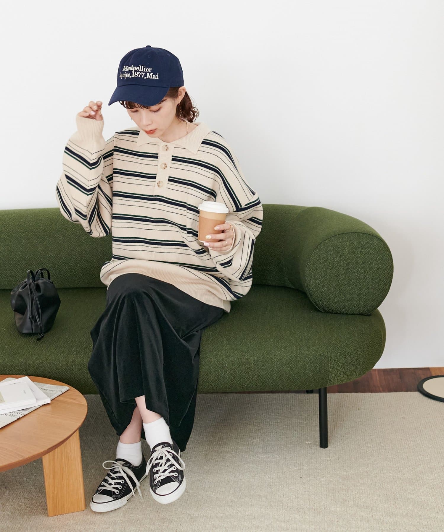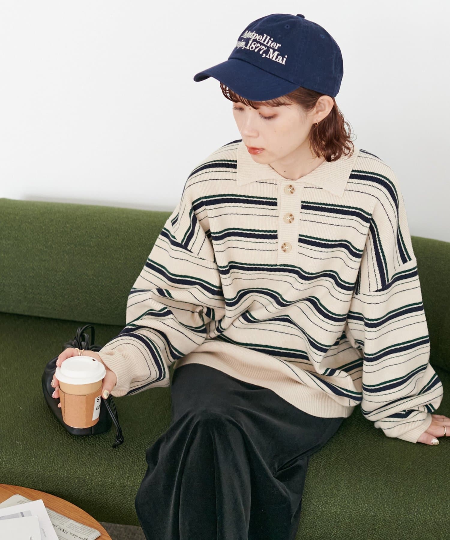複数のラインを組み合わせたマルチボーダーデザインが目を惹くニットポロ。シンプルで上品なデザインが大人も着やすく、落ち着いた印象に。ゆったりとしたシルエットでリラックス感のある一枚です。インナーや首周りのボタン使いなどの、ちょっとした着こなし方の違いで雰囲気を変えて着用できます♪