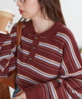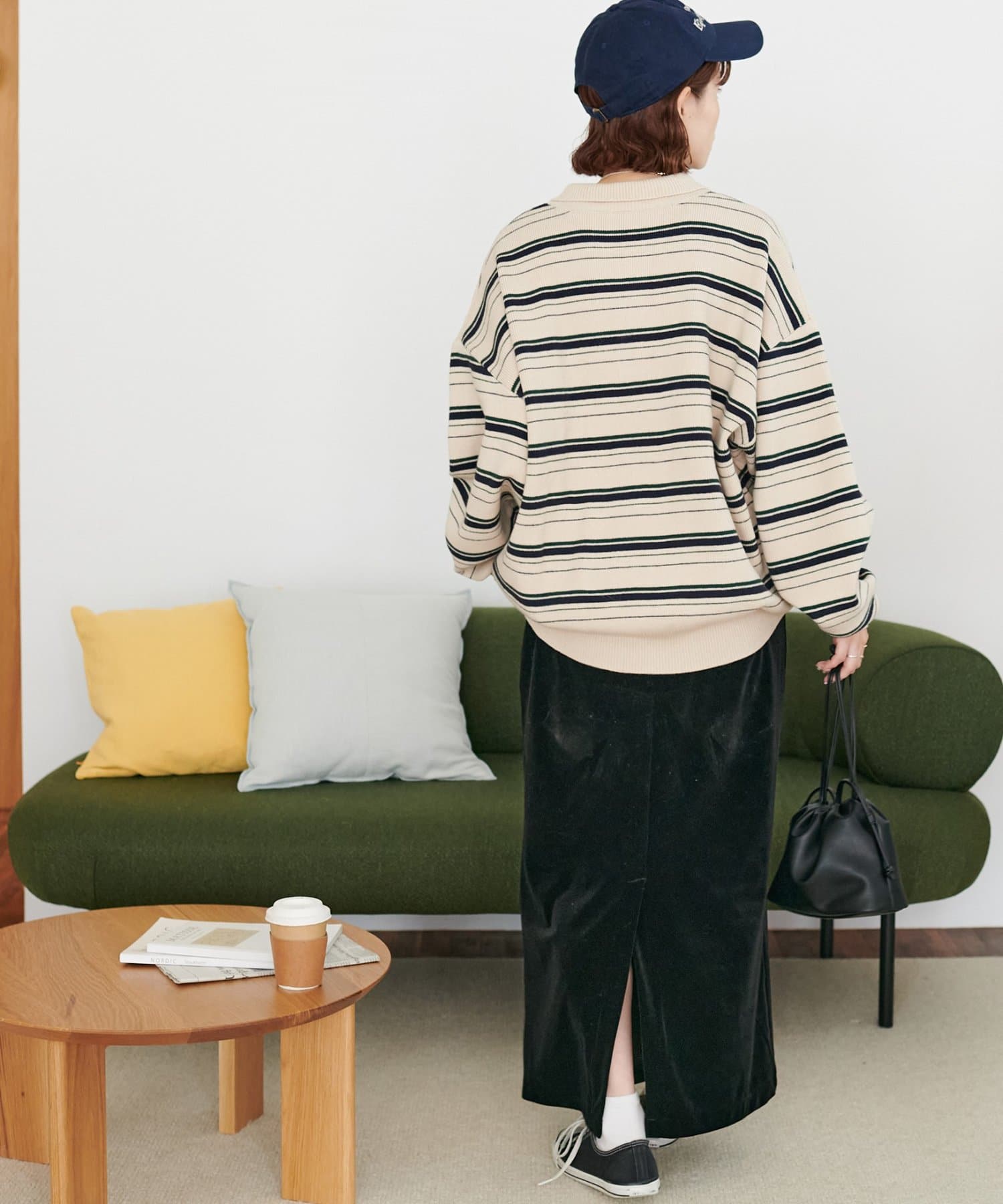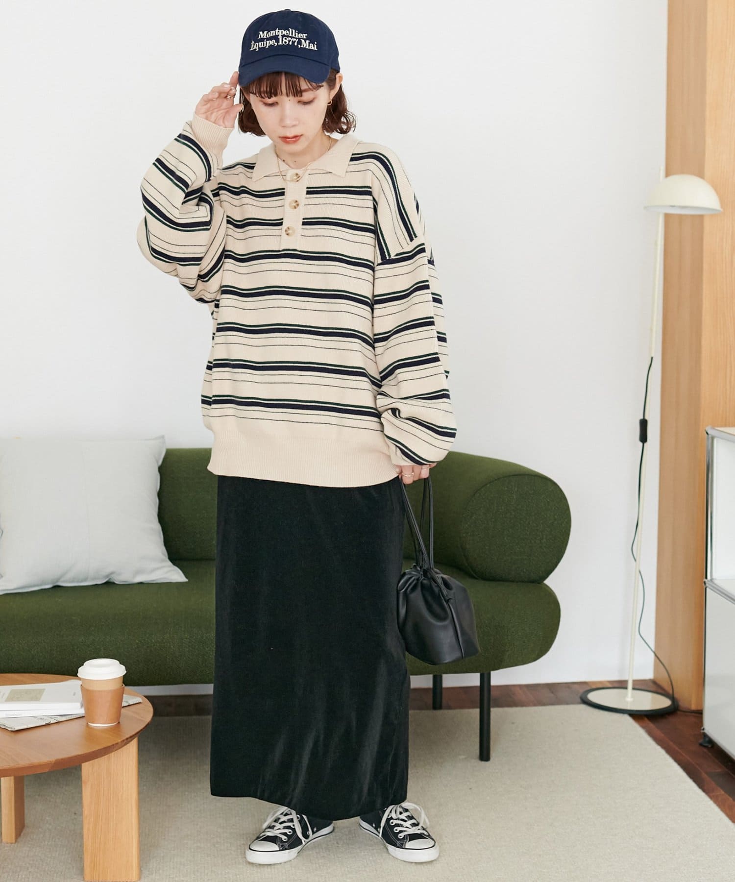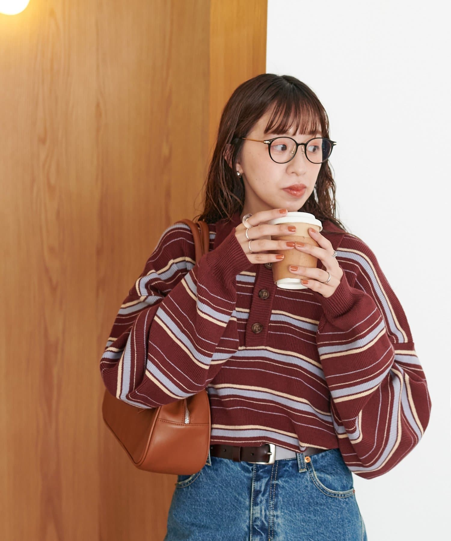 複数のラインを組み合わせたマルチボーダーデザインが目を惹くニットポロ。シンプルで上品なデザインが大人も着やすく、落ち着いた印象に。ゆったりとしたシルエットでリラックス感のある一枚です。インナーや首周りのボタン使いなどの、ちょっとした着こなし方の違いで雰囲気を変えて着用できます♪
