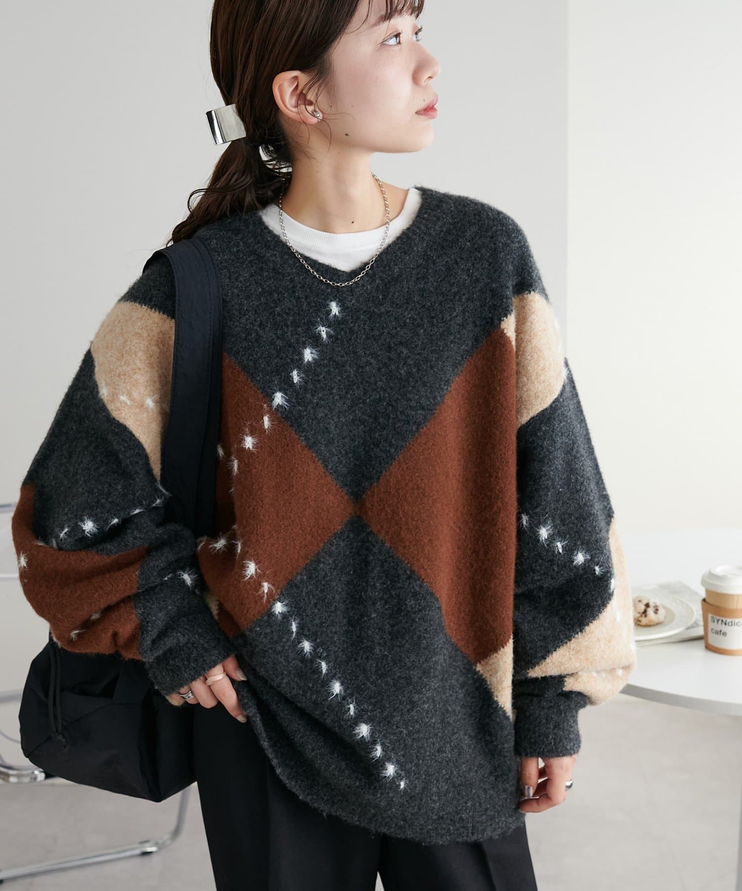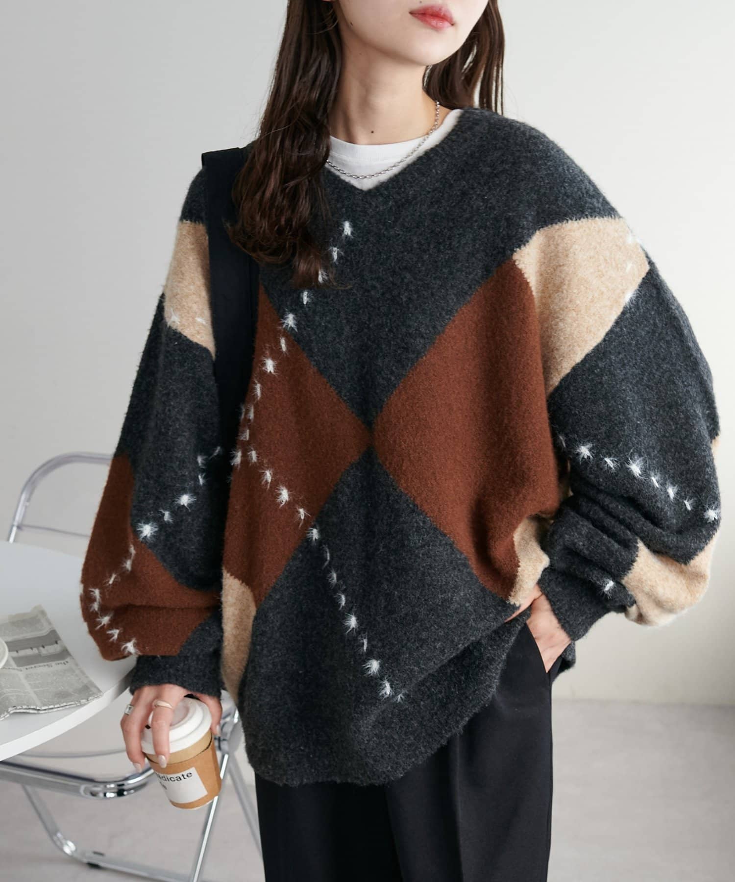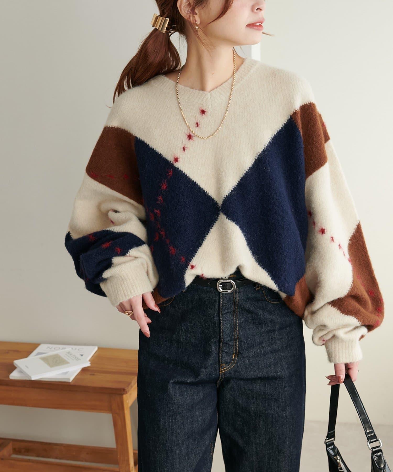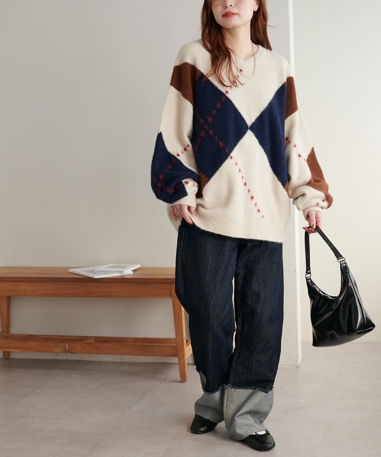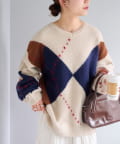 存在感のあるアーガイル柄が目を惹くニットトップス。