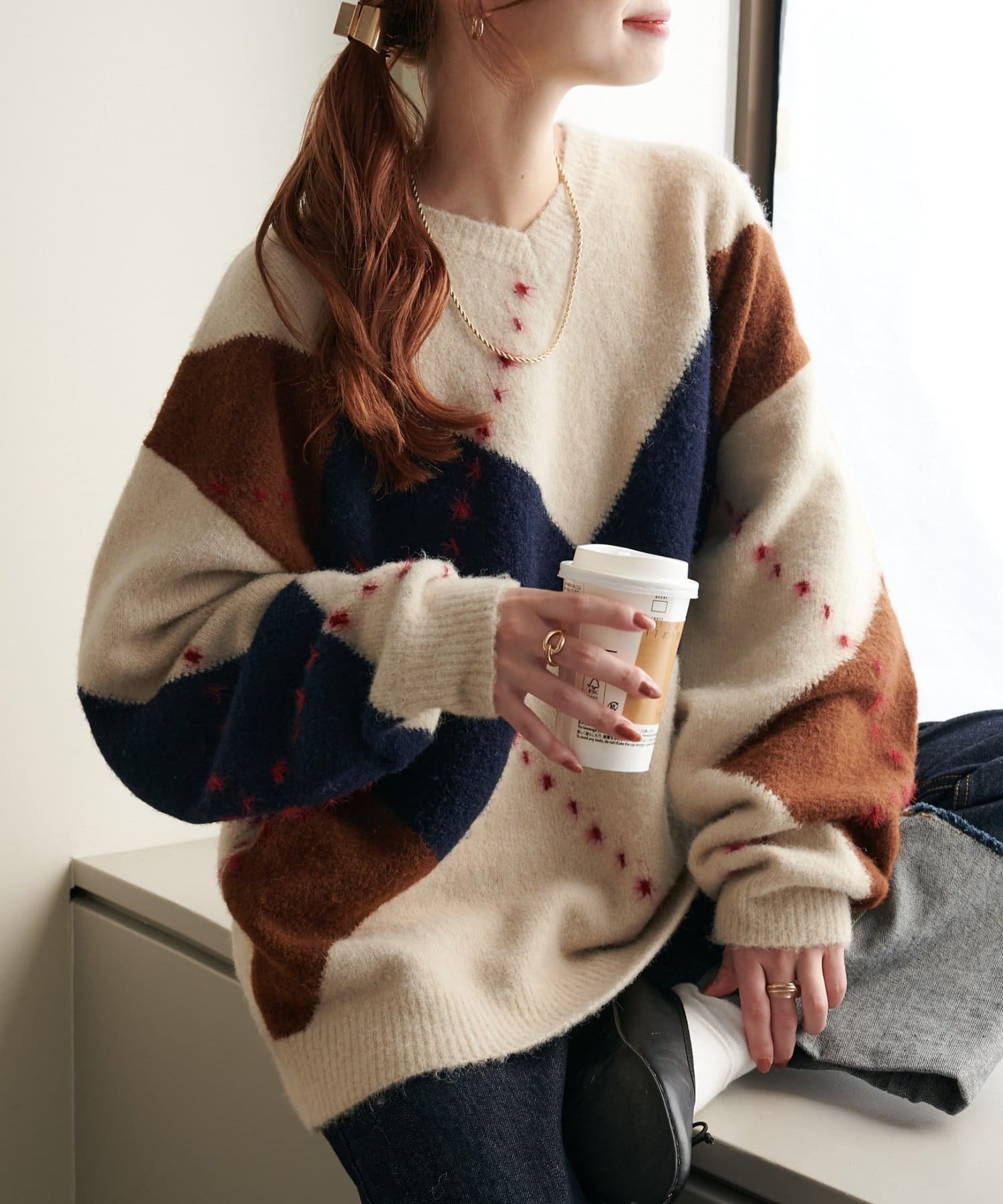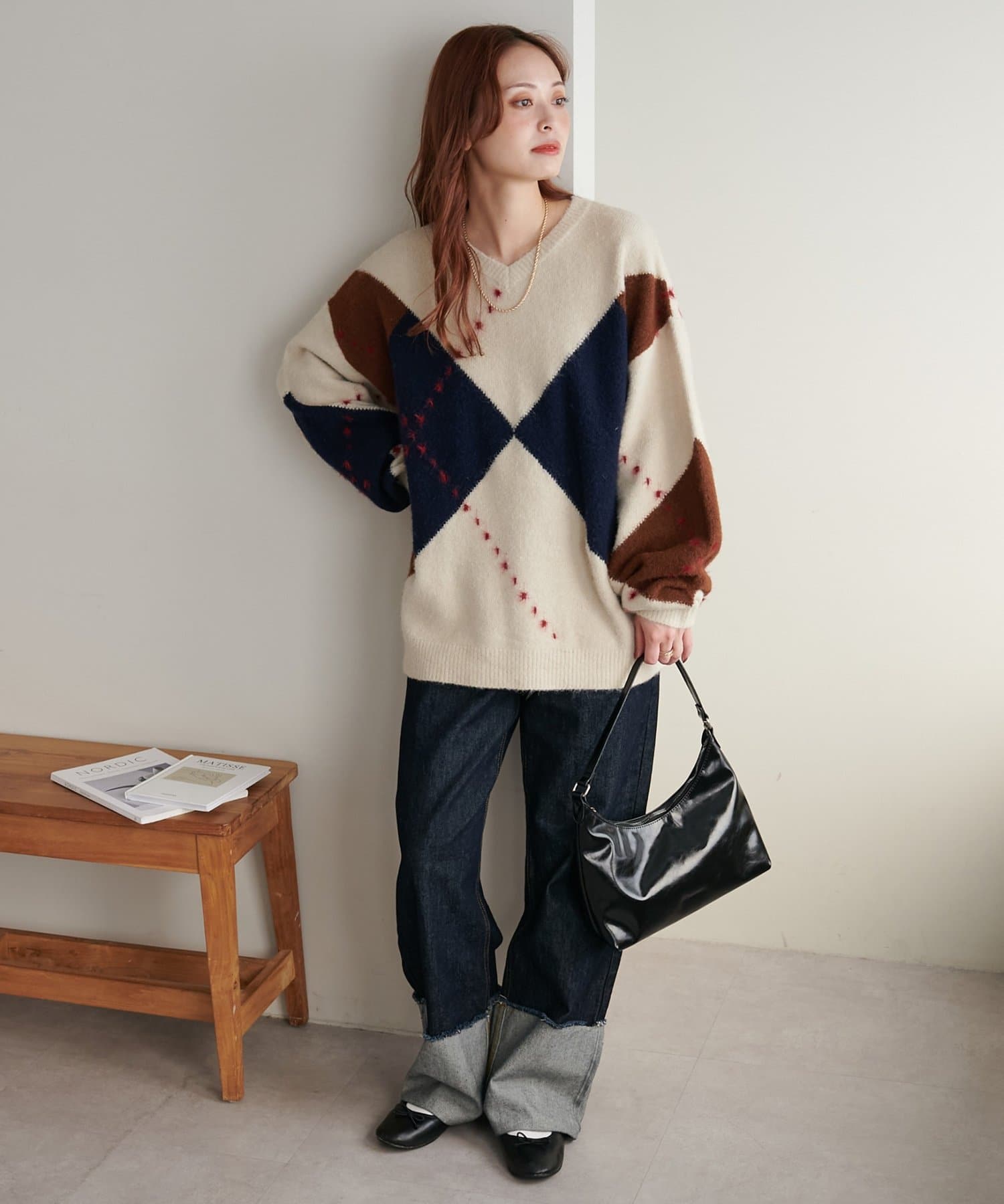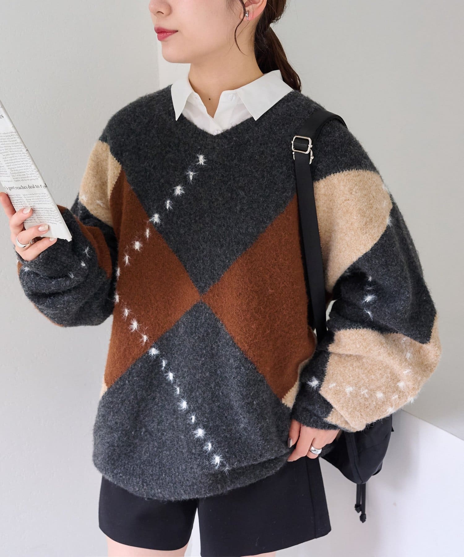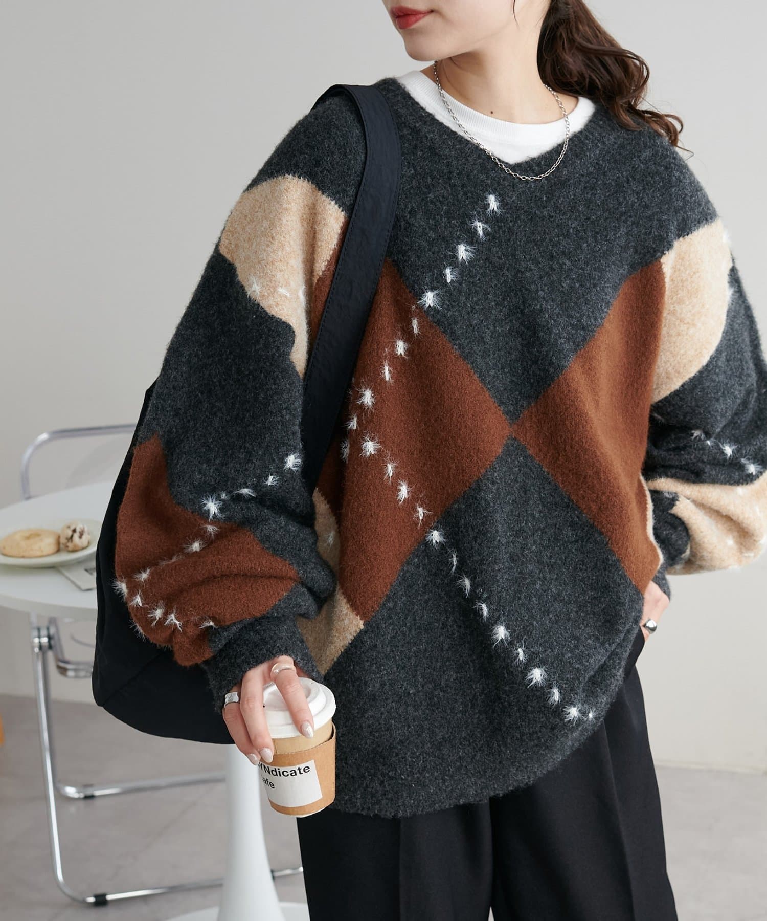存在感のあるアーガイル柄が目を惹くニットトップス。