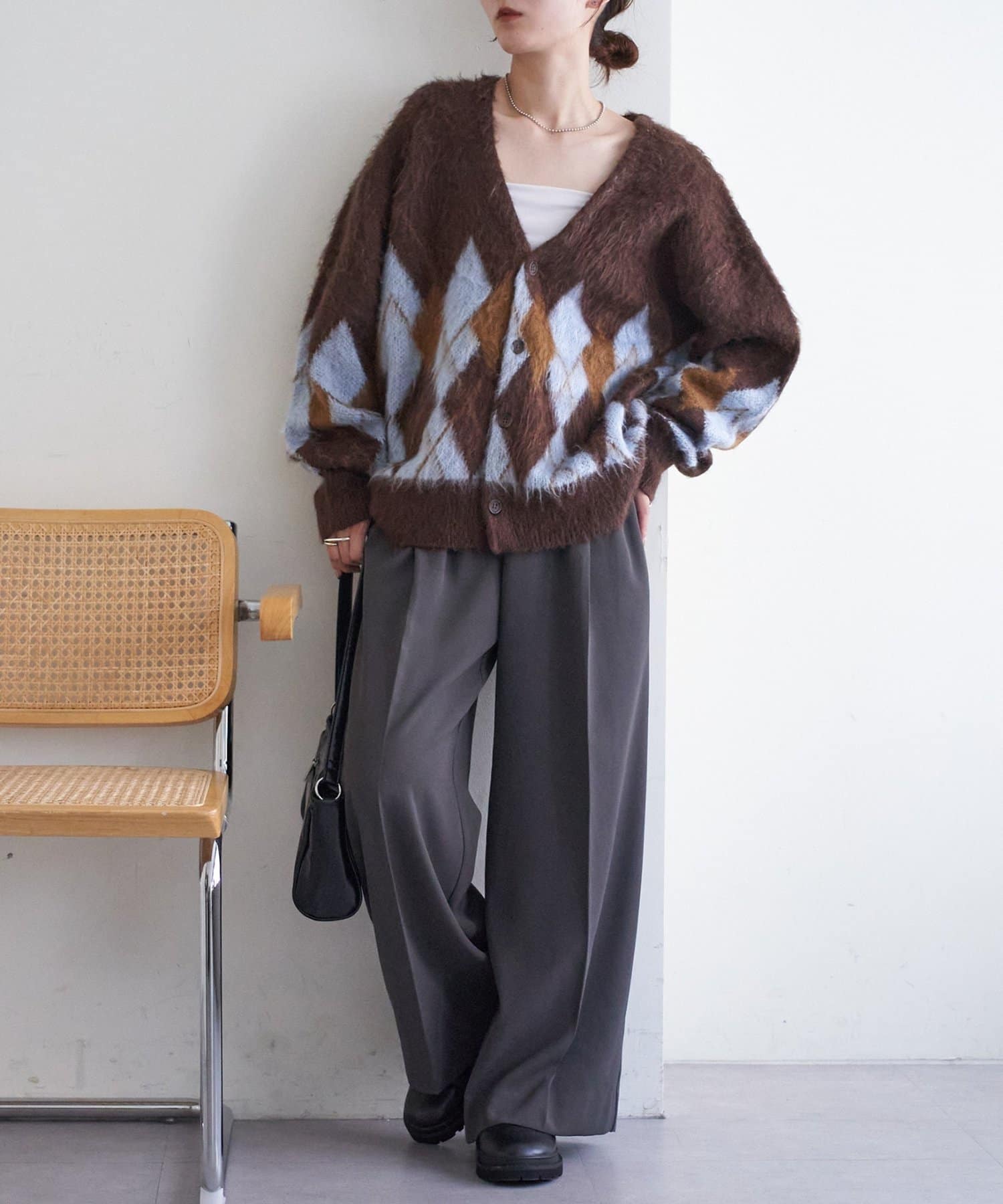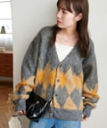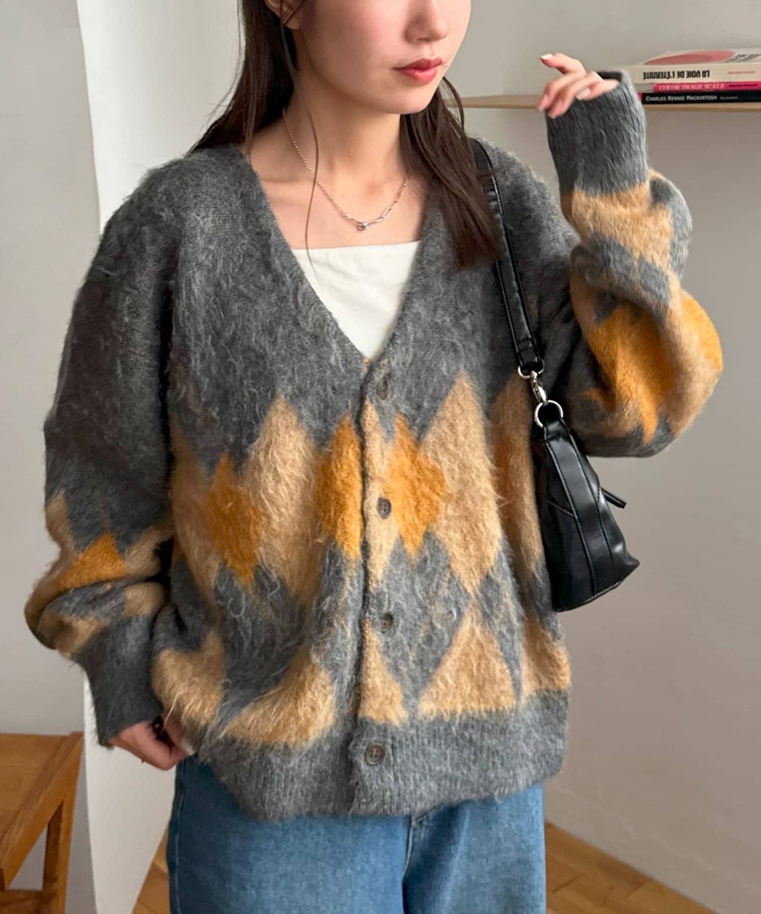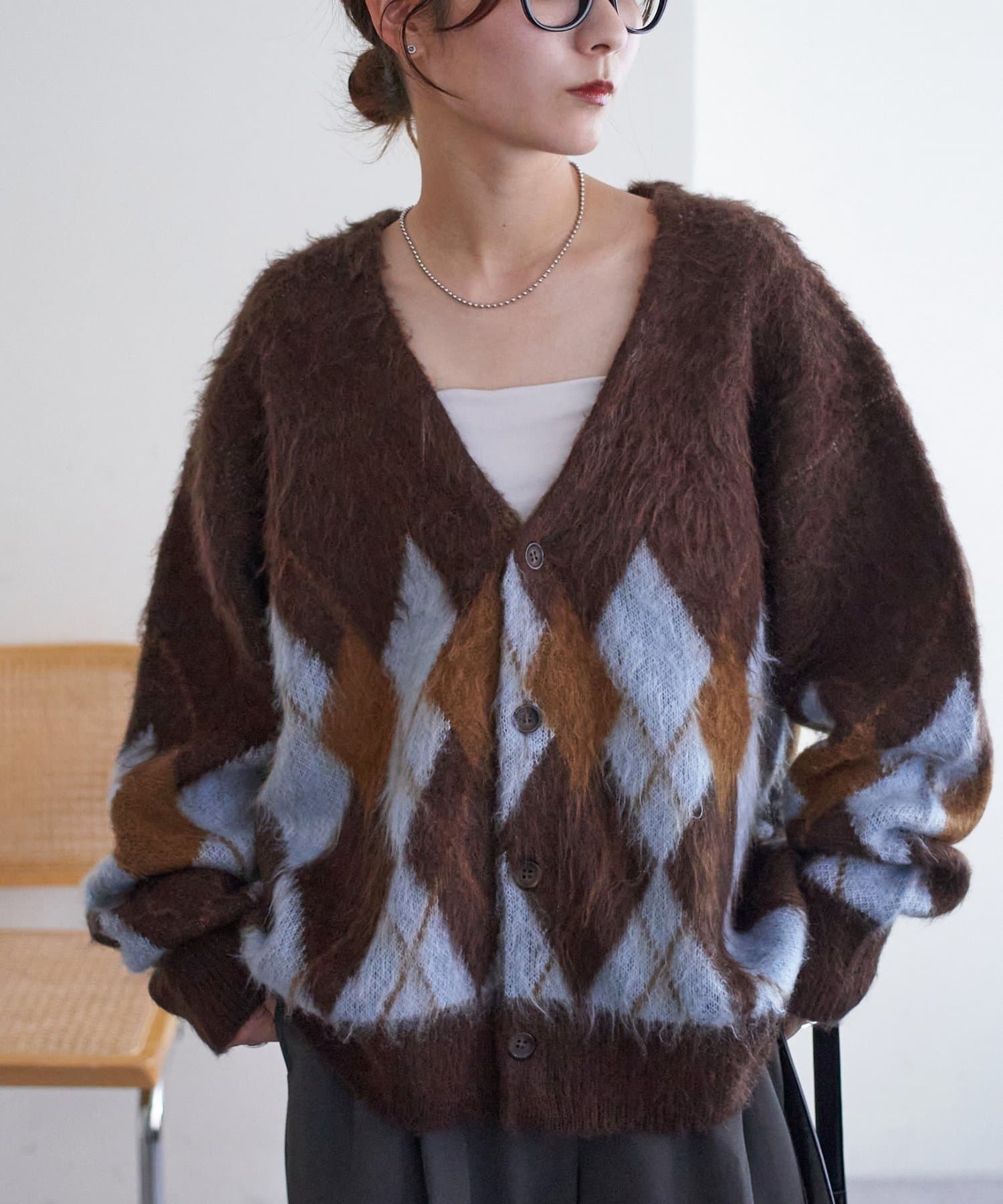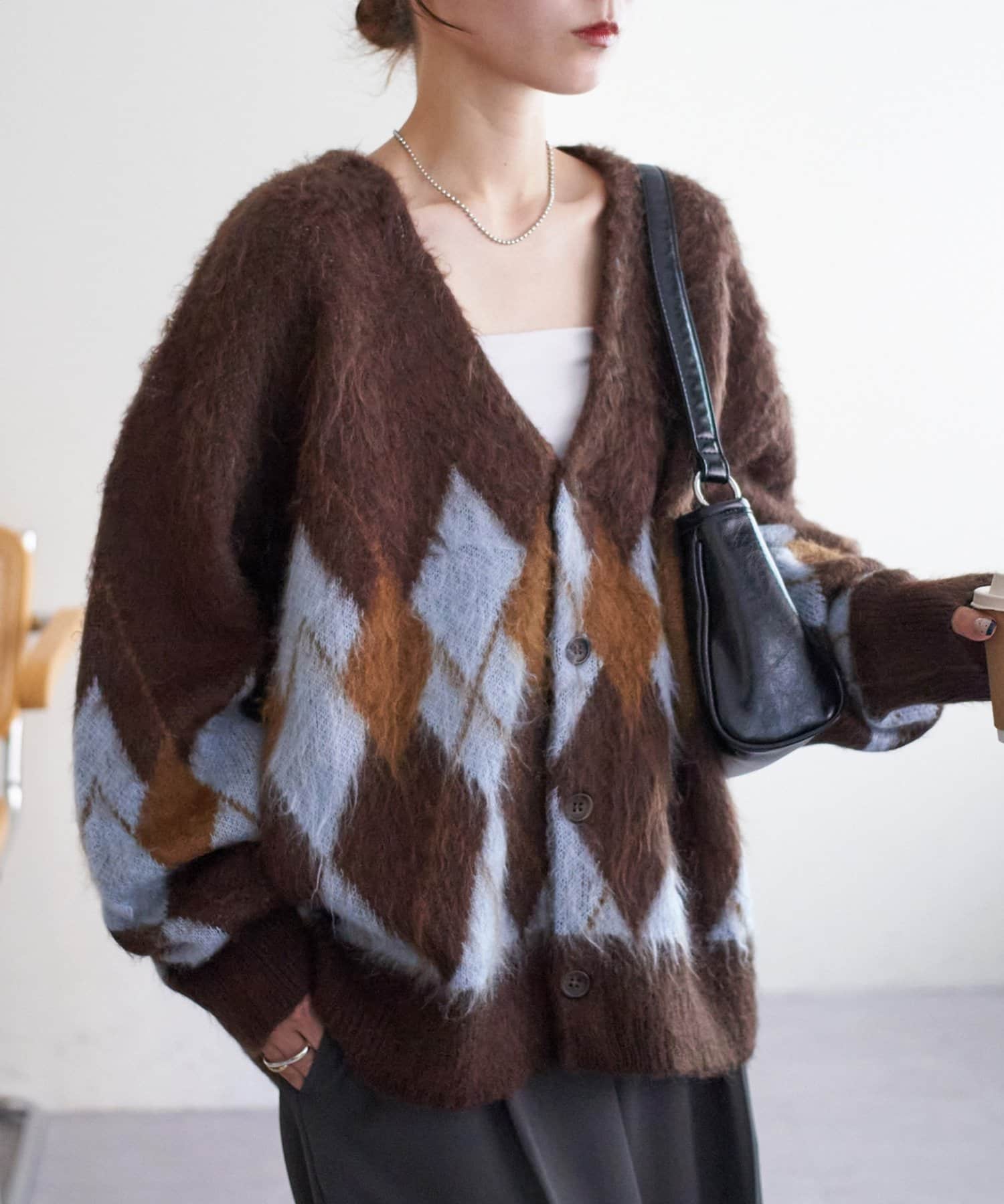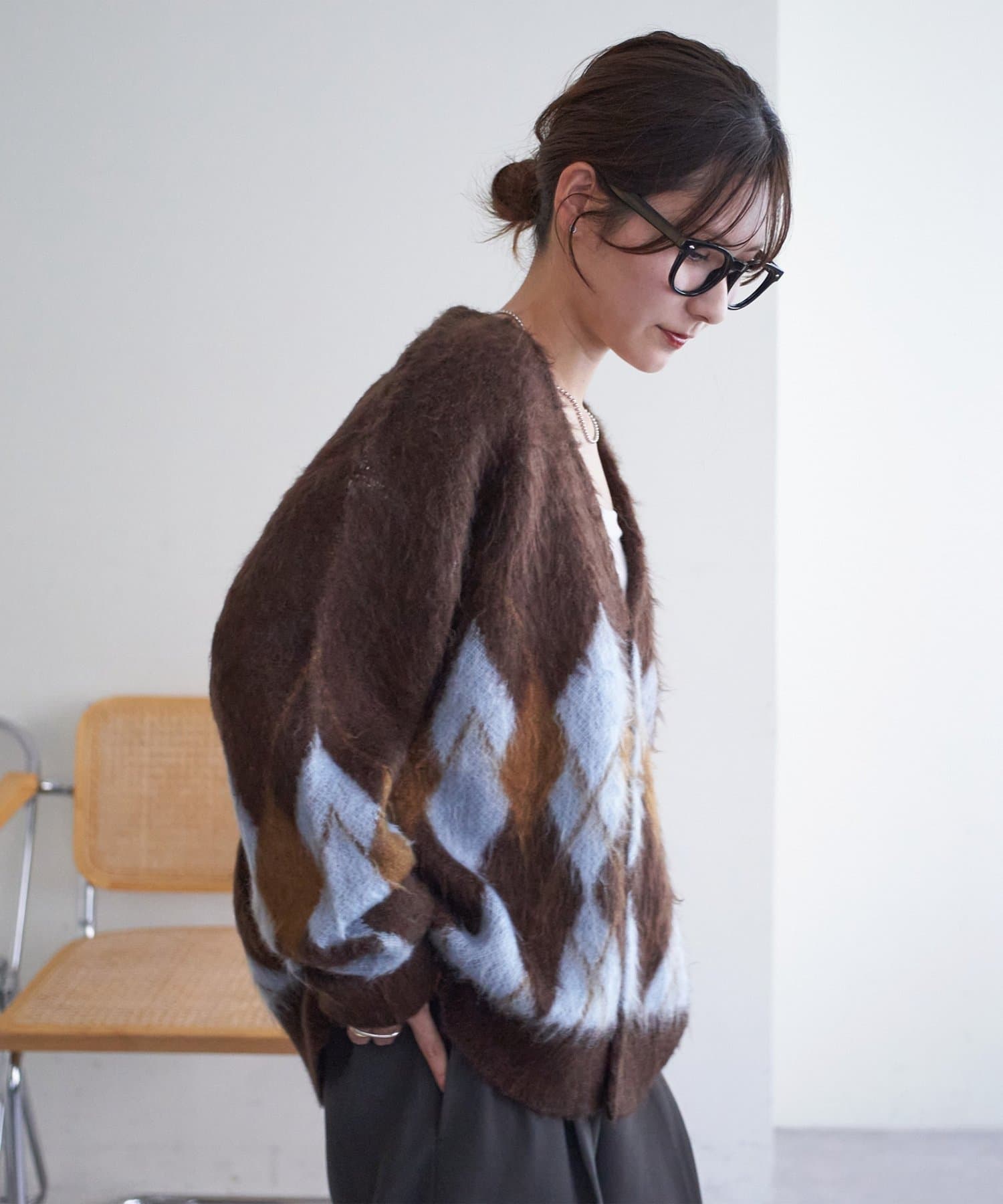 大きめのアーガイル柄が目を惹くニットカーディガン。毛足のあるニットが、レトロ感のある柄をやさしい雰囲気に仕上げています。深めのVネックとやや短めの丈感で、羽織るだけでバランス良く決まるのも魅力◎ボタンを留めてトップス風に着ても、開けてラフに羽織ってもサマになります♪