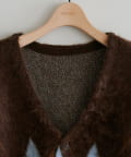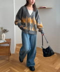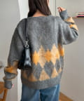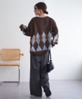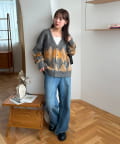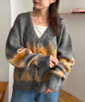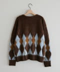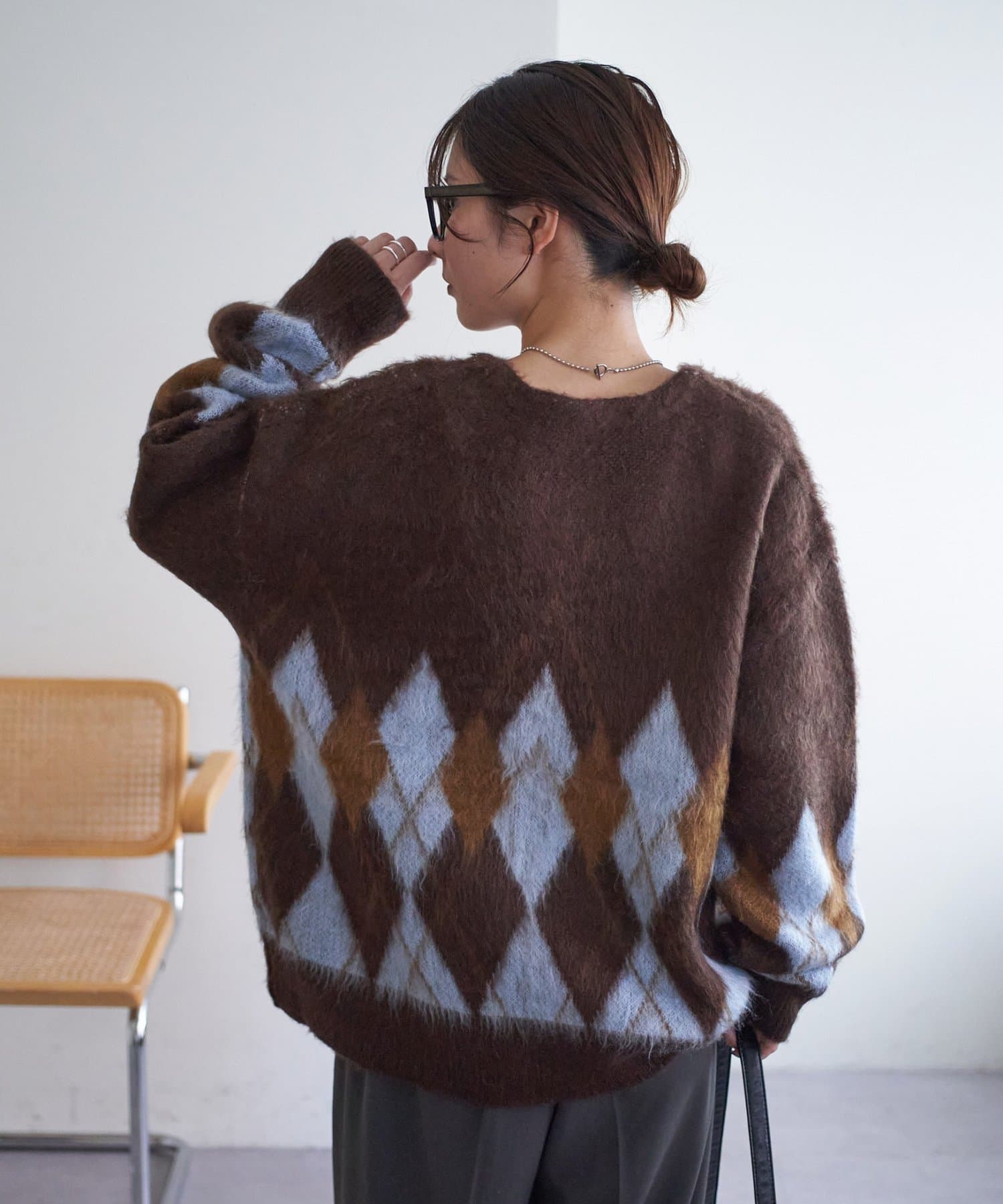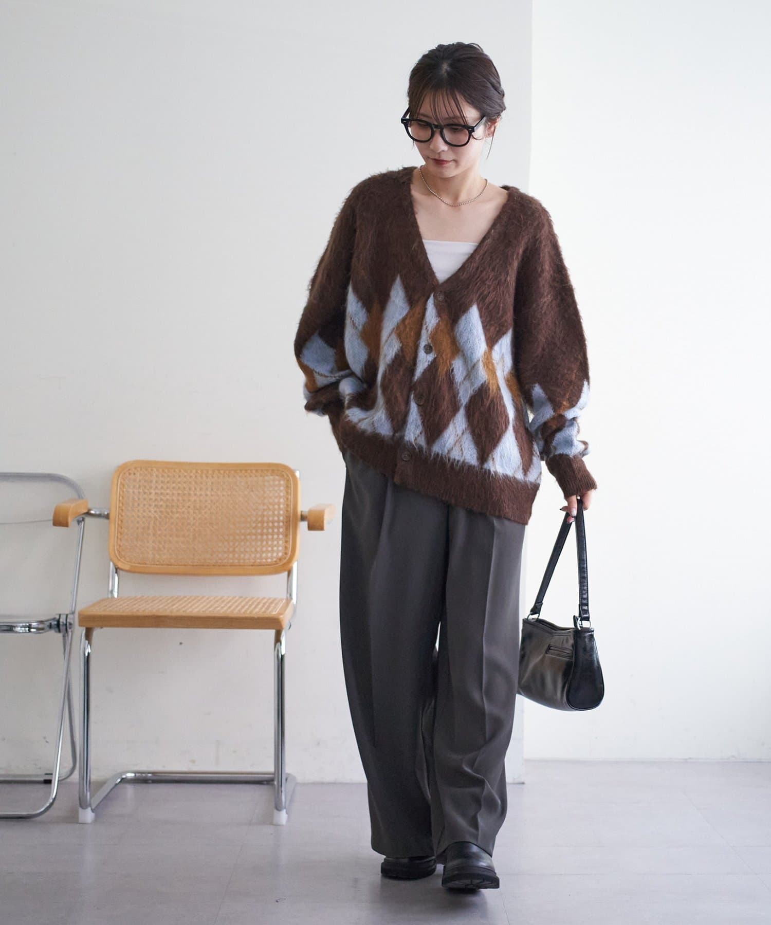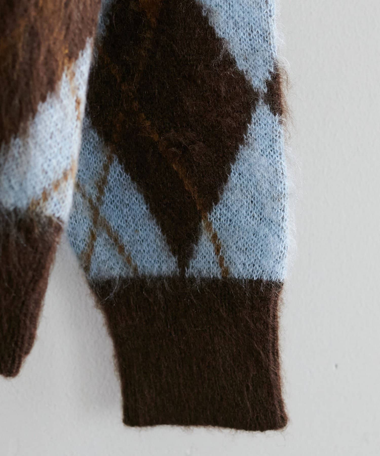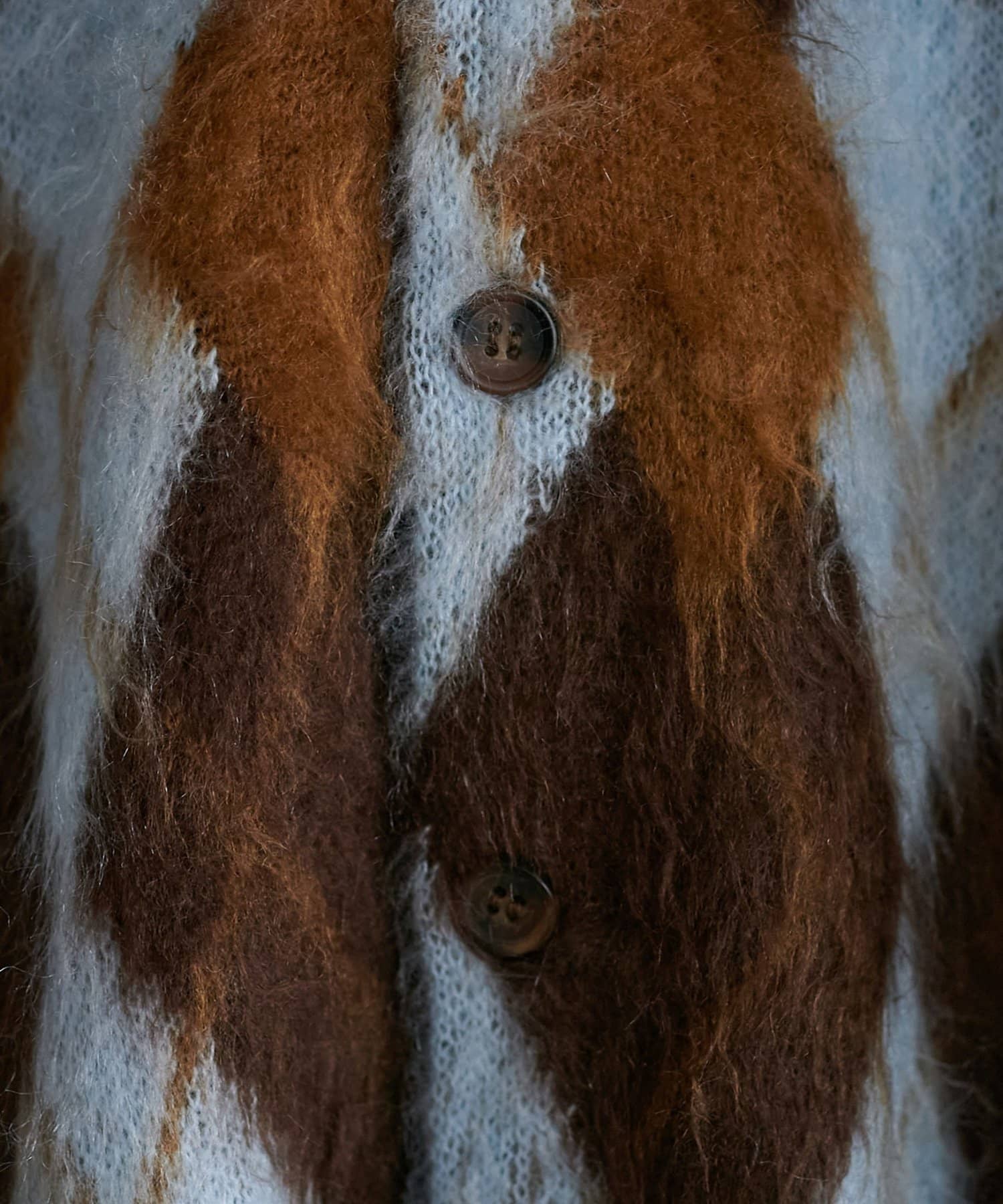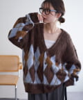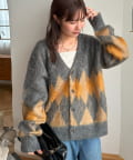 大きめのアーガイル柄が目を惹くニットカーディガン。毛足のあるニットが、レトロ感のある柄をやさしい雰囲気に仕上げています。深めのVネックとやや短めの丈感で、羽織るだけでバランス良く決まるのも魅力◎ボタンを留めてトップス風に着ても、開けてラフに羽織ってもサマになります♪