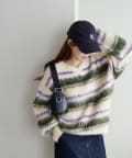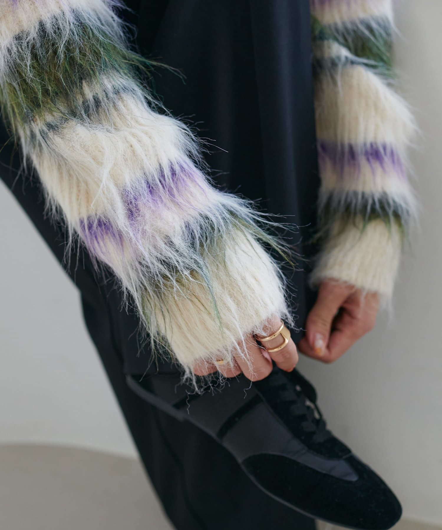 シャギー素材とマルチボーダーの存在感を活かすため、シンプルなボトムと合わせるのがおすすめ。