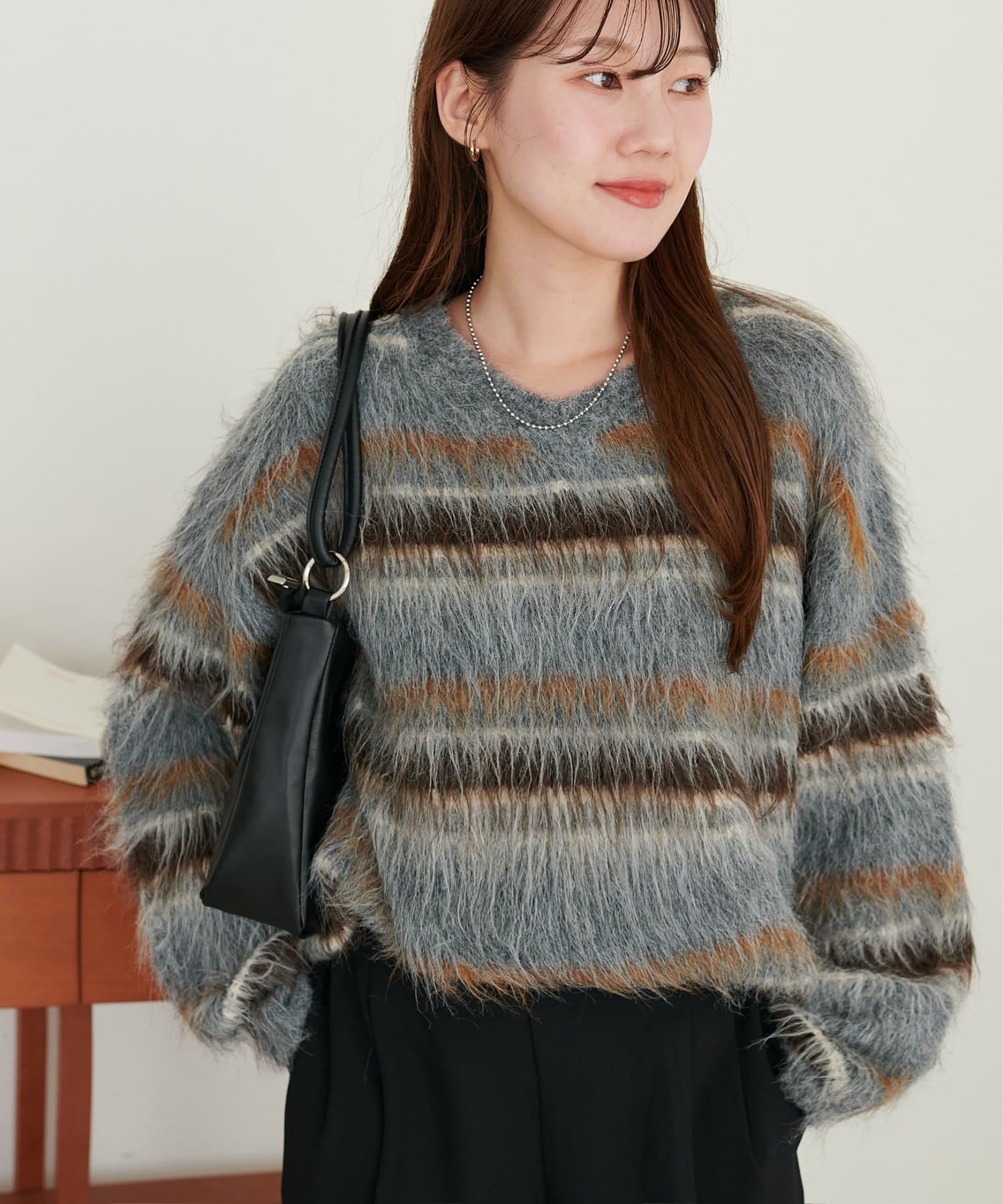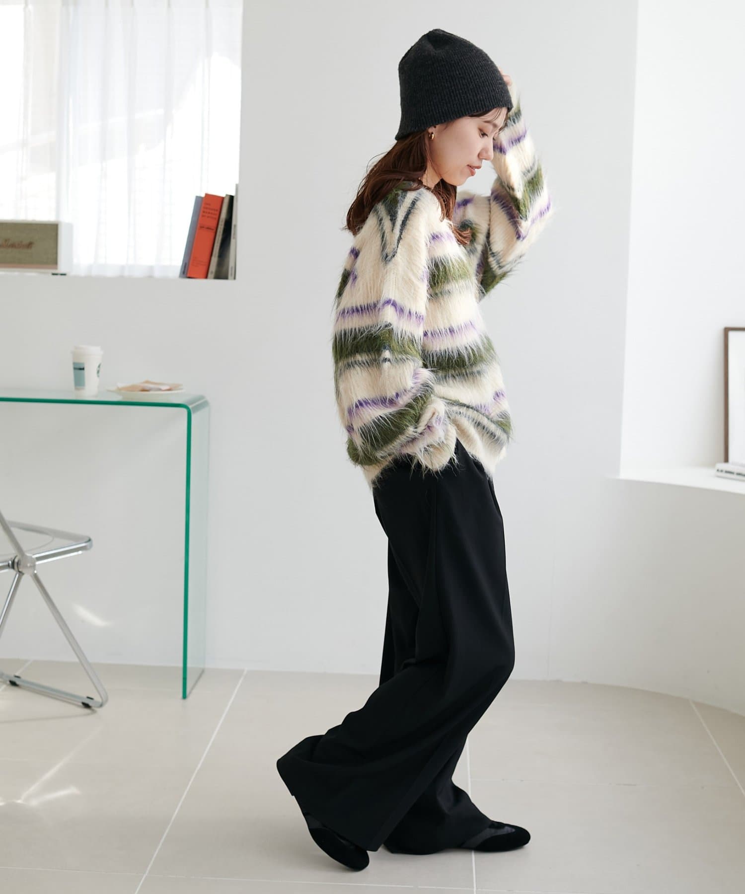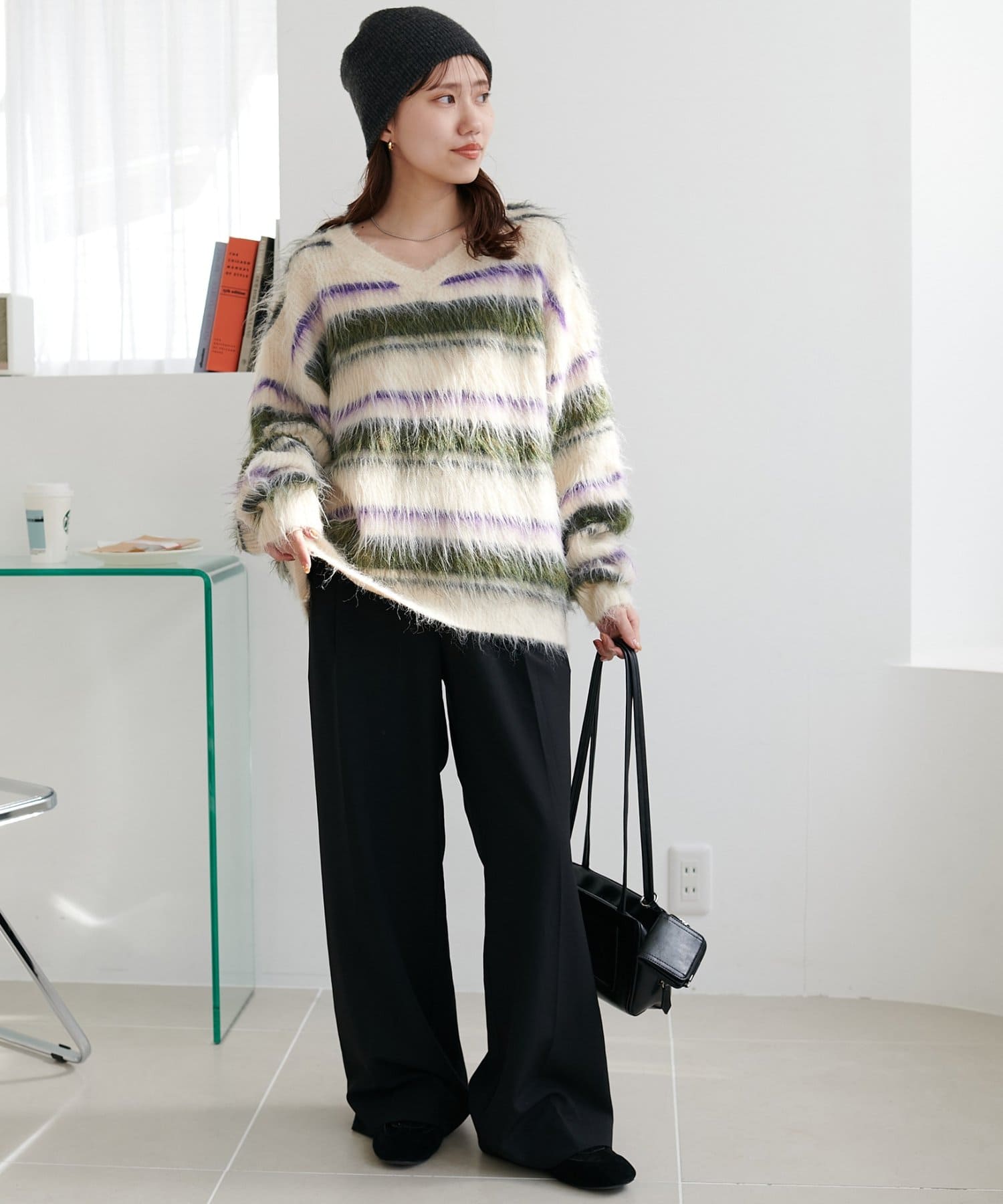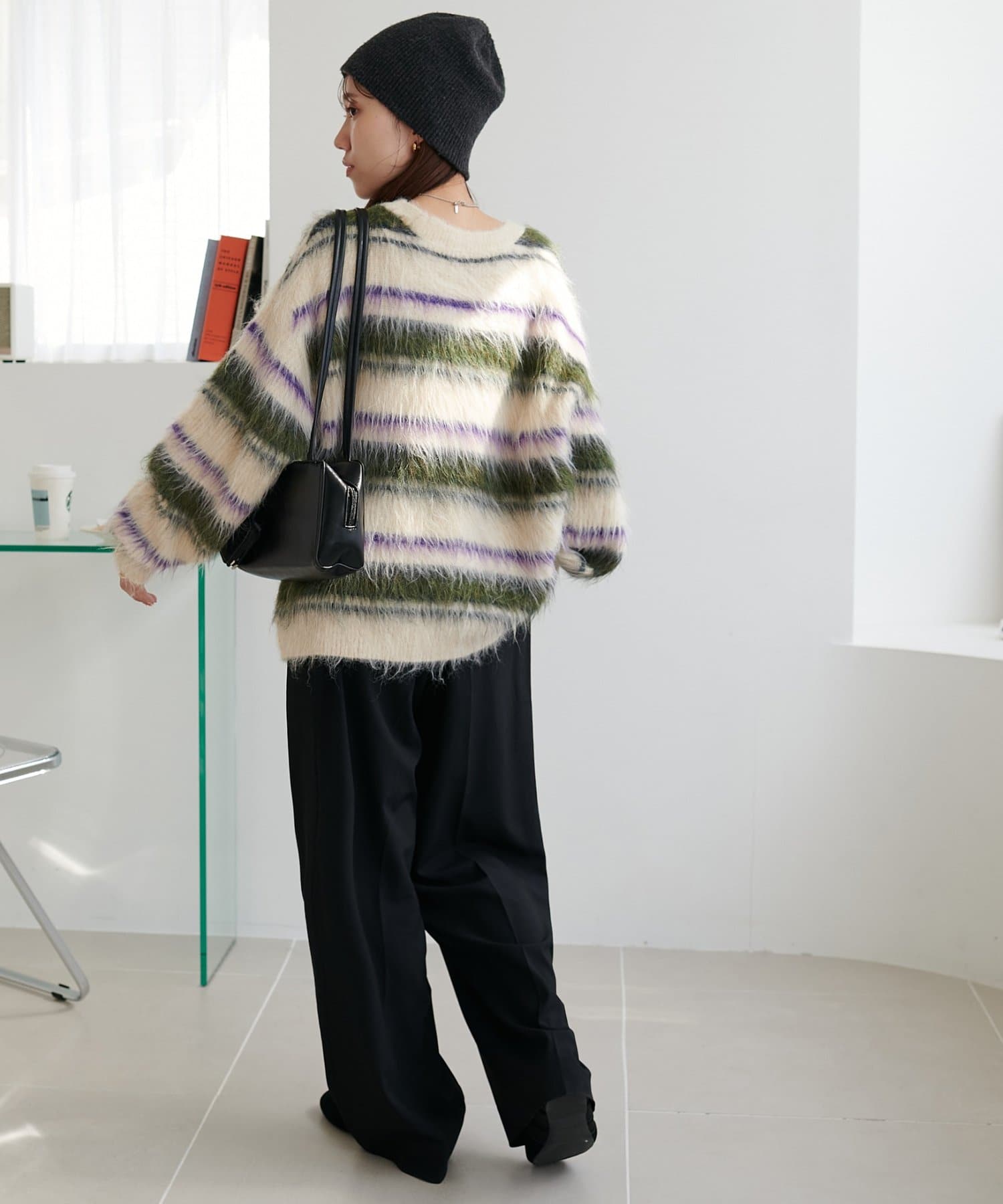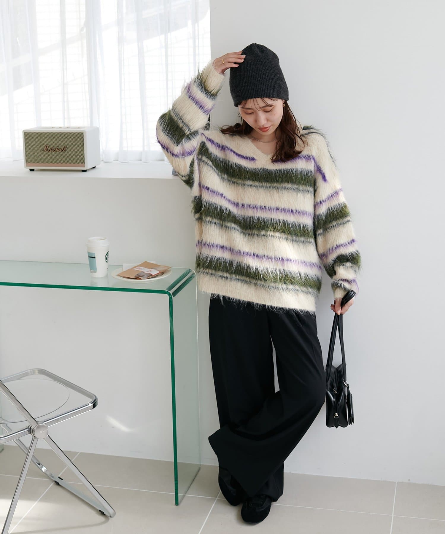 シャギー素材とマルチボーダーの存在感を活かすため、シンプルなボトムと合わせるのがおすすめ。
