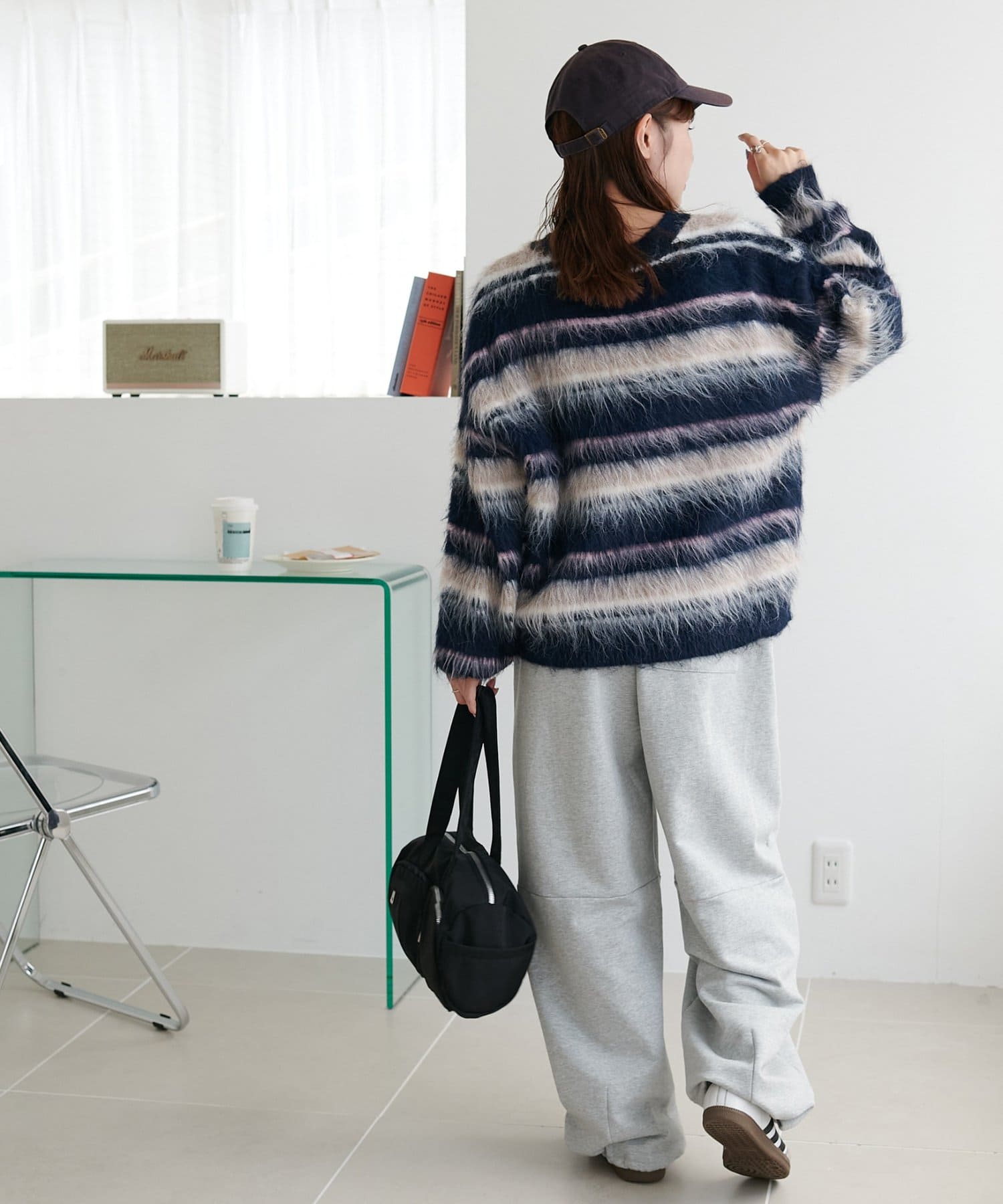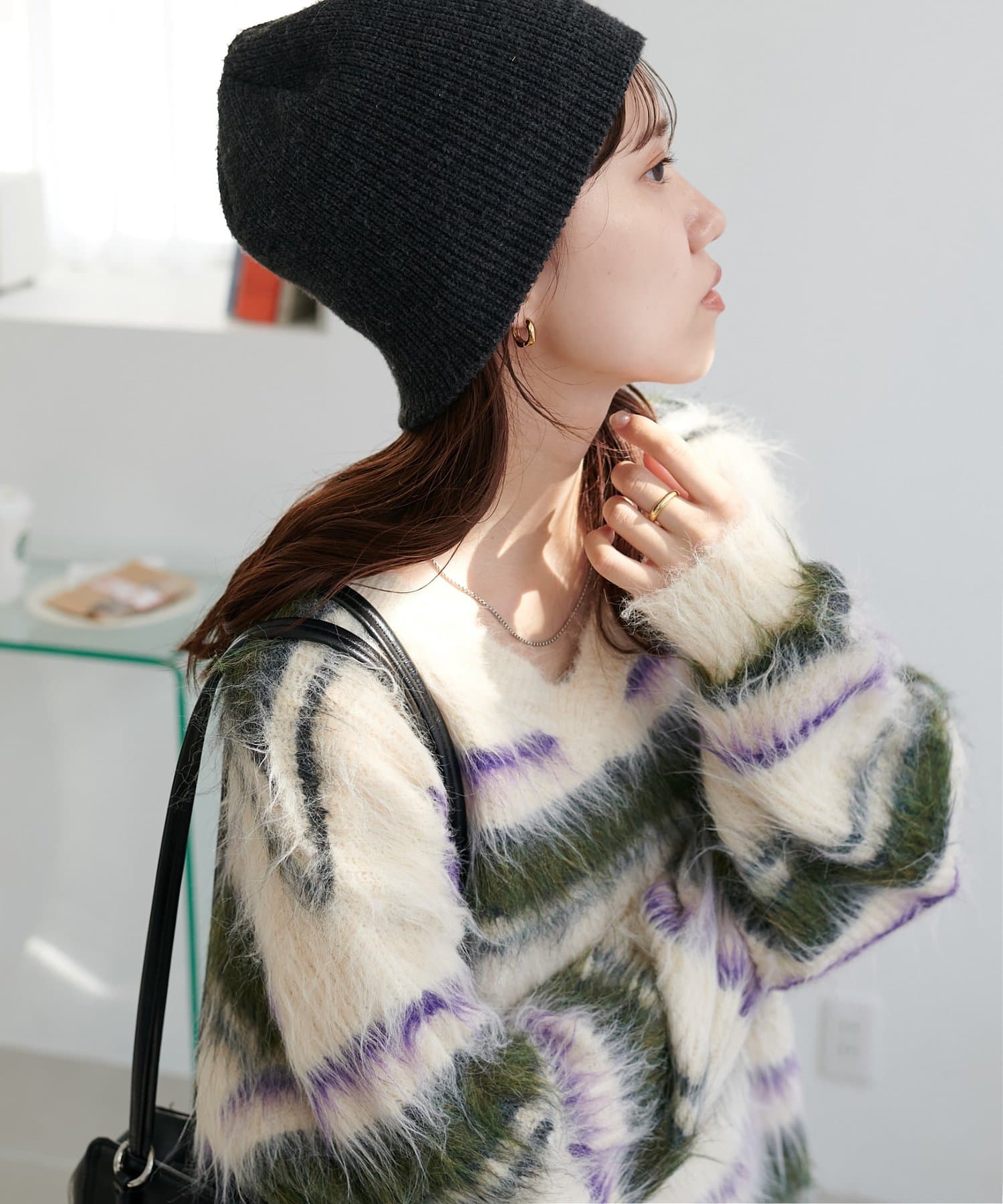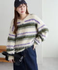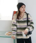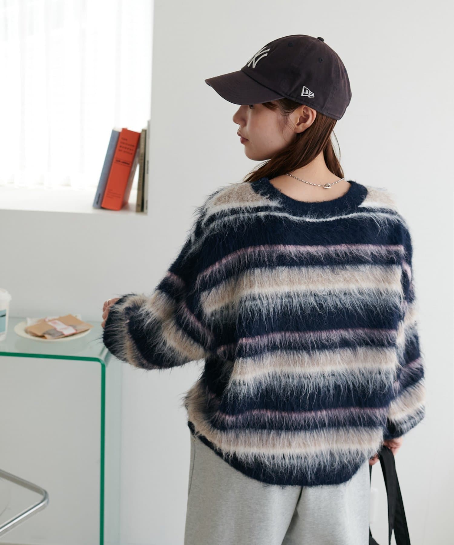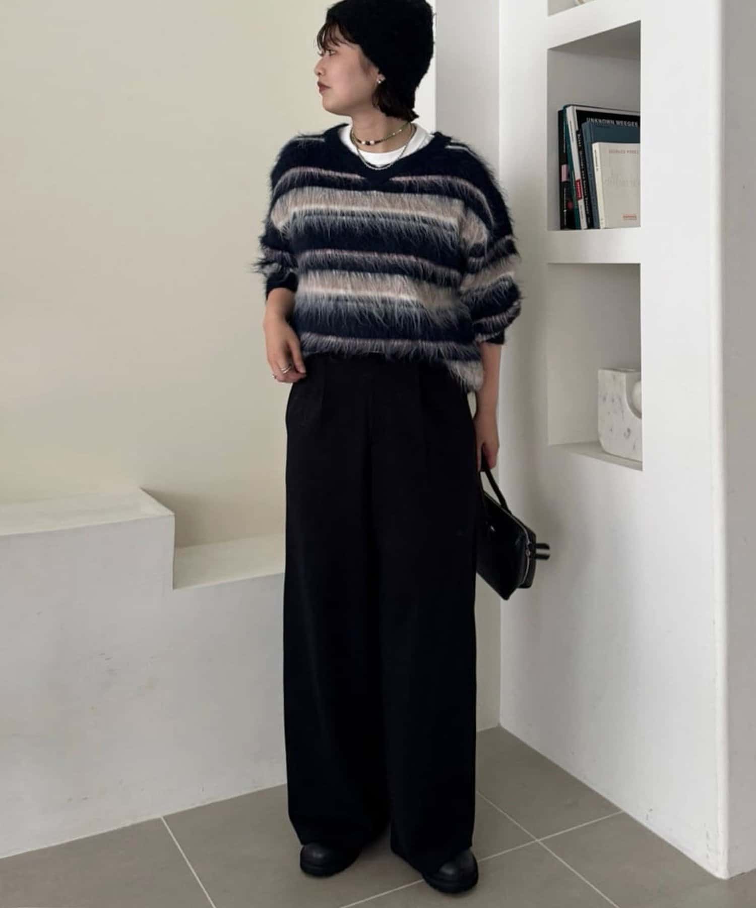 シャギー素材とマルチボーダーの存在感を活かすため、シンプルなボトムと合わせるのがおすすめ。
