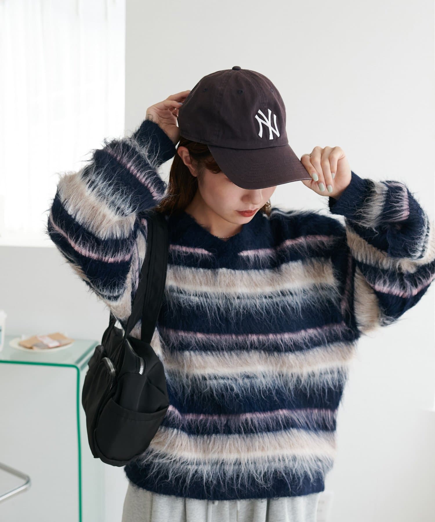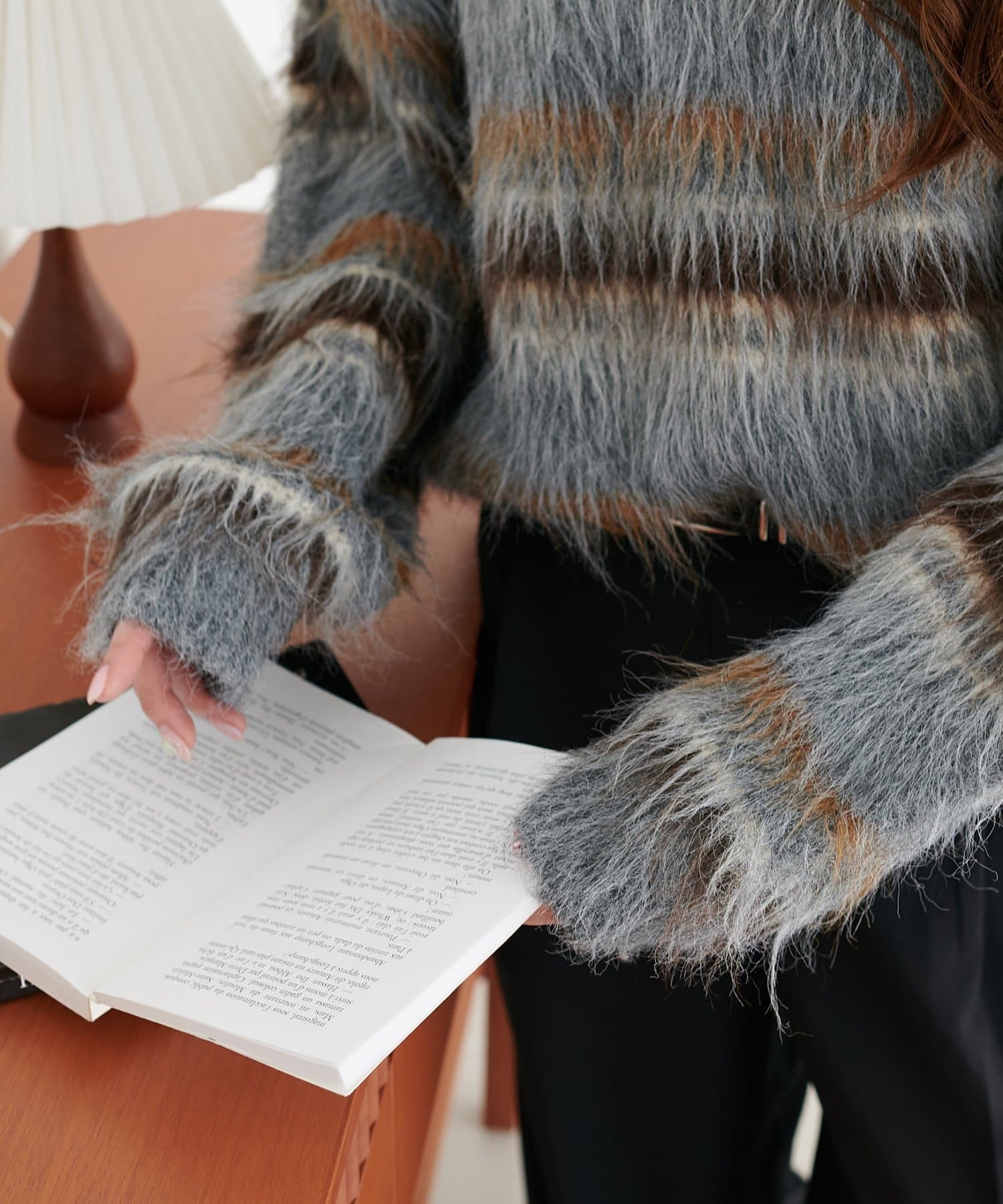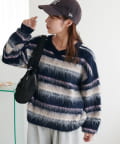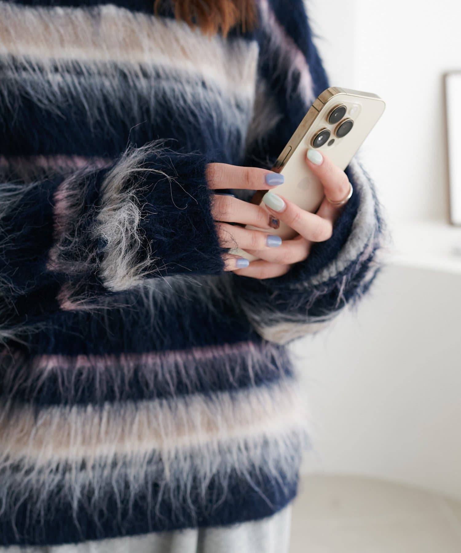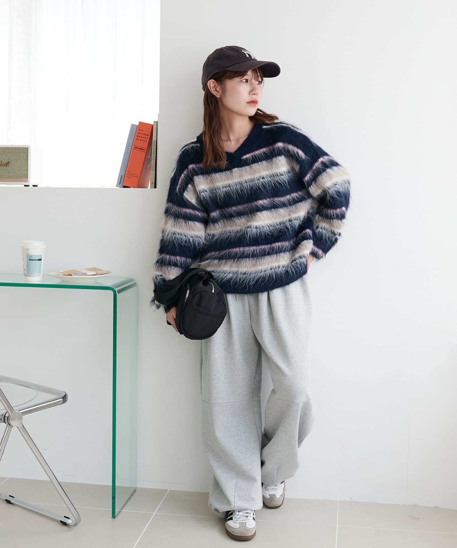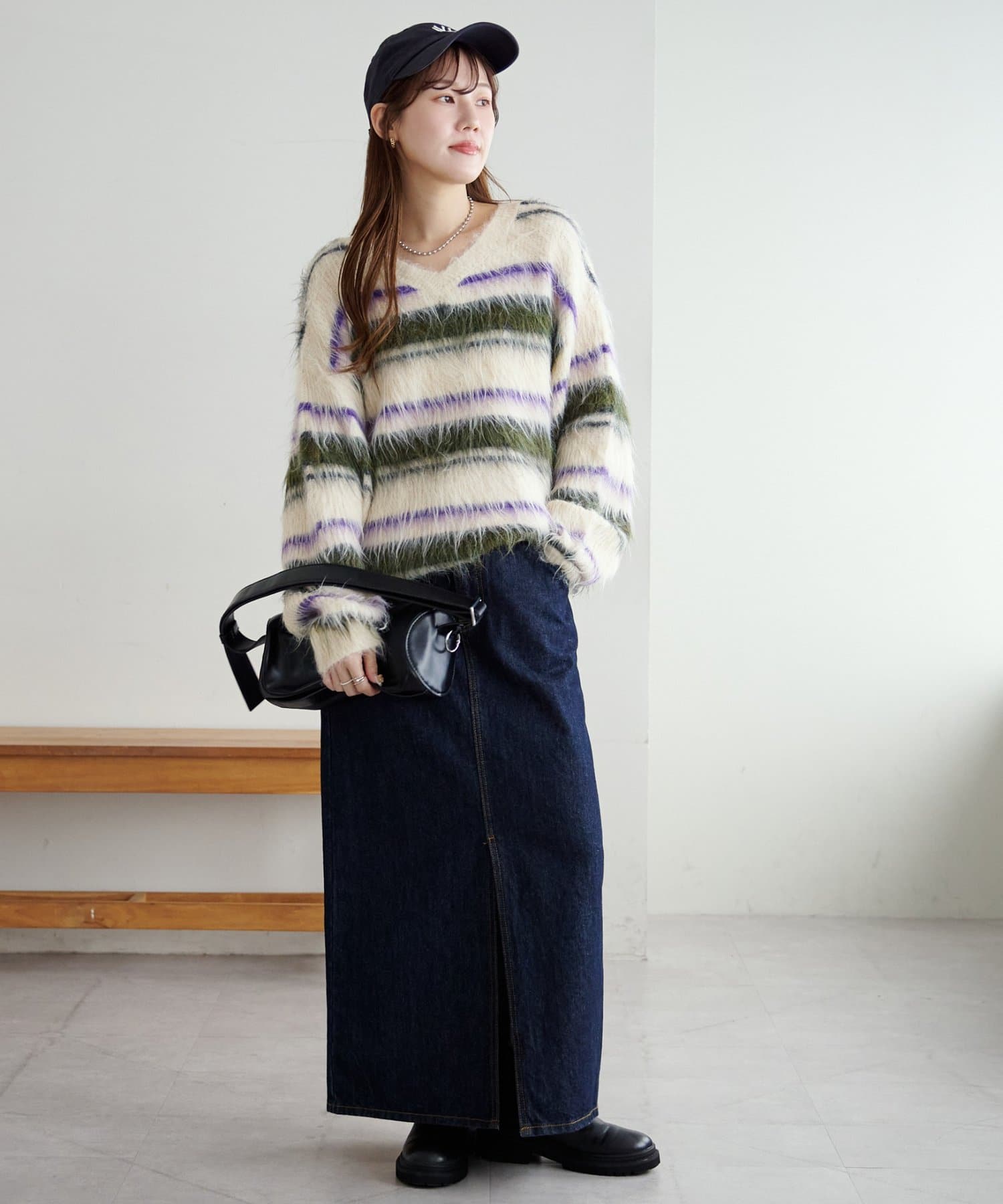 シャギー素材とマルチボーダーの存在感を活かすため、シンプルなボトムと合わせるのがおすすめ。