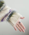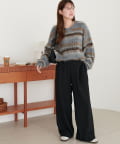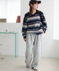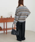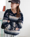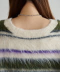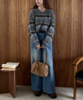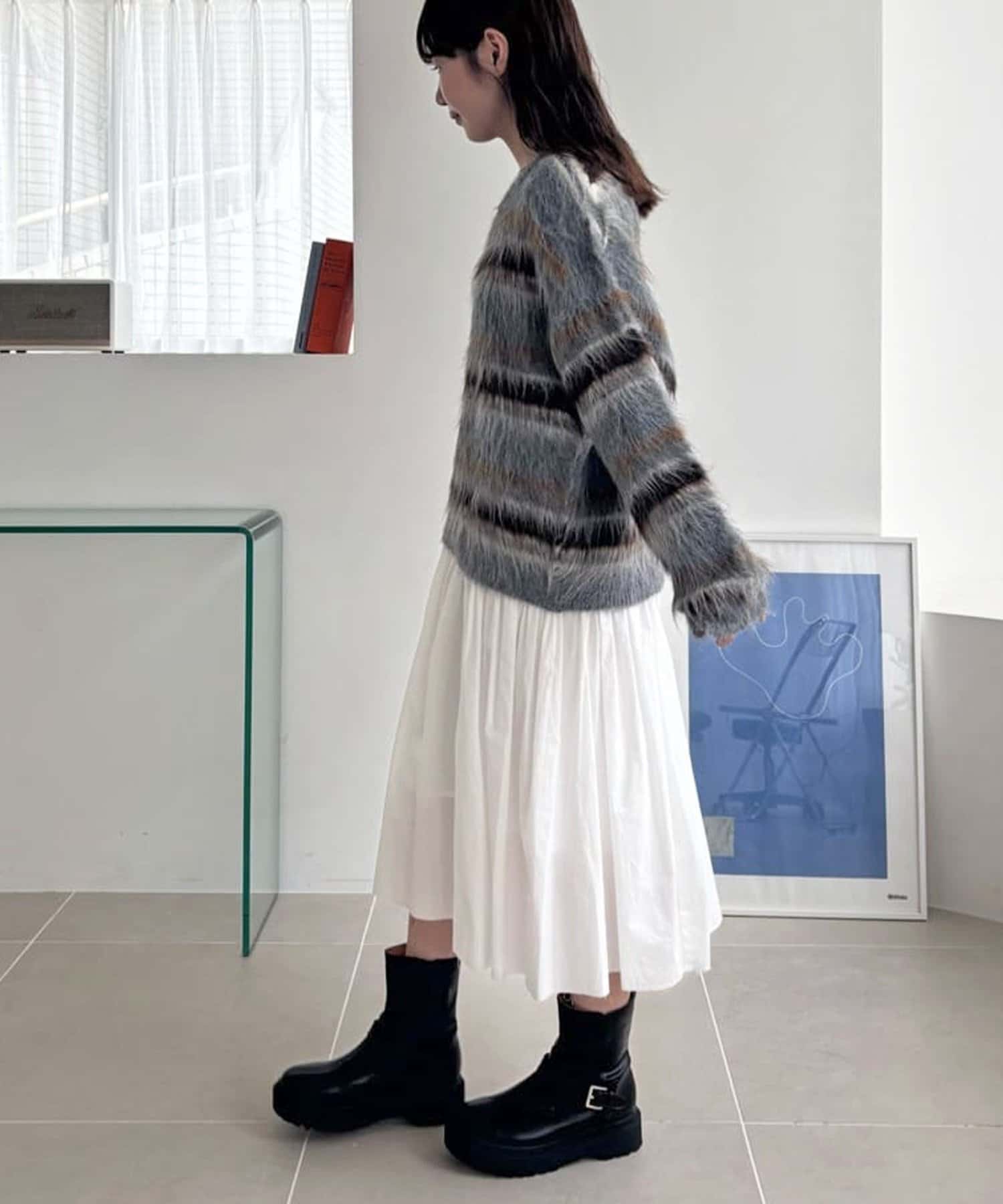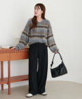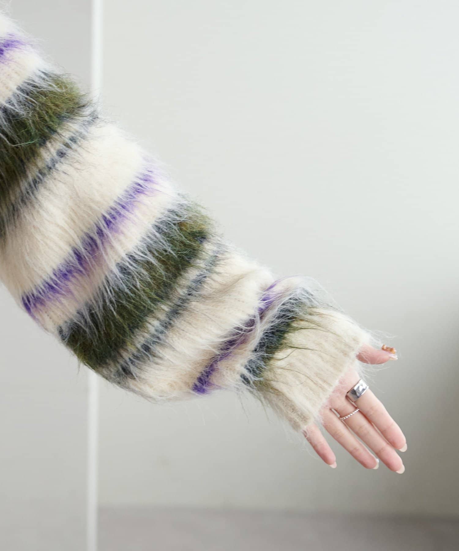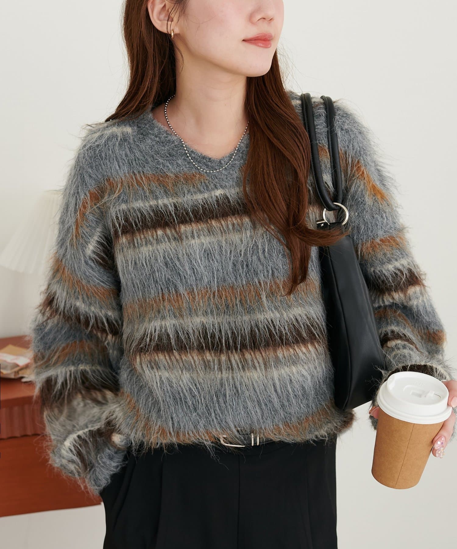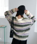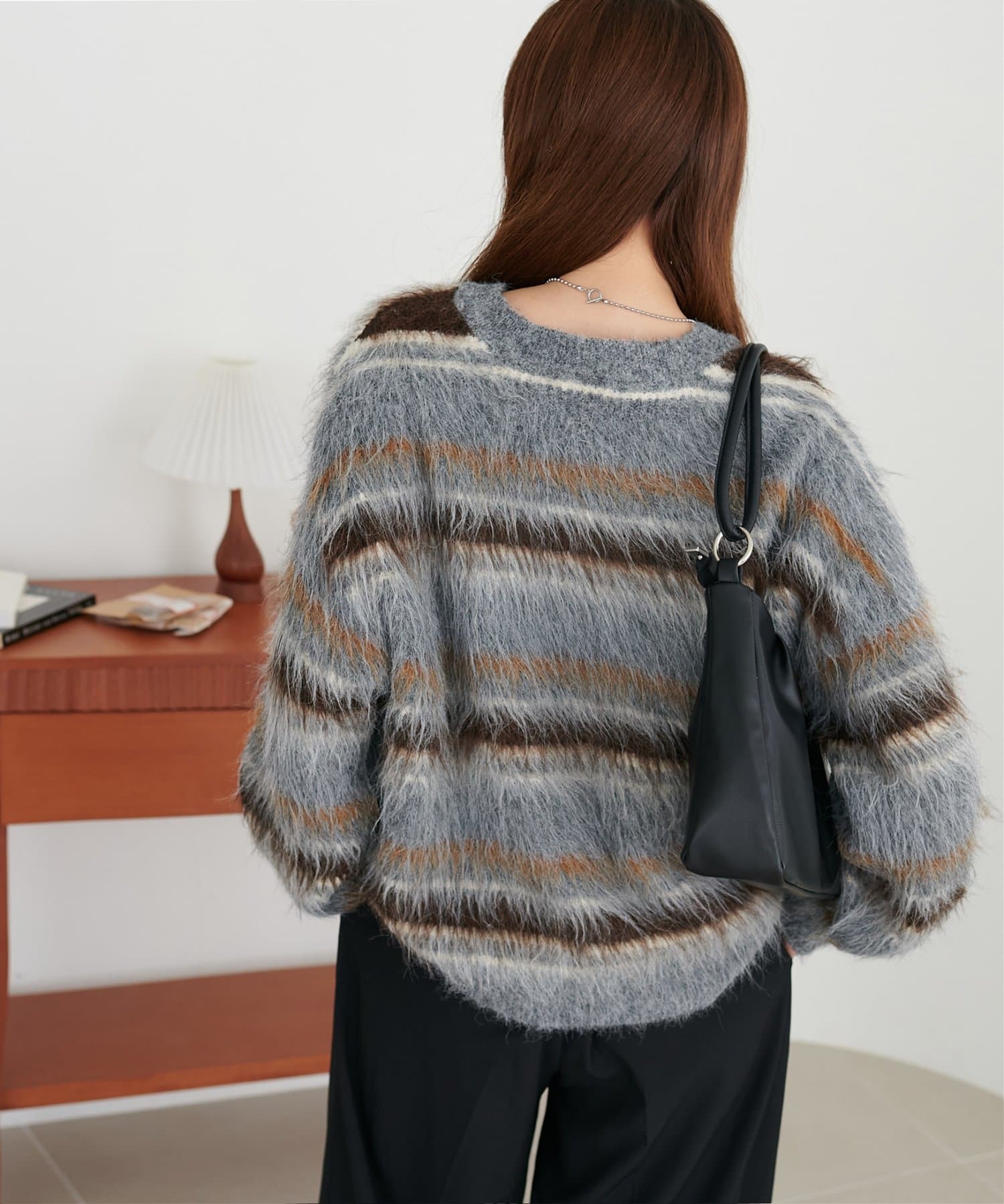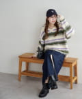シャギー素材とマルチボーダーの存在感を活かすため、シンプルなボトムと合わせるのがおすすめ。