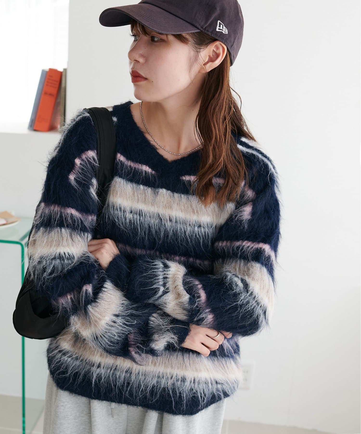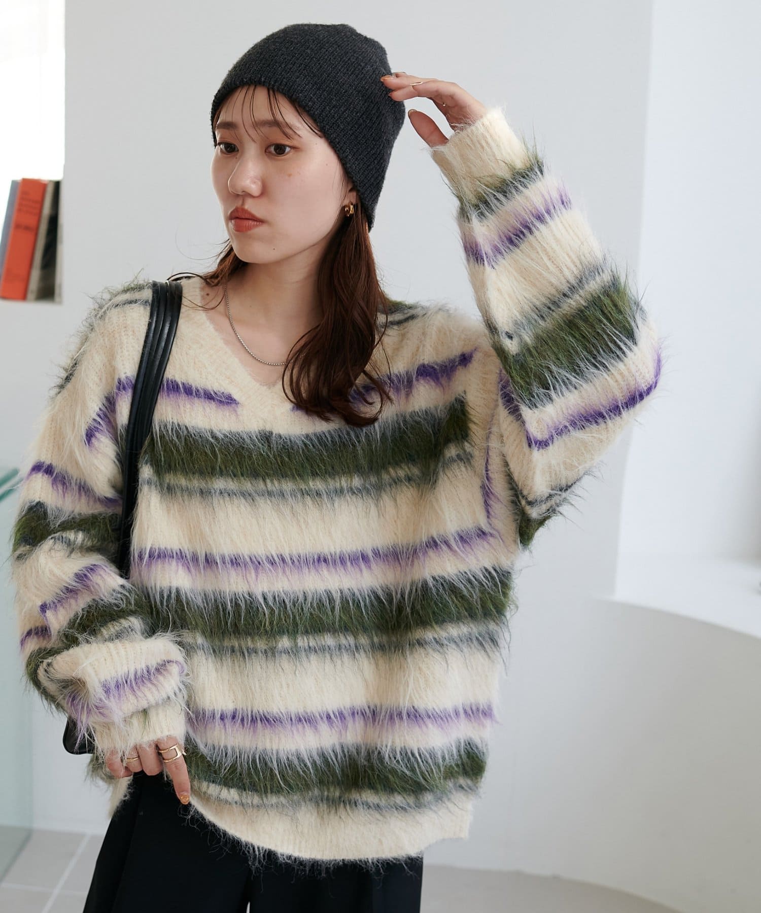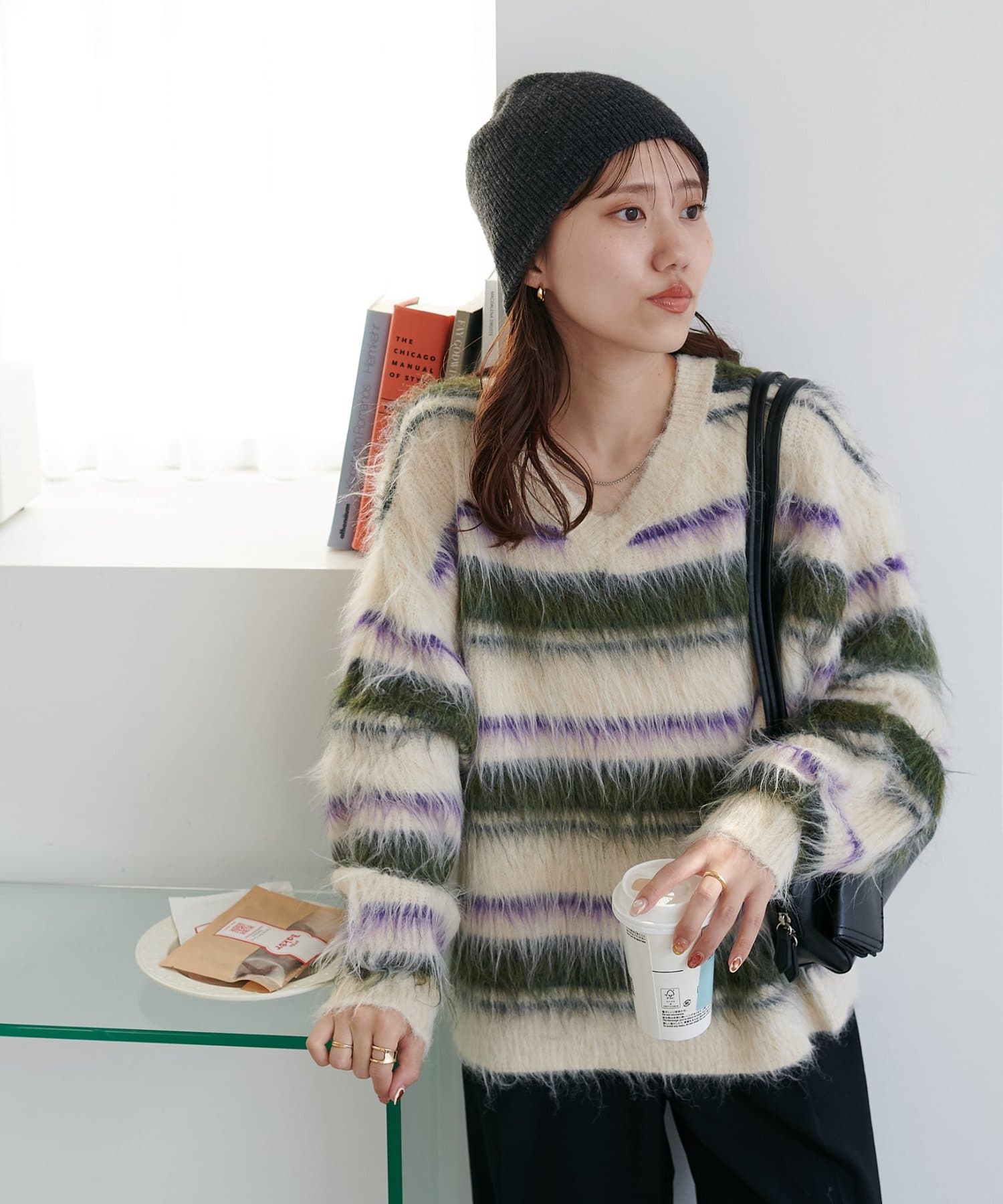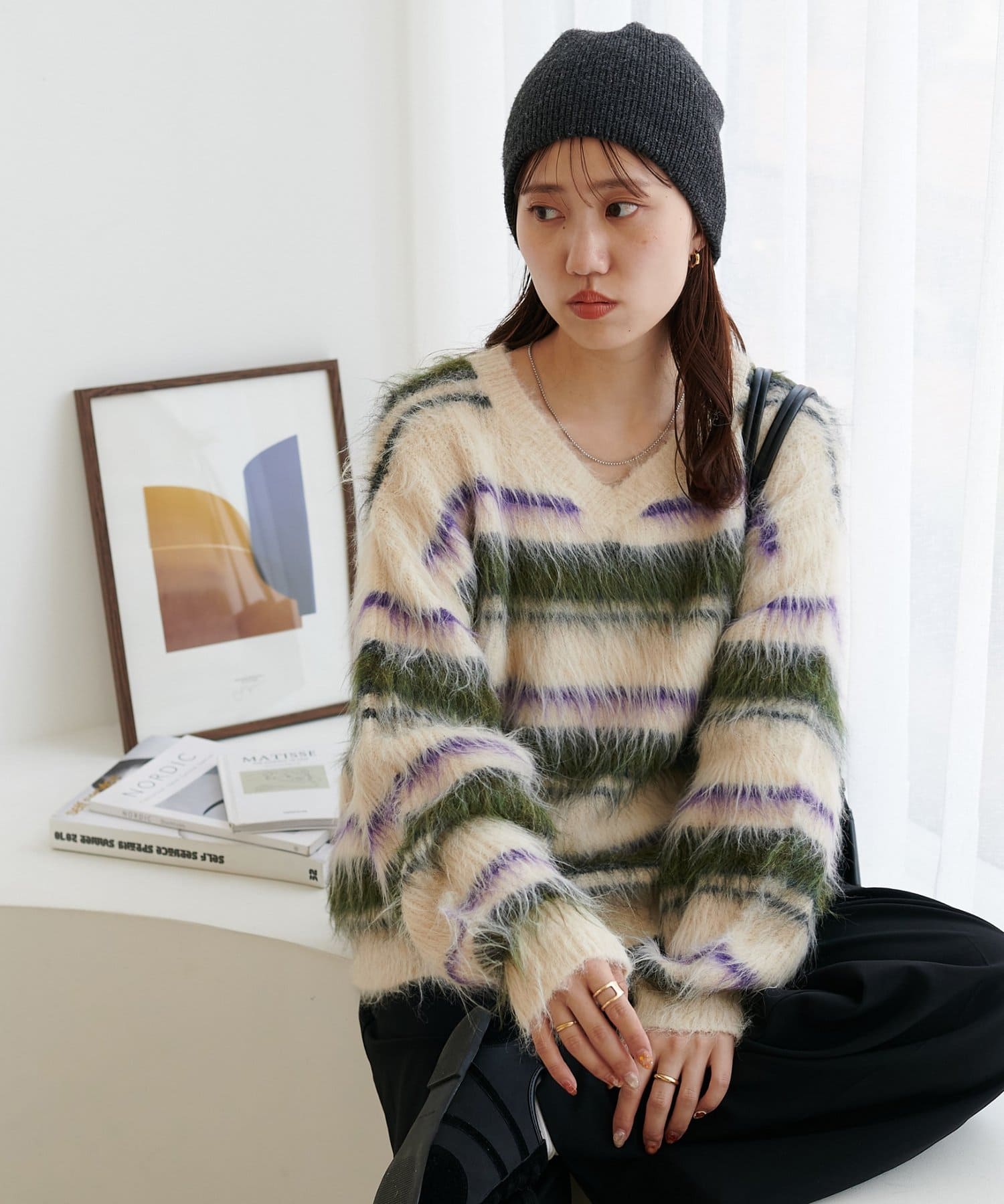 ふんわりとしたシャギー素材を使用した、マルチボーダー柄のVネックニット。
