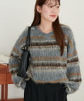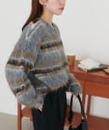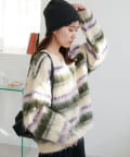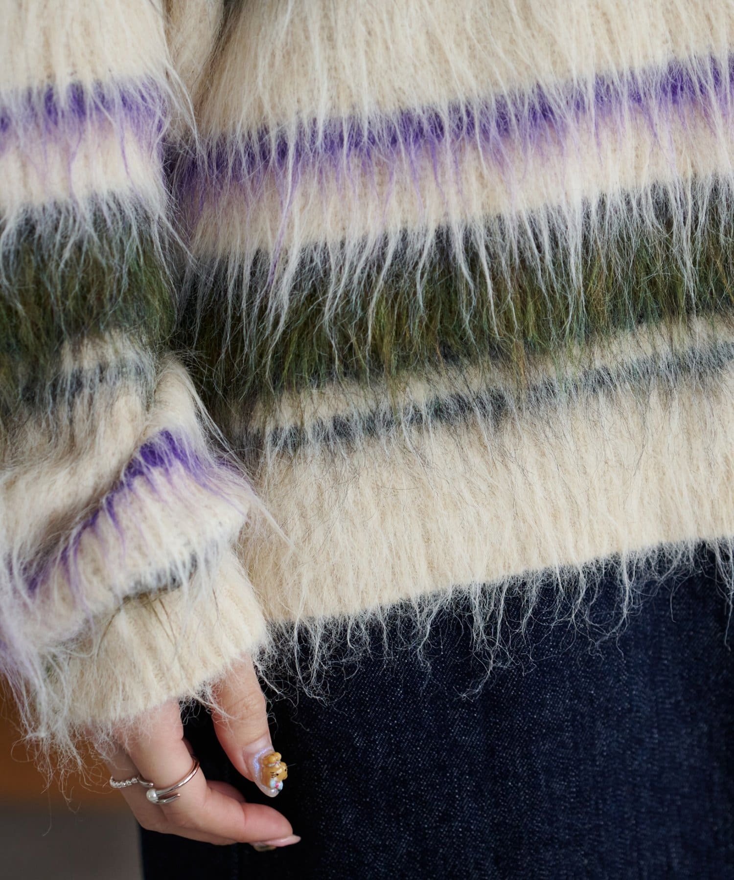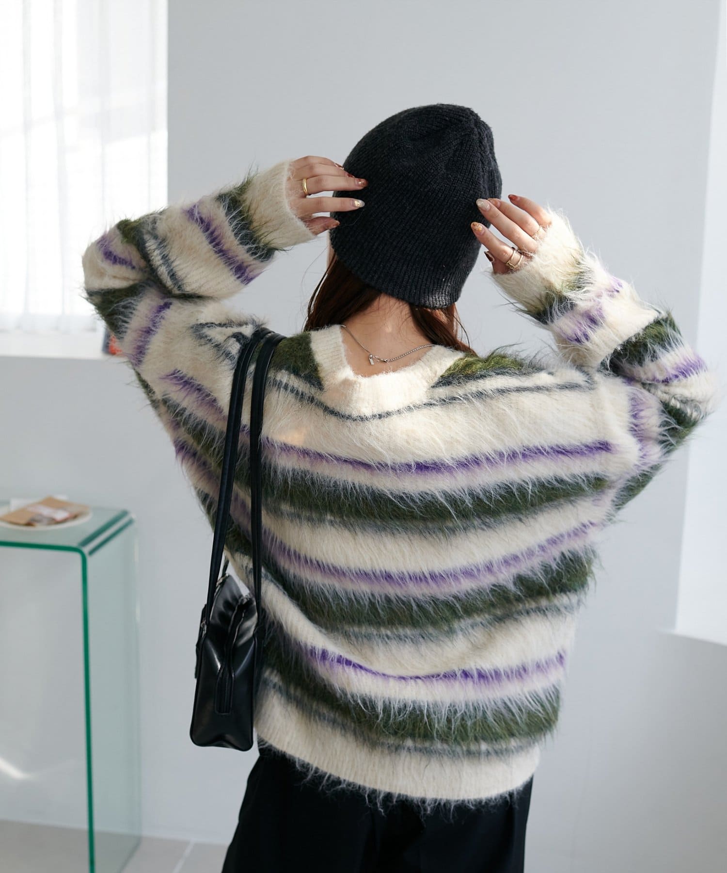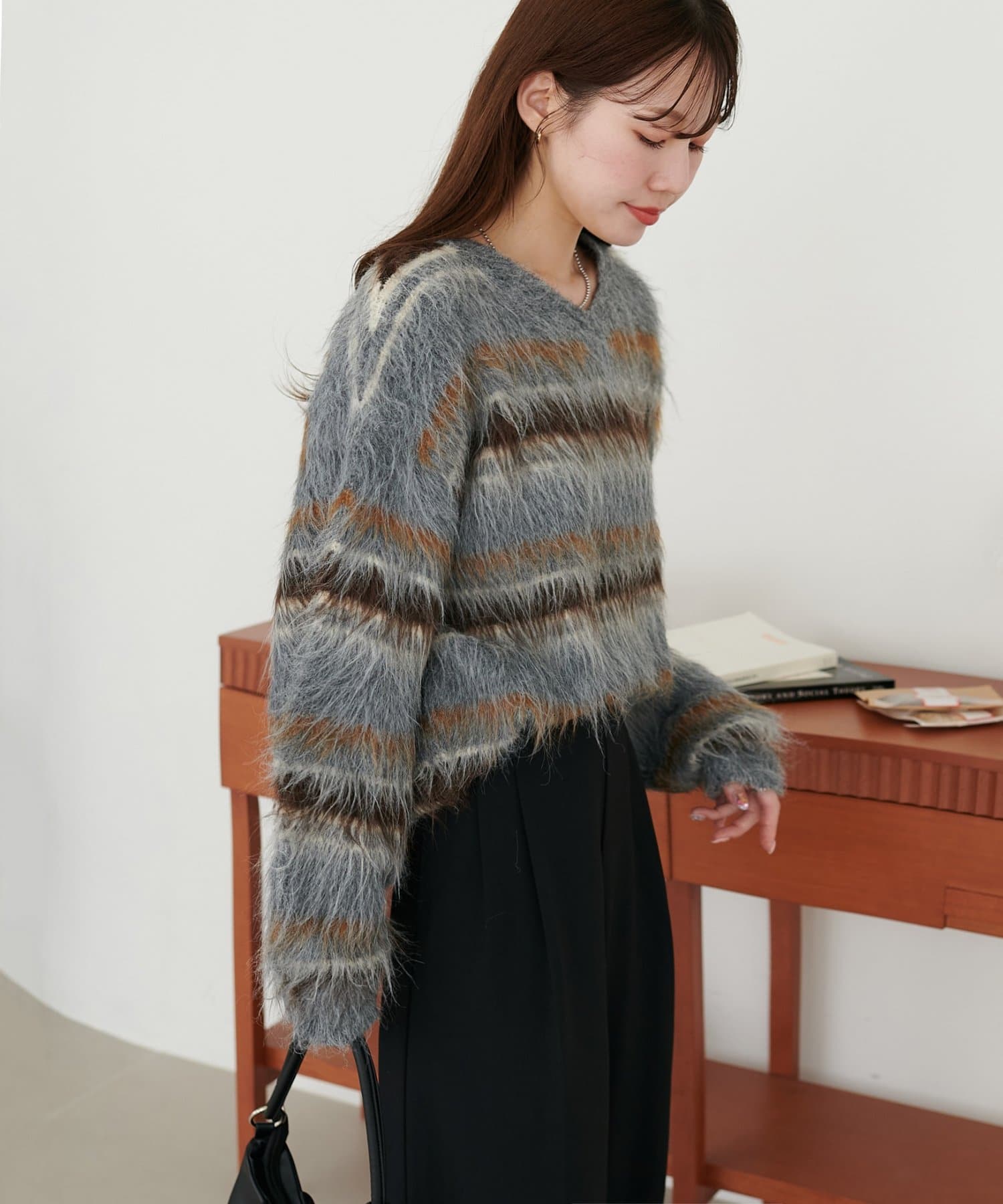 ふんわりとしたシャギー素材を使用した、マルチボーダー柄のVネックニット。