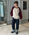 170cmメンズスタッフ:ゆったりとした着心地です。ラグランの配色デザインがポイントになるので、シンプルにデニム合わせやスラックス合わせでトップスを主役にしたコーデにしたいです。