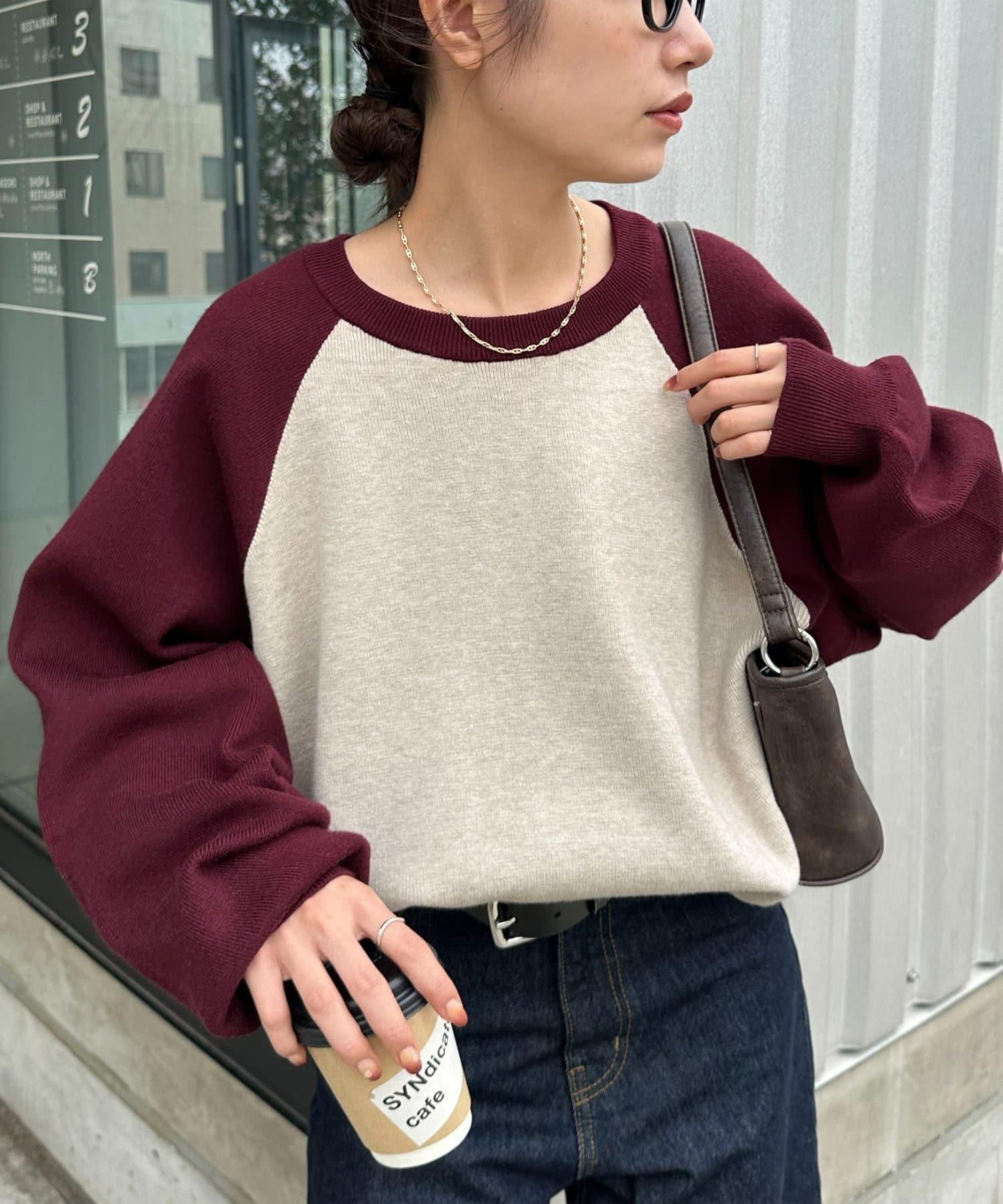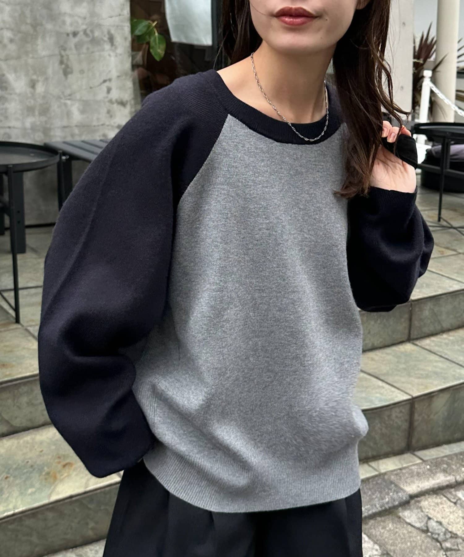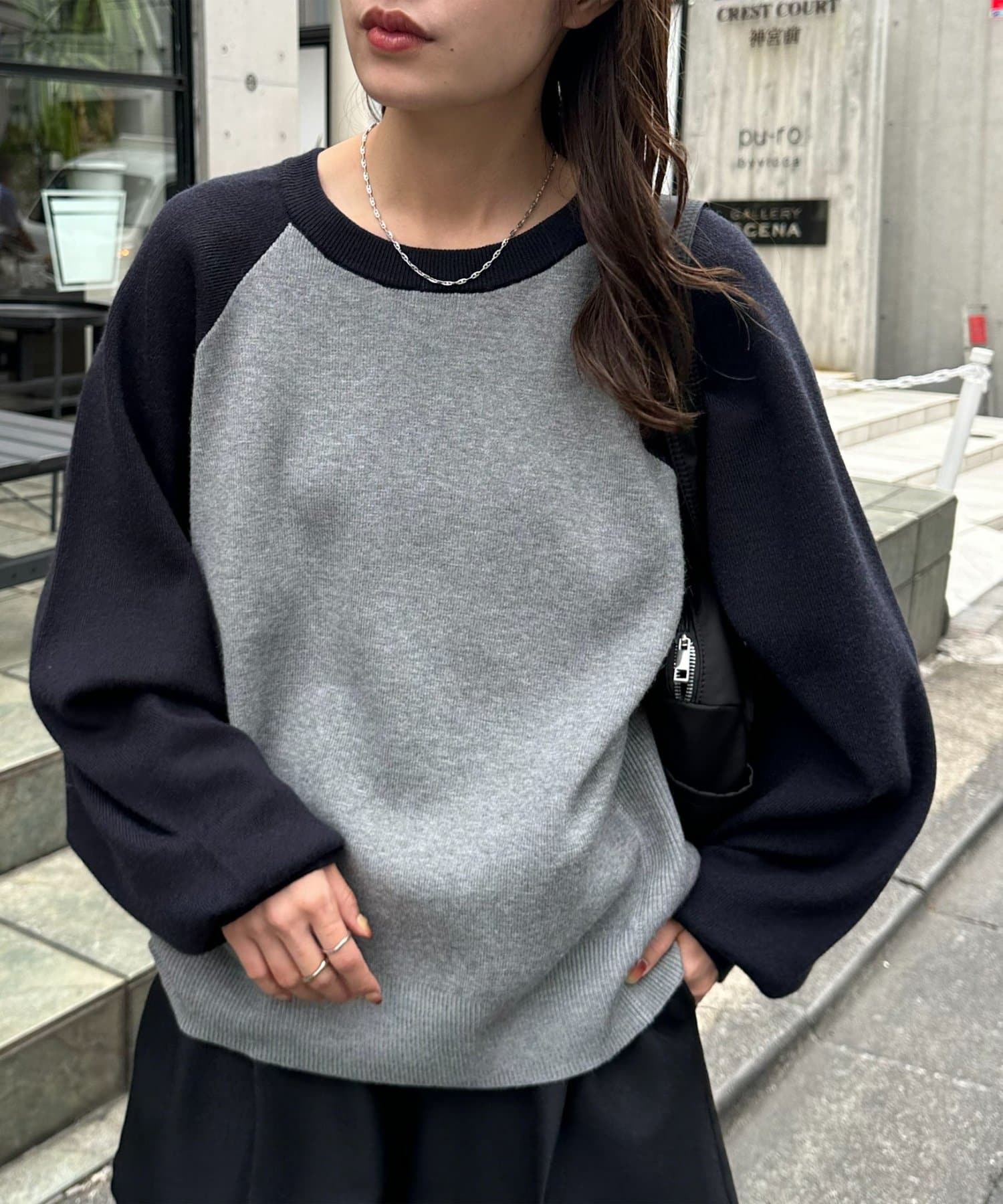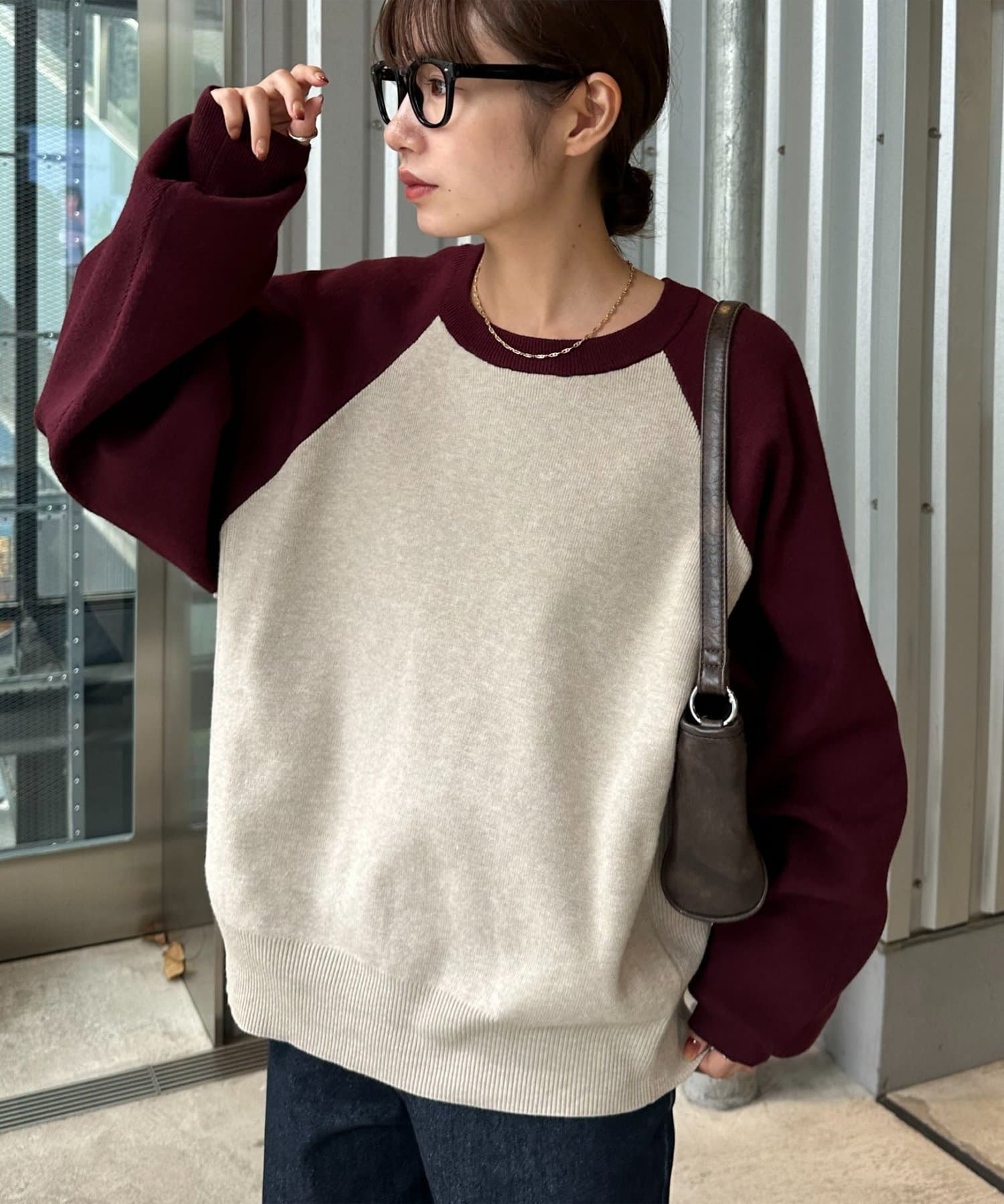 配色の切り替えが目を引く、ラグランスリーブデザインのニットプルオーバー。